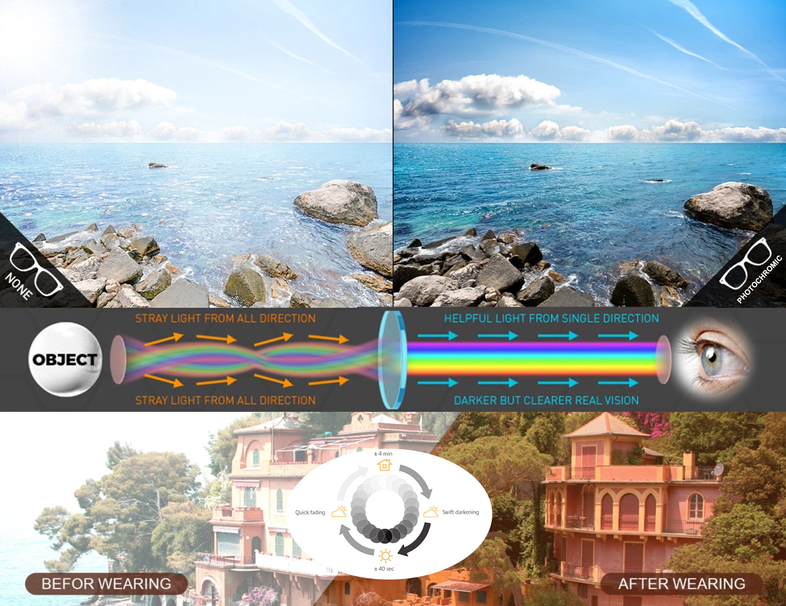 Photochromic lenses use photochromic compounds reacting to UV light for darkening, providing UV protection. They return to a clear state indoors. Compared with mass photochromic, our spin coating technology can greatly reduce the time it takes for you to change color and fade, giving you a better visual experience.