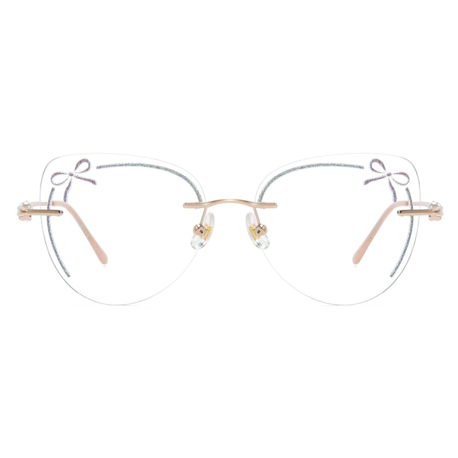 | Exlusive Design | Bowknot Cat-Eye Rimless Glasses – Sweet and charming, this adorable pair features a playful cat-eye shape with a delicate bowknot embellishment on the lens, adding a touch of whimsical cuteness. The rimless design keeps the look light and airy, while the metal temples are finished with soft, girlish details that make them extra lovable. Perfect for those who adore feminine, youthful style.