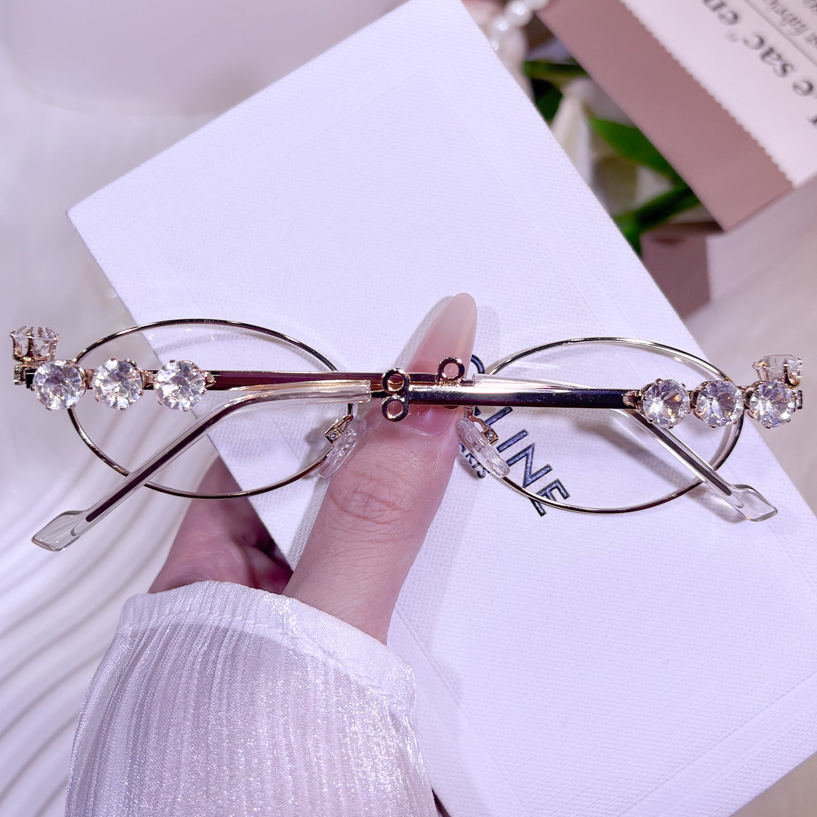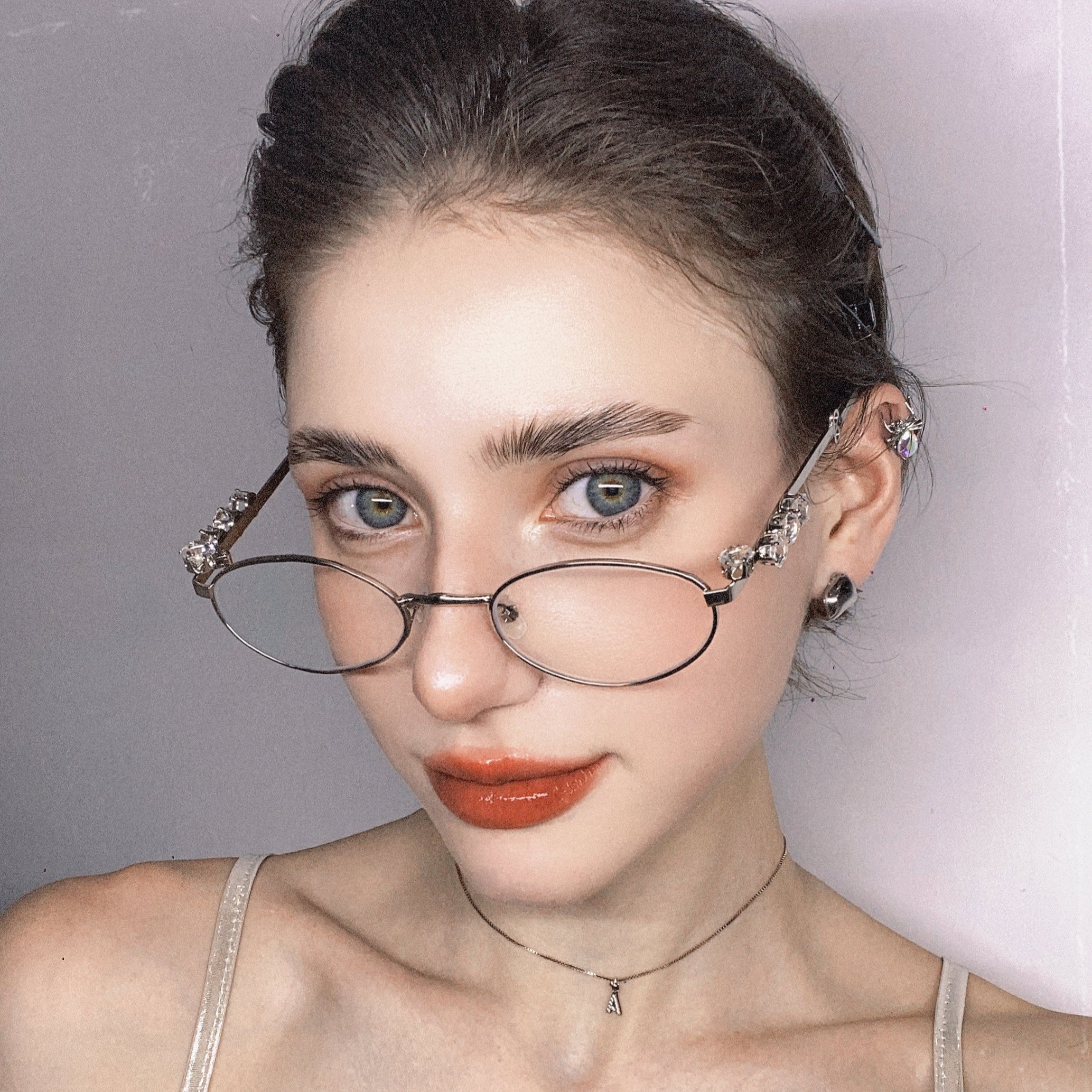 Step into the spotlight with these Y2K-inspired oval metal frames, sparkling with dazzling rhinestones that capture vintage glam. Perfectly feminine and irresistibly chic, they add a radiant shine to any outfit. Bold, stylish, and undeniably eye-catching—these frames are made for those who love to shine.