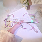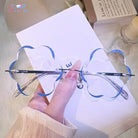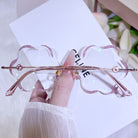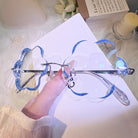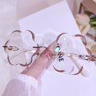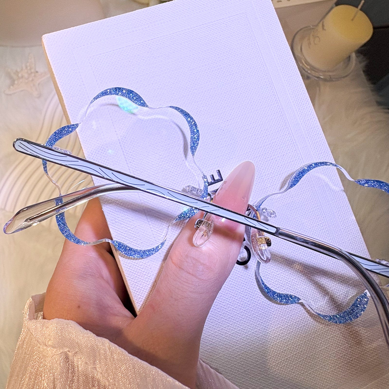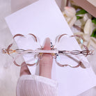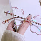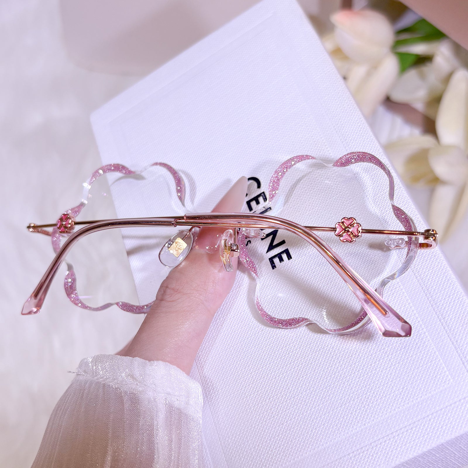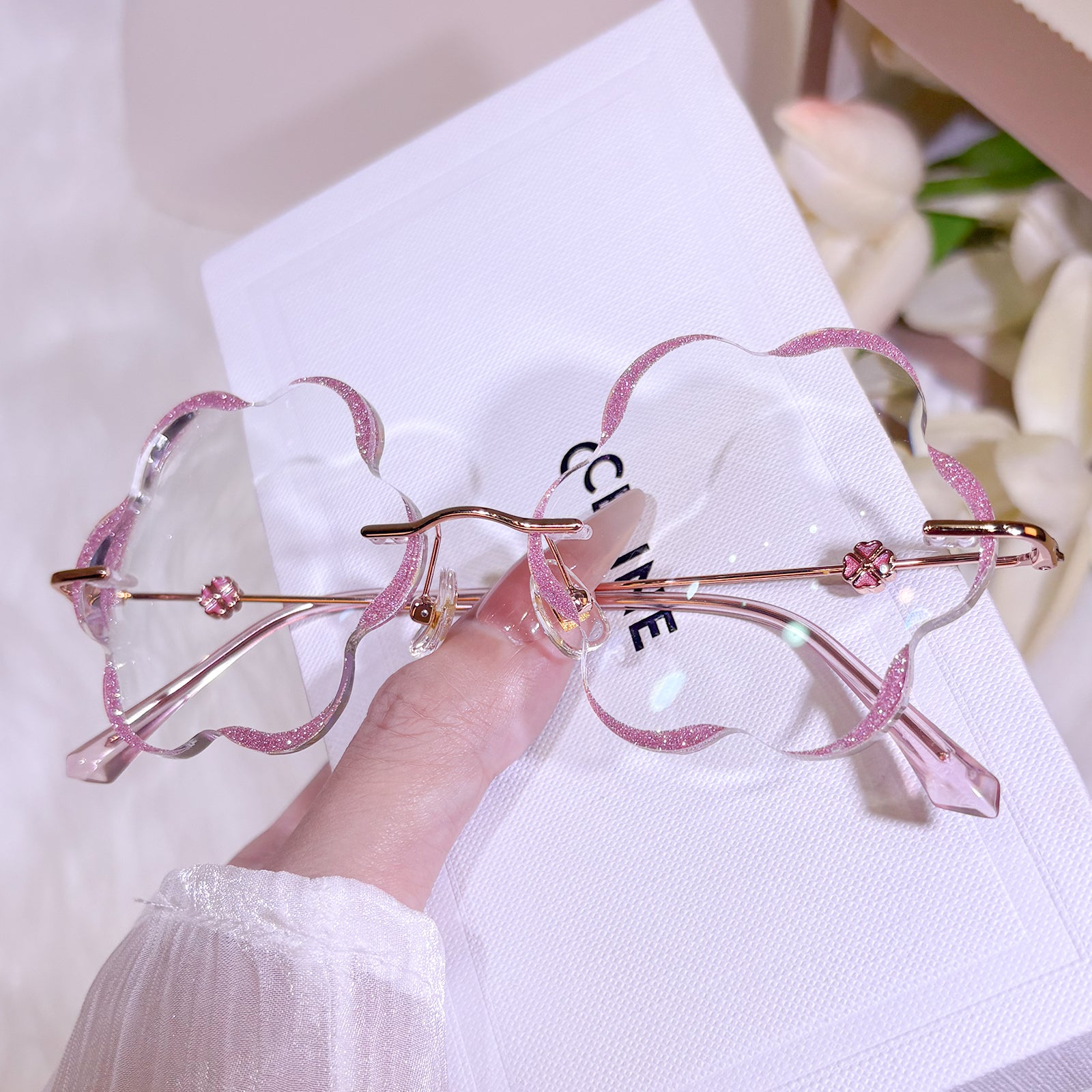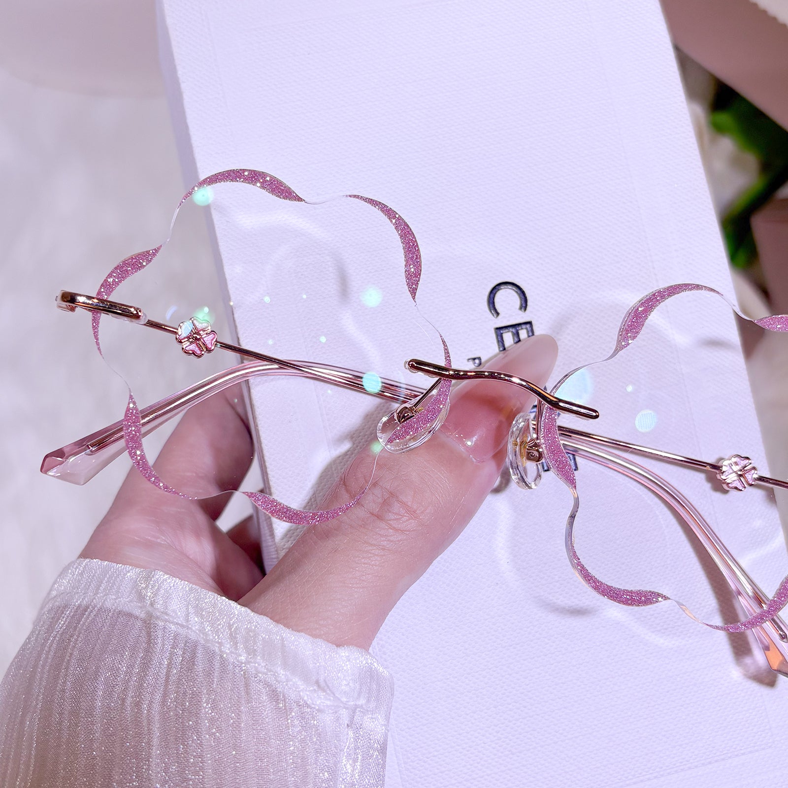 | Exlusive Design | This feminine rimless eyeglass design features dreamy petal-shaped lenses, delicately outlined with shimmering gold glitter for an enchanting sparkle. The metal temples are adorned with charming little flower accents, adding a sweet and whimsical touch. Light, elegant, and full of personality — perfect for those who love a playful yet graceful statement.