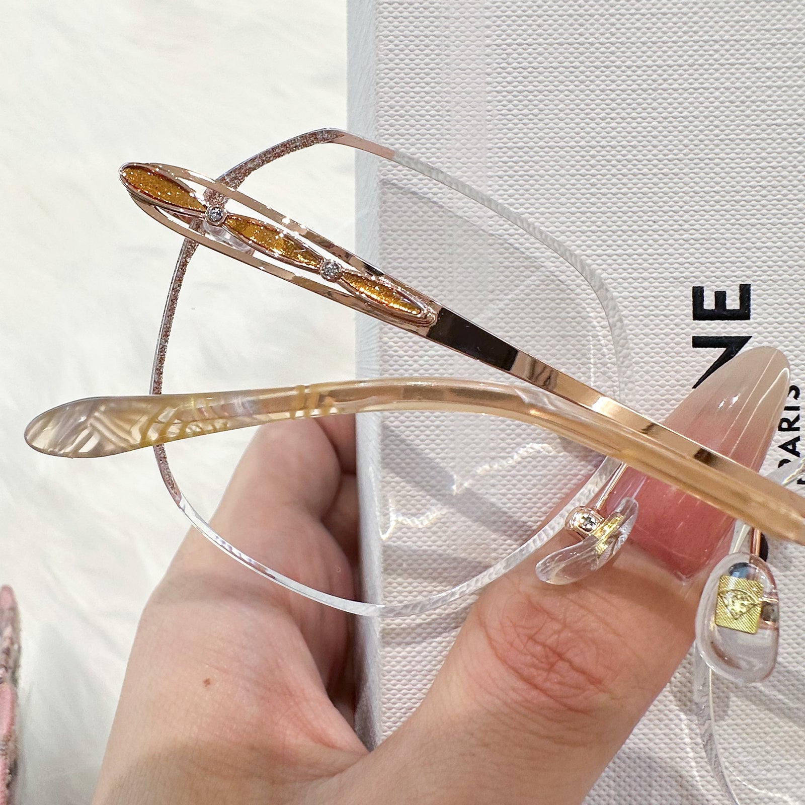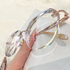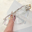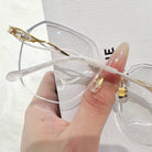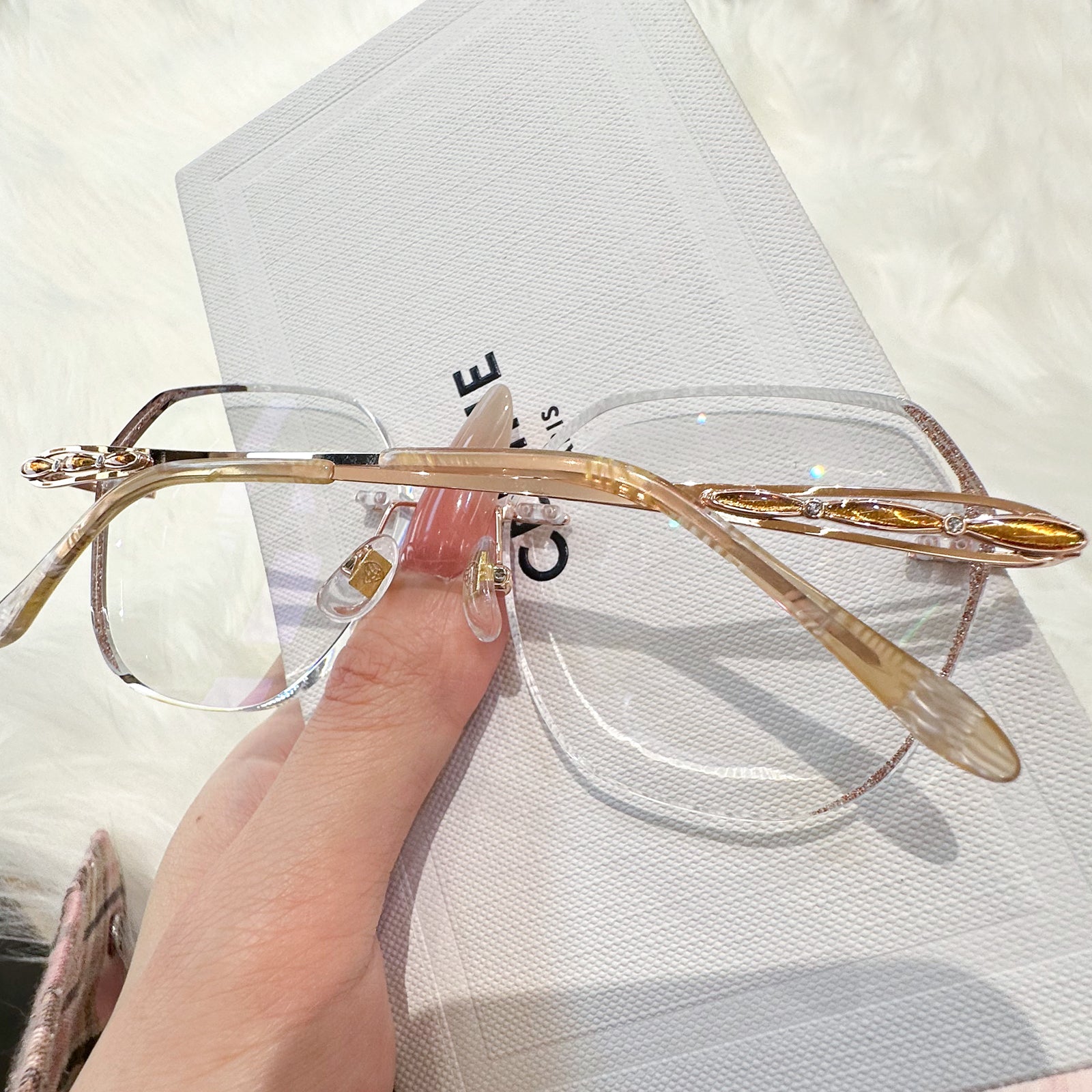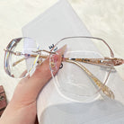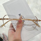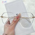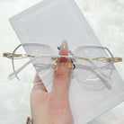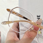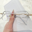 | Exclusive Design |Glitter-Edged Square Rimless Glasses – a stylish fusion of sophistication and shine. Featuring clean geometric lenses accented with subtle sparkle along the edges, these glasses are paired with slim metal temples detailed with elegant, graceful embellishments. Lightweight and refined, they're perfect for adding a touch of charm to any outfit.