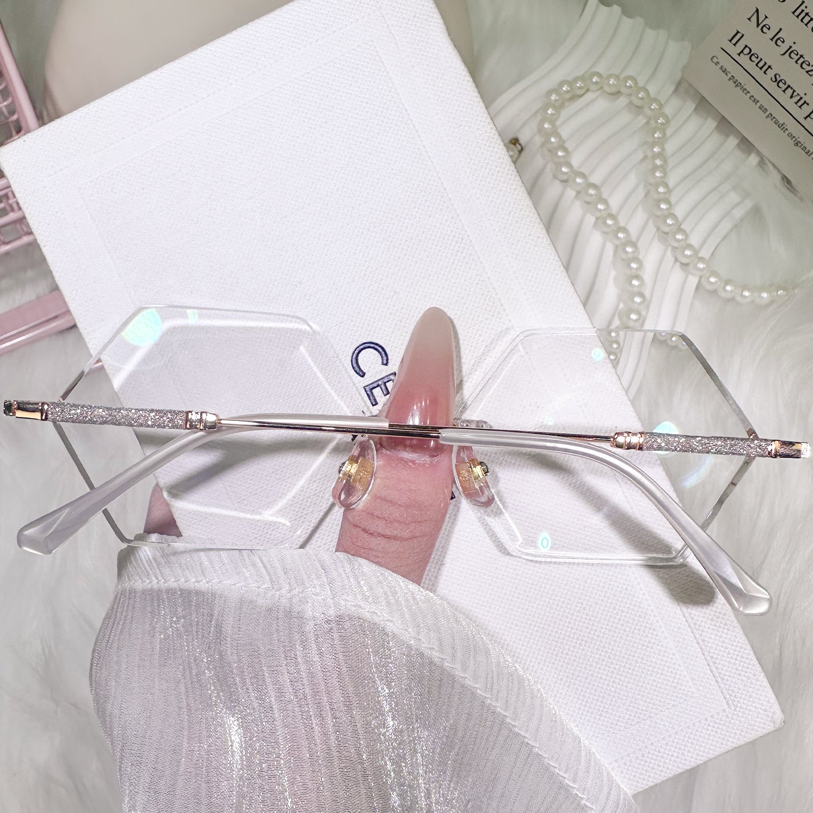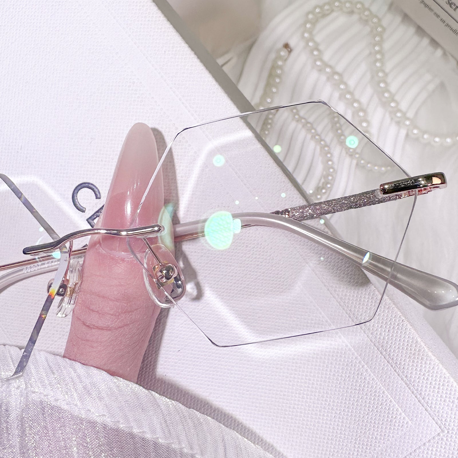 | Exclusive Design | These rimless hexagon-shaped glasses strike the perfect balance between classic elegance and modern glamour. The uniquely contoured lenses offer a refined geometric look, while the temples are adorned with sparkling diamond-like accents, adding a touch of brilliance and luxury to every angle.