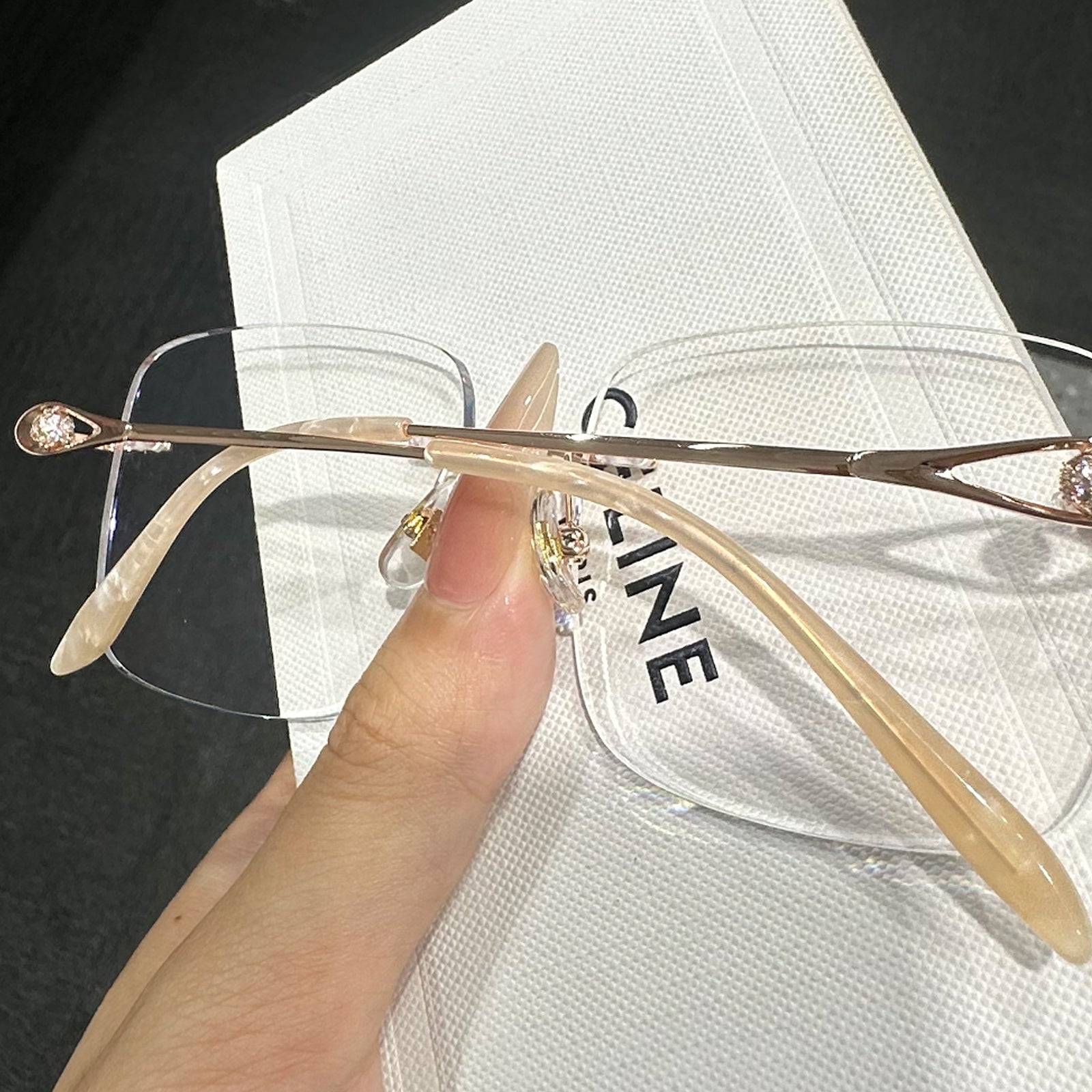 Jeder Tempel verfügt über einen brillanten Diamanten, der in der Mitte der Blende eingebettet ist und einen Hauch von Glanz und Luxus verleiht. Der Schwanz der Tempel, der an reine weiße Jade erinnert, strahlt ein Gefühl von Klarheit und Eleganz aus.
