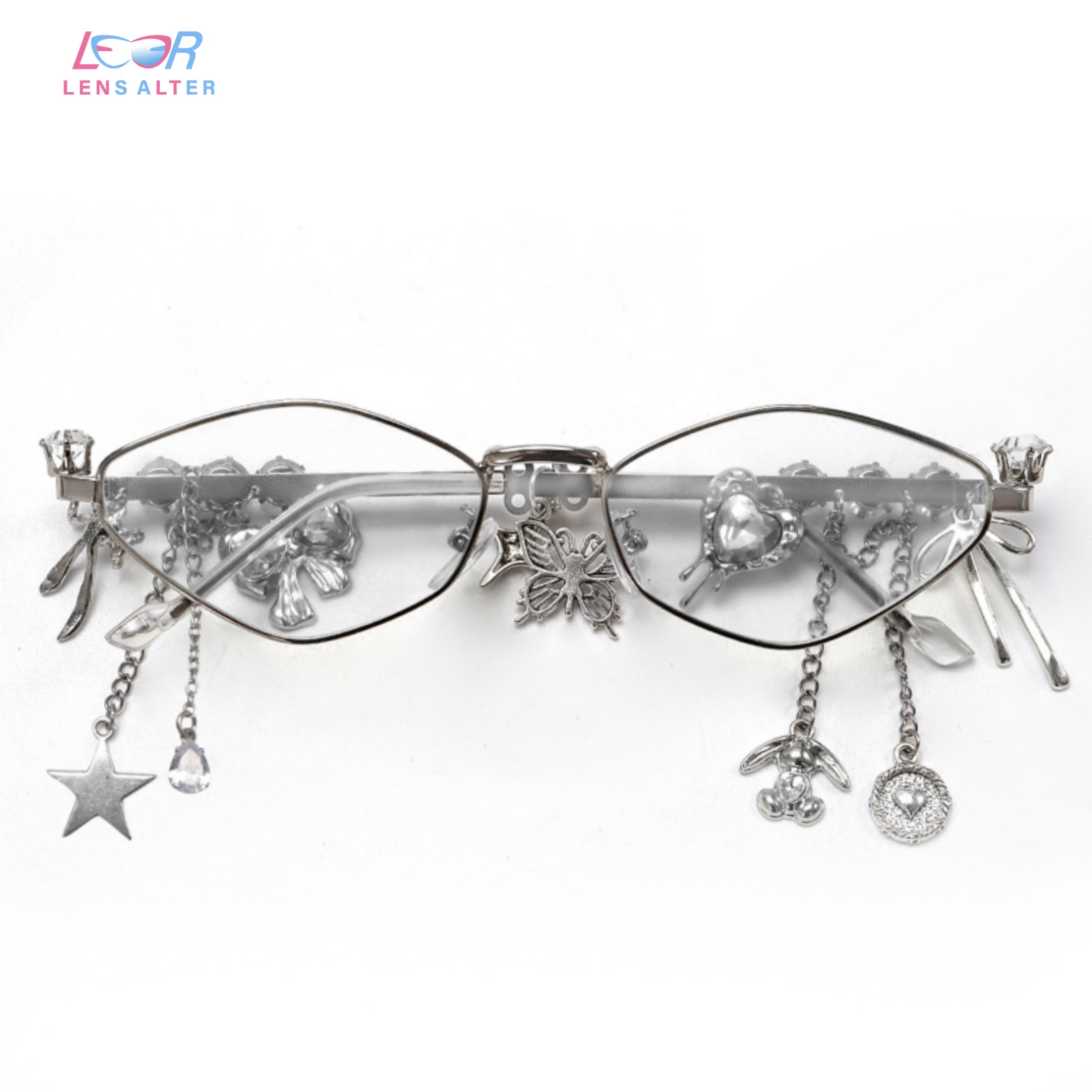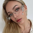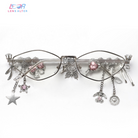 These silver-framed rhombus glasses are a striking statement piece, featuring sparkling gems, butterflies, stars, and delicate dangling charms. The angular shape adds a modern edge, while the charming decorations create a dreamy, elegant vibe—perfect for fashion lovers who want to stand out with bold, whimsical flair.