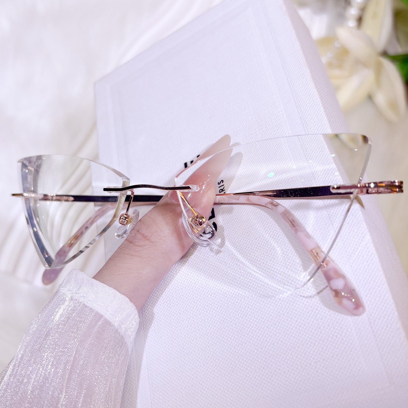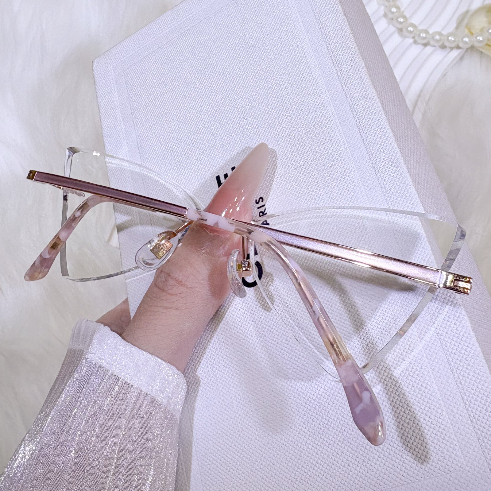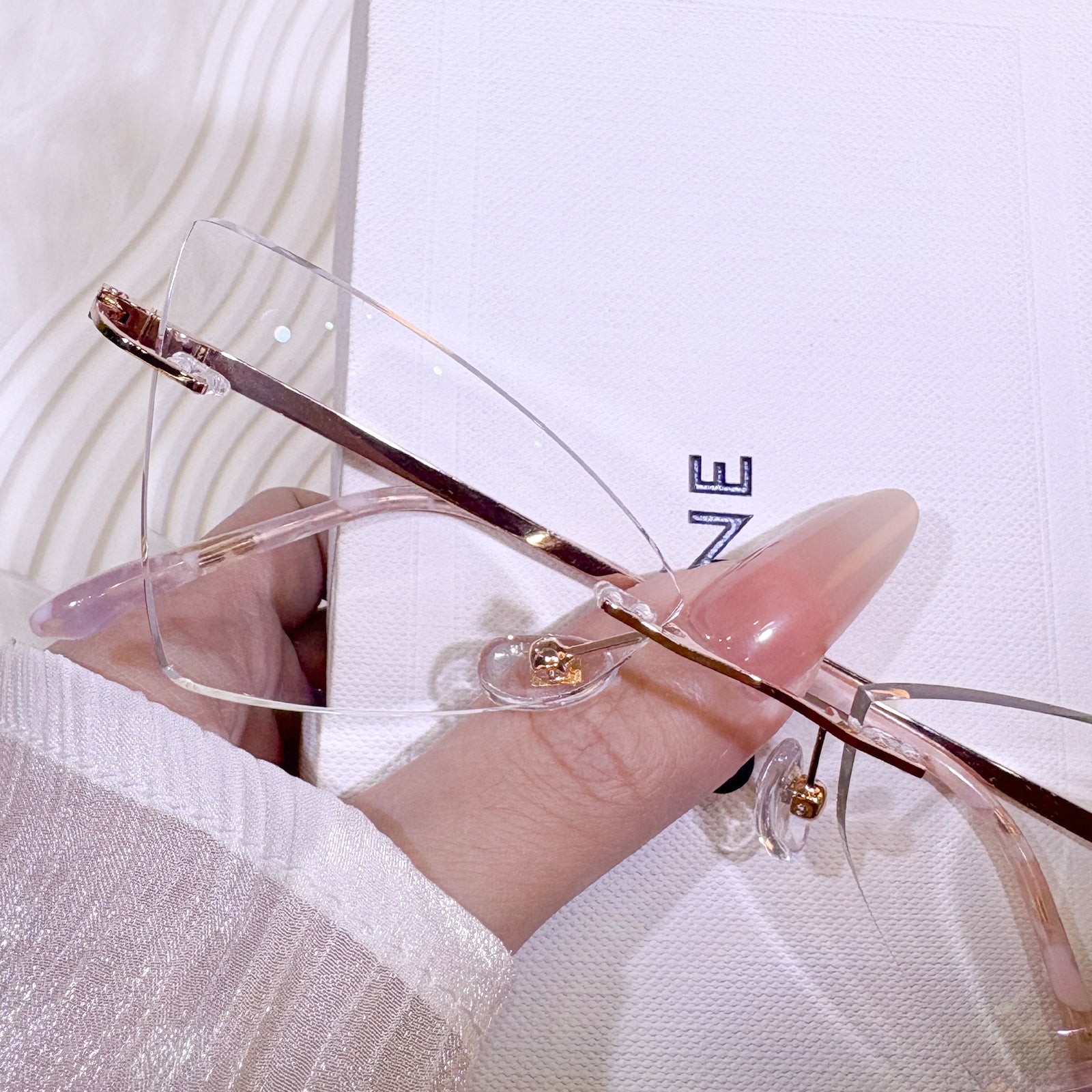 | Exclusive Design | These rimless glasses feature an asymmetrical slanted triangle shape, making them a true standout with an avant-garde flair. The uniquely structured lenses are paired with ornate, polished temples that add a luxurious and fashionable finish—perfect for trendsetters who embrace bold, artistic design.