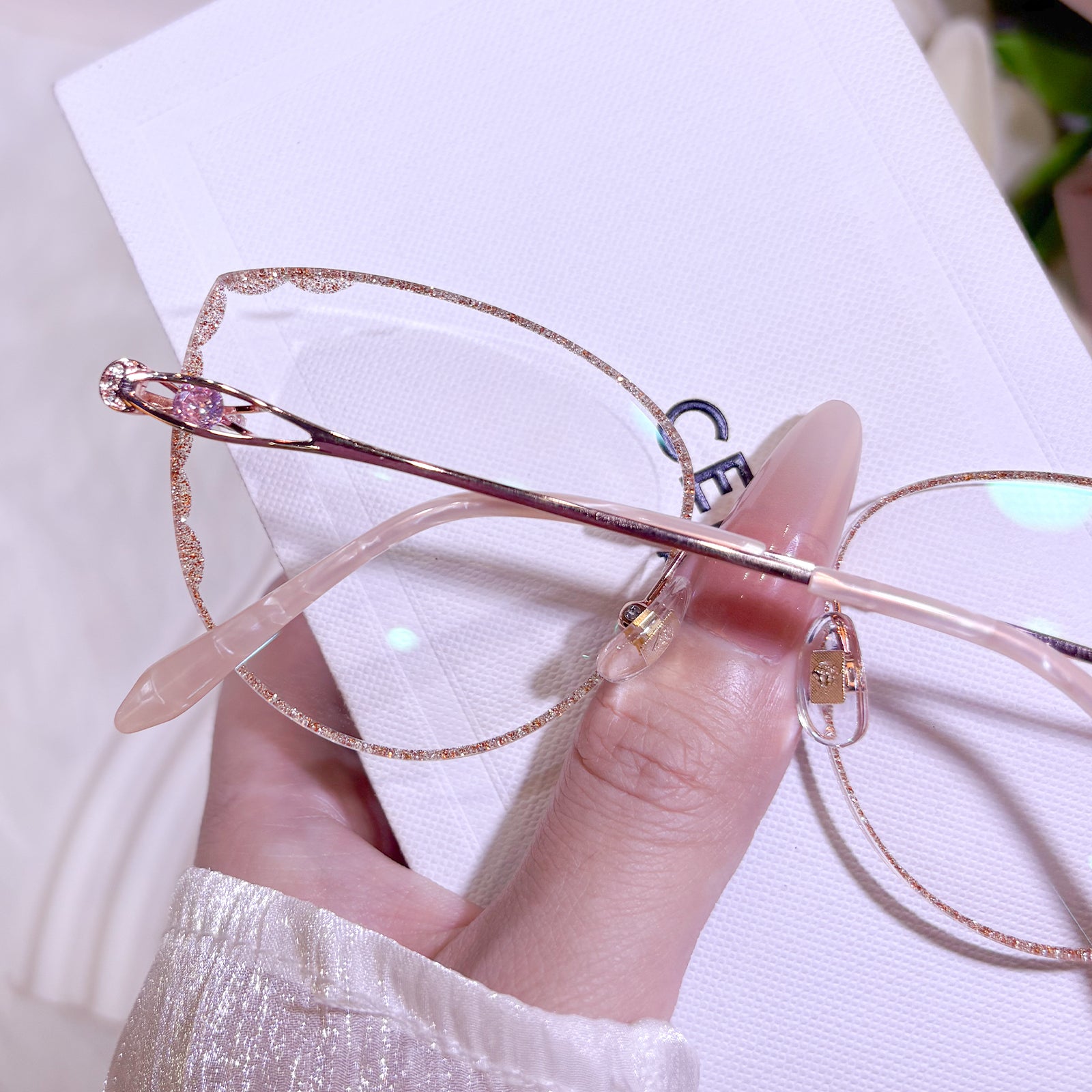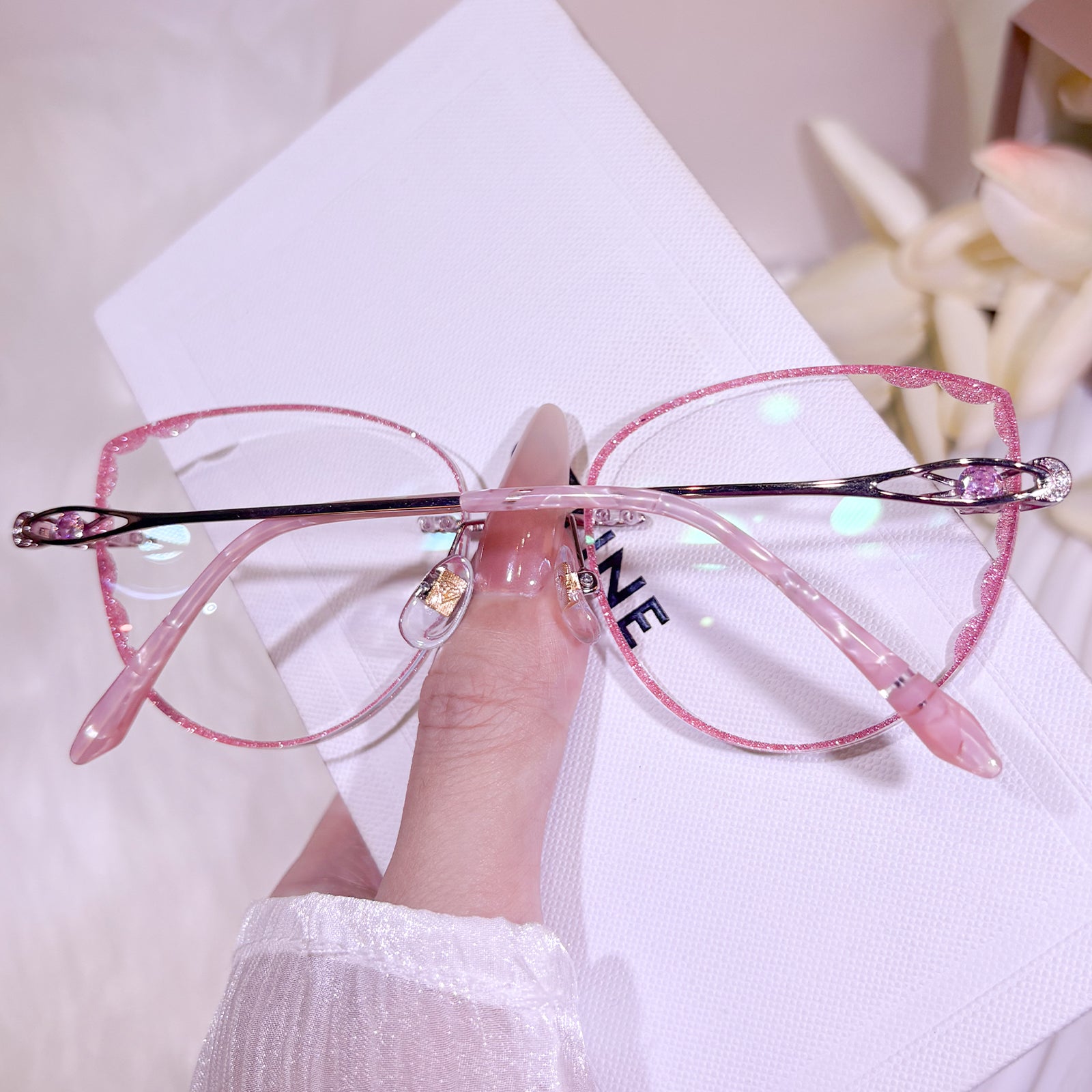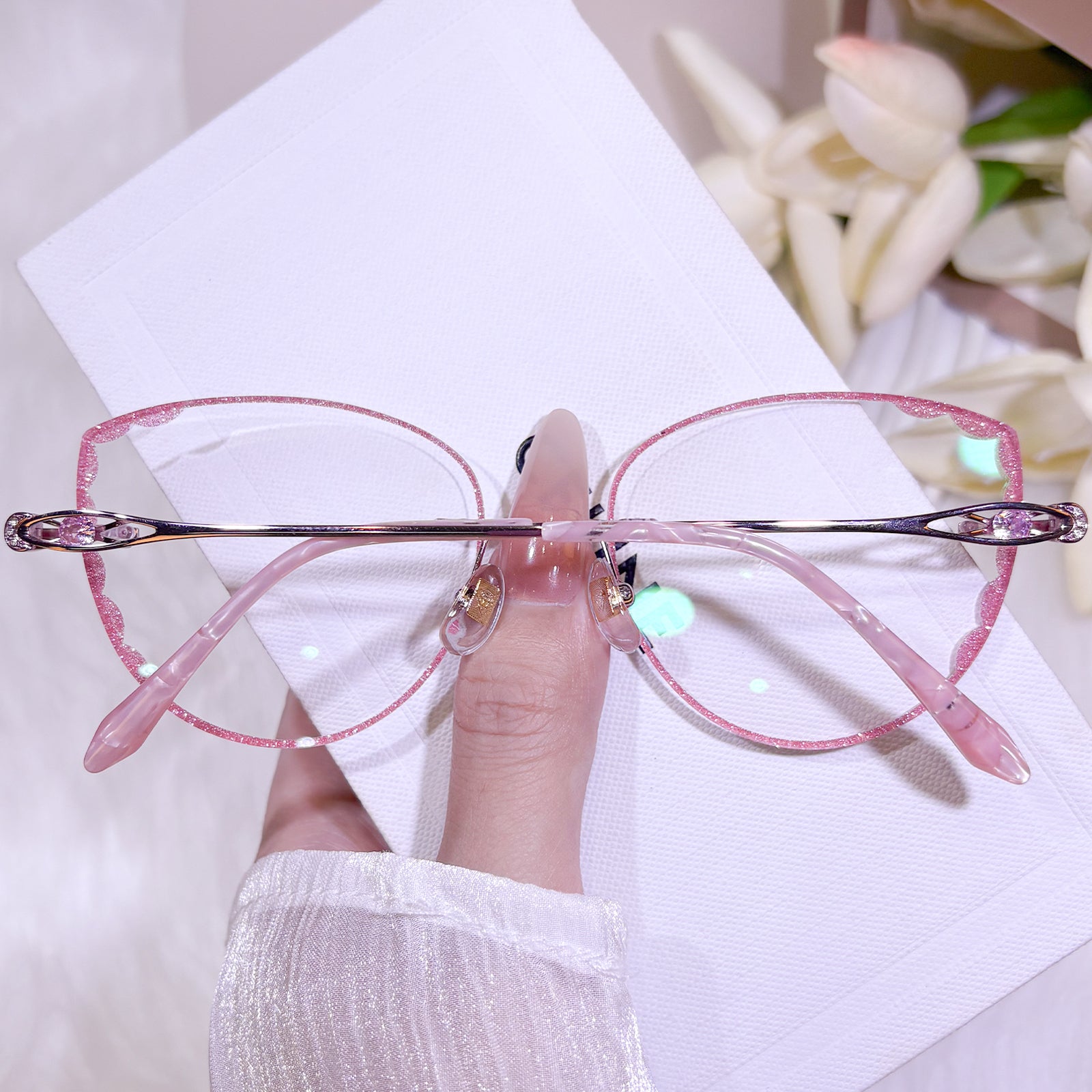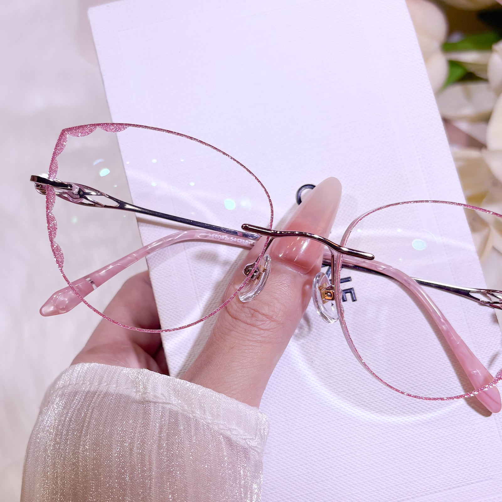 Cat-Eye Rimless Glasses for Women–sparkling lenses with heart-shaped temples, add a touch of charm with these adorable cat-eye rimless glasses. The lenses are adorned with shimmering glitter, while the heart-shaped details on the temples bring a playful, sweet vibe.