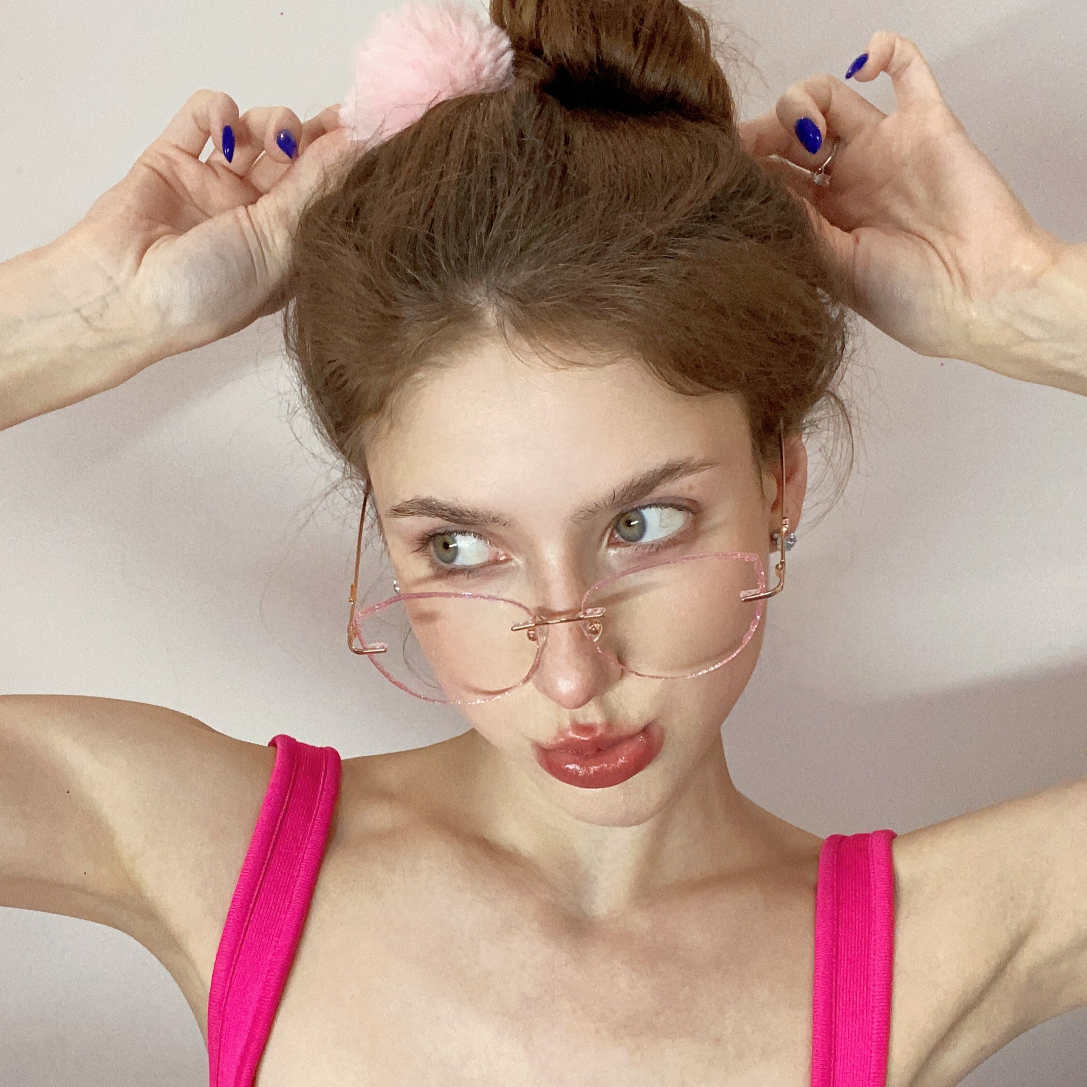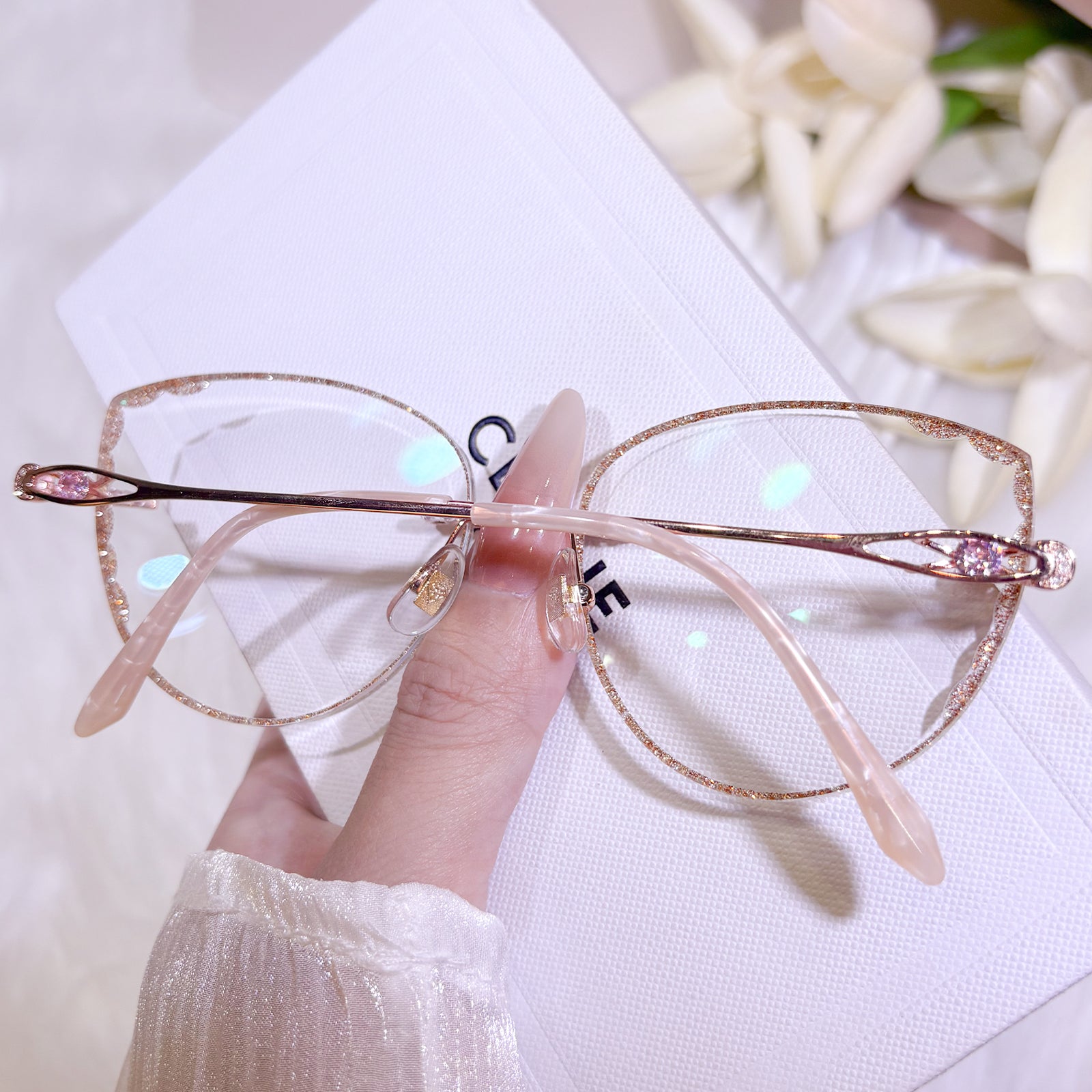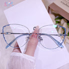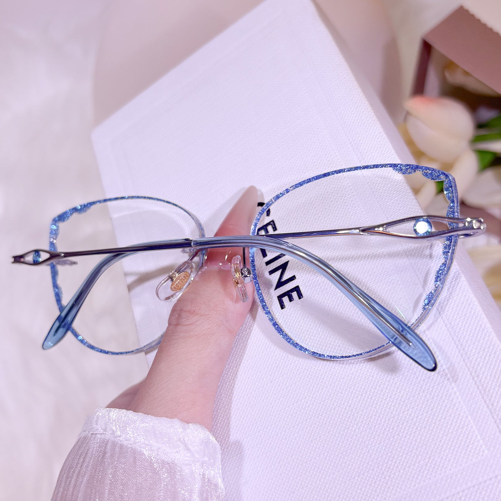 Cat-Eye Rimless Glasses for Women–sparkling lenses with heart-shaped temples, add a touch of charm with these adorable cat-eye rimless glasses. The lenses are adorned with shimmering glitter, while the heart-shaped details on the temples bring a playful, sweet vibe.