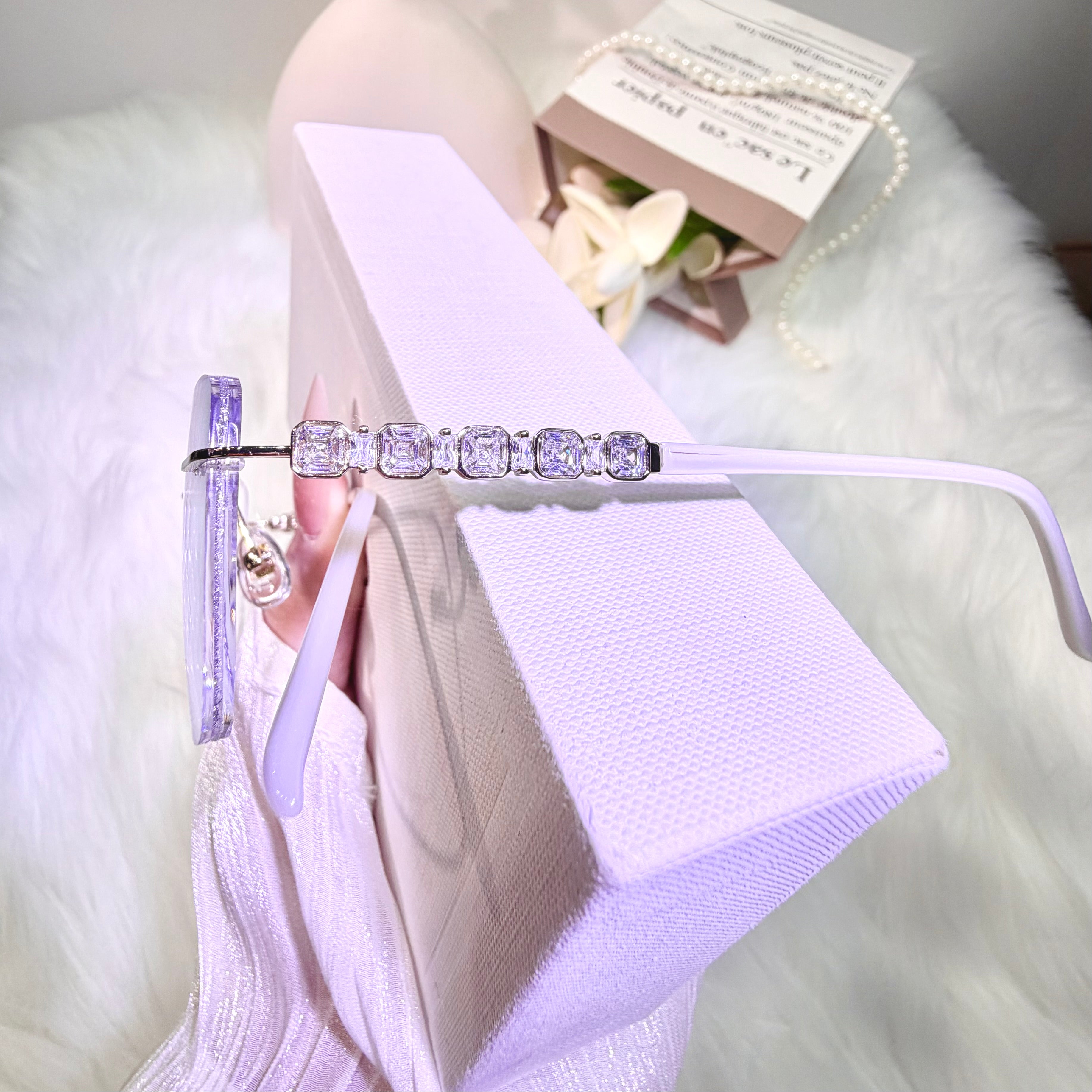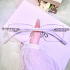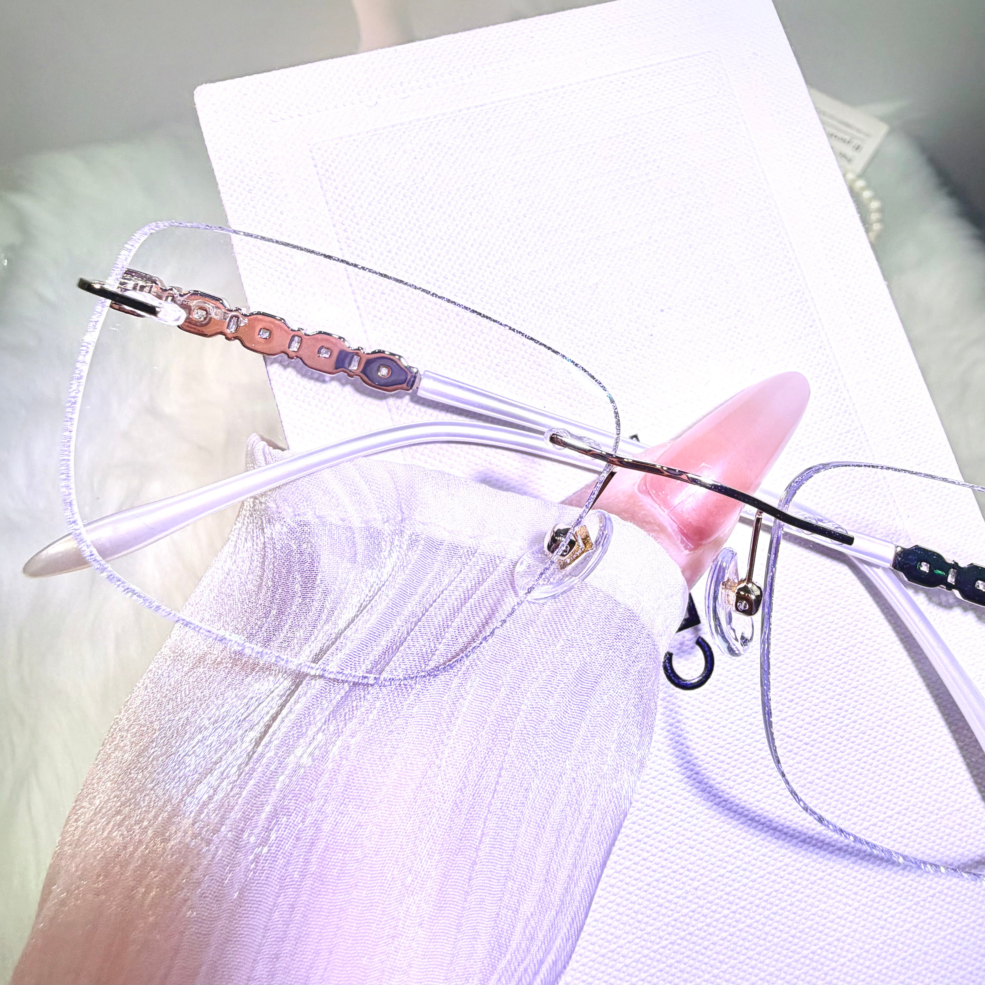 These stunning rimless glasses shine with silver glitter along the rectangular lens edges, creating a bright, eye-catching look. Paired with a sleek metal frame, they’re beautifully glamorous and effortlessly stylish.