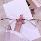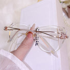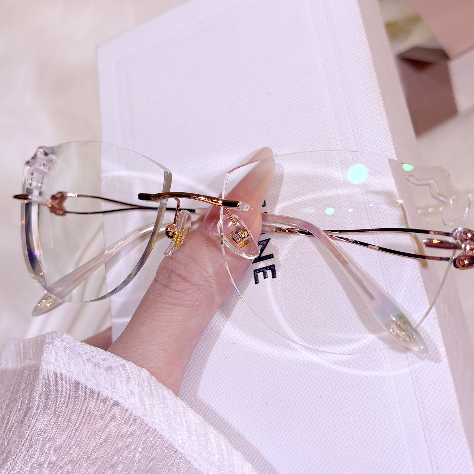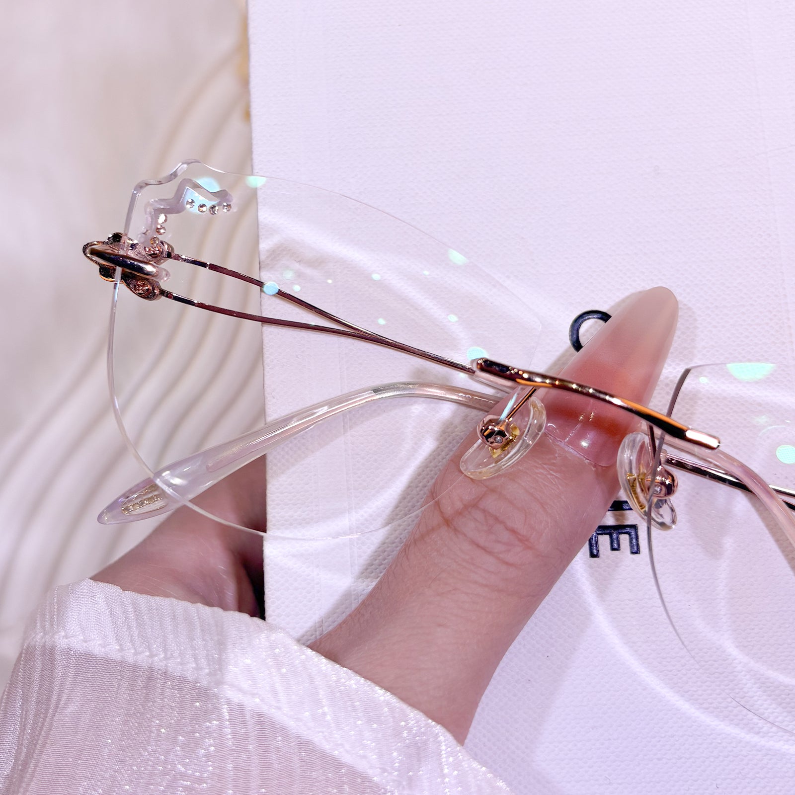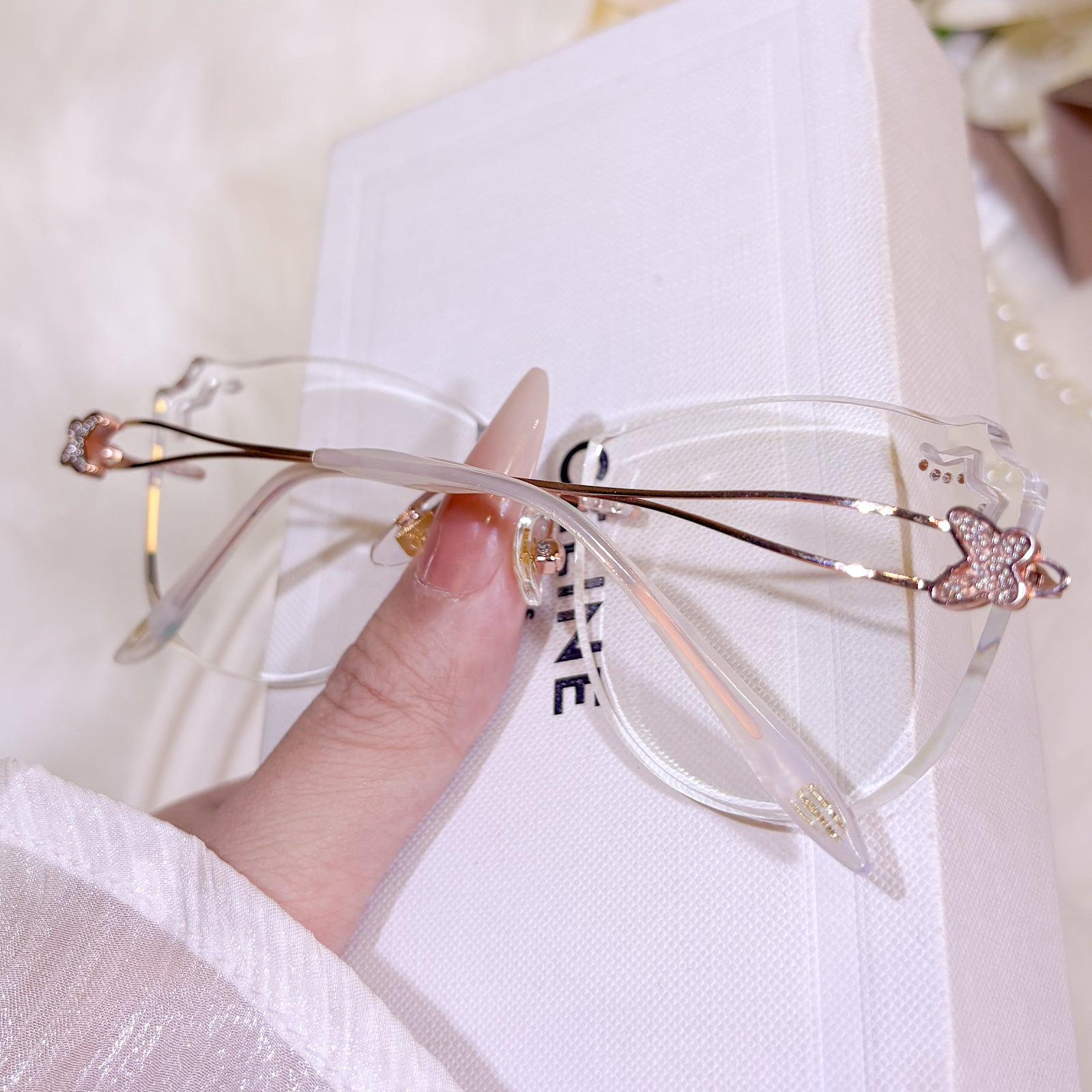 | Exclusive Design | These stunning rimless glasses feature artistic cut-out details on the lenses, delicately accented with sparkling diamonds for a luxurious glow. Butterfly embellishments on the temples add a fairy-like charm, creating an ethereal, graceful look that feels straight out of a dream. Perfect for those who love elegance with a touch of magic.