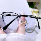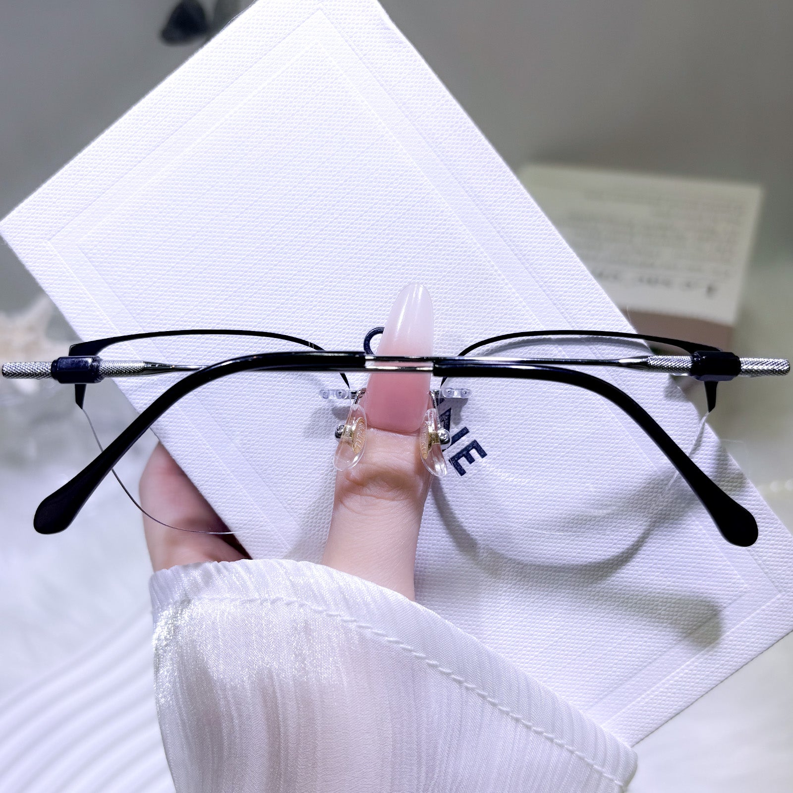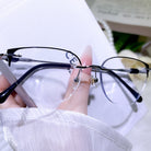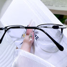 This black-and-silver rimless eyewear boasts an effortlessly sleek and modern design. The minimalist silhouette keeps it clean and sophisticated, while the classic two-tone finish adds a subtle stylish touch. Lightweight and comfortable, perfect for elevating any daily look with simple, understated charm.
