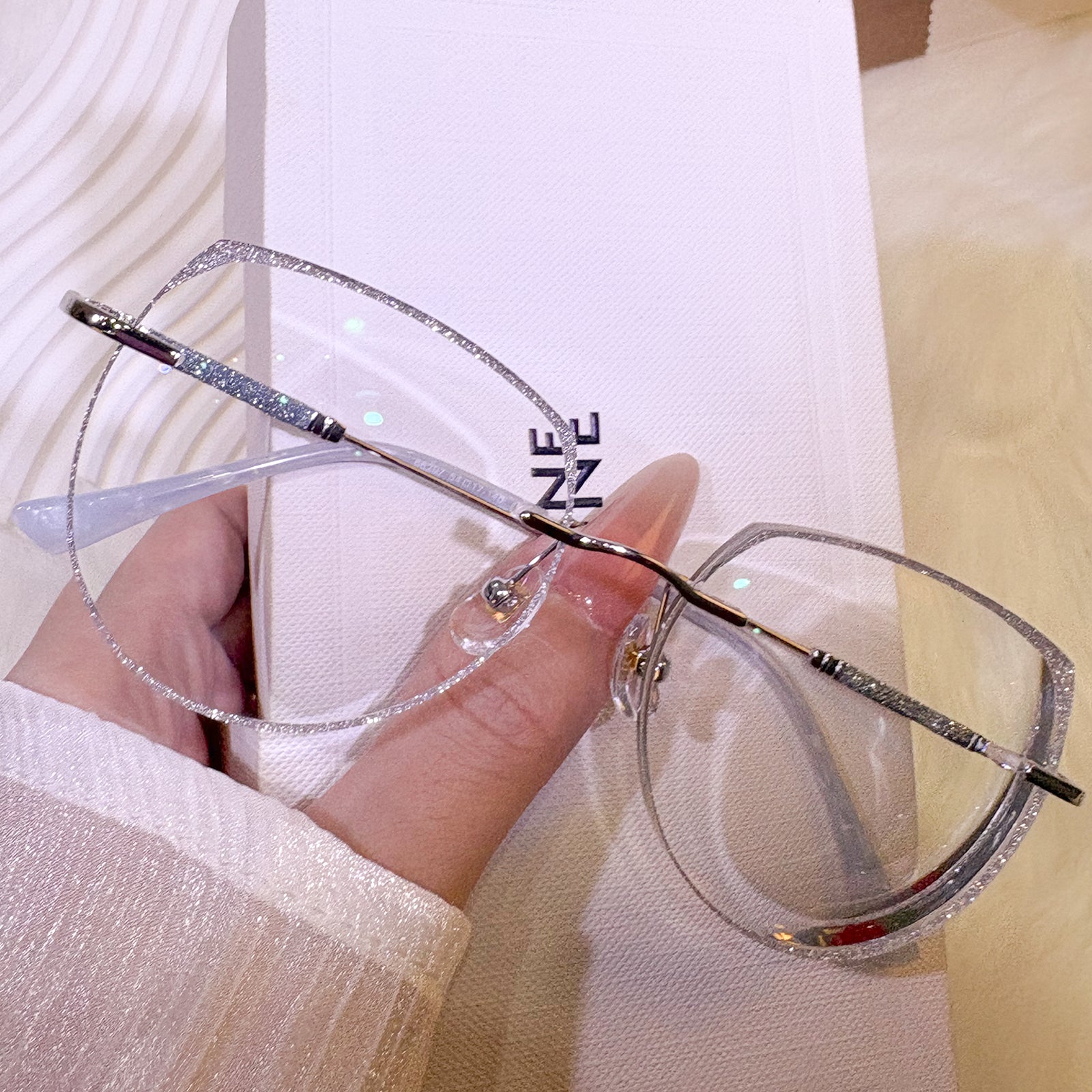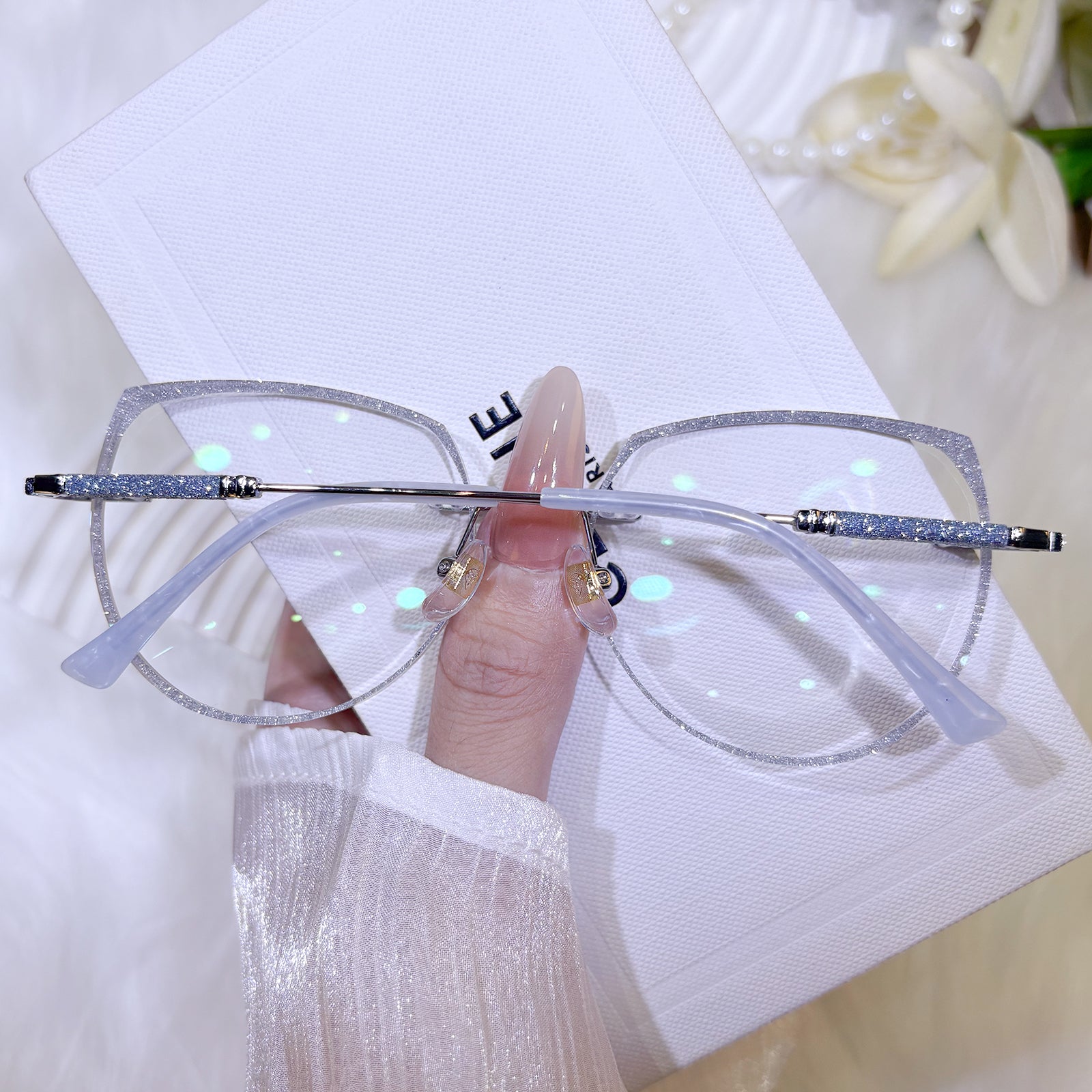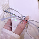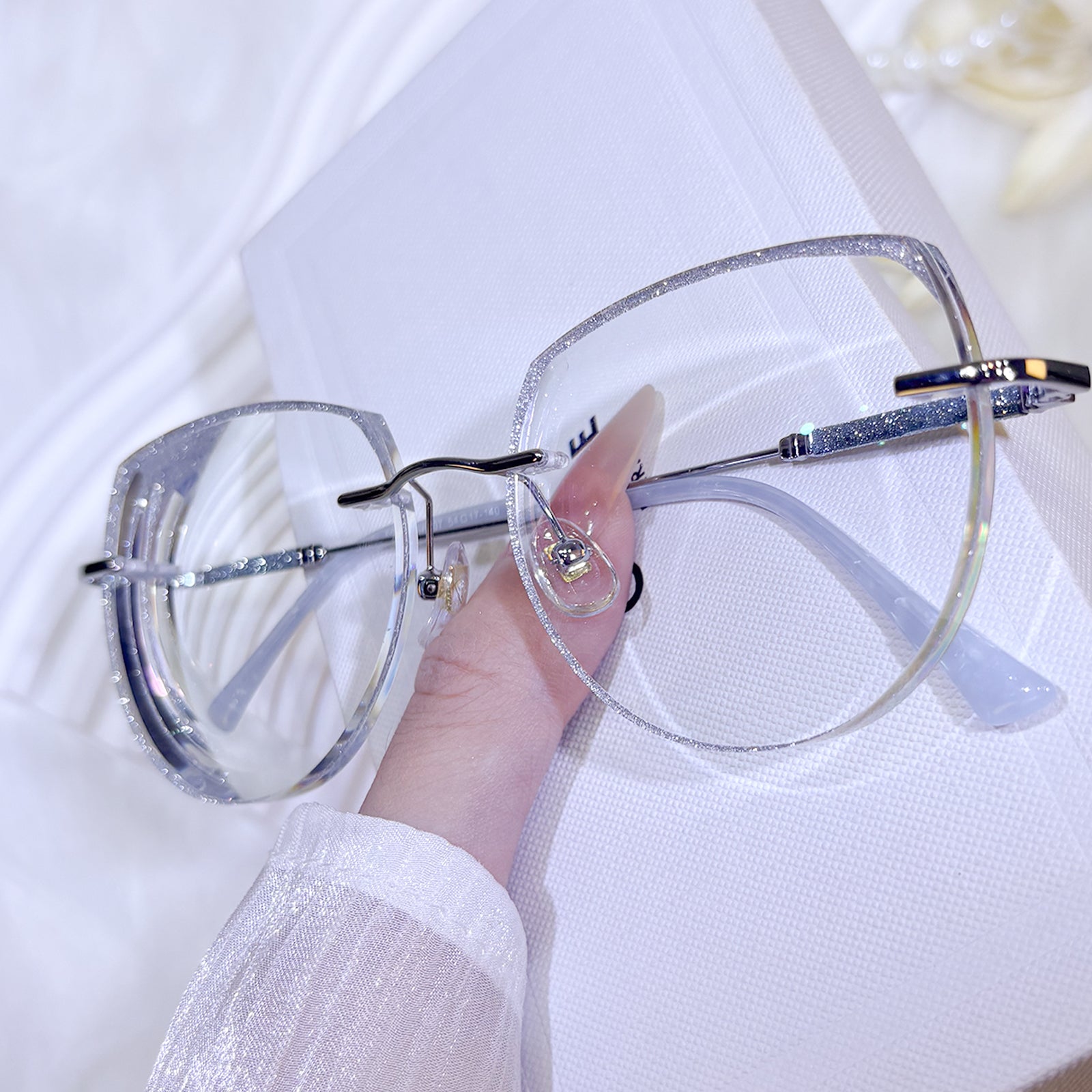 | Exclusive Design | These uniquely shaped rimless glasses feature an imaginative, avant-garde silhouette that instantly stands out. The lenses are dusted with fine glitter for a shimmering effect, while the delicately crafted temples add an extra touch of elegance and individuality. Perfect for fashion lovers who crave bold, artistic flair.