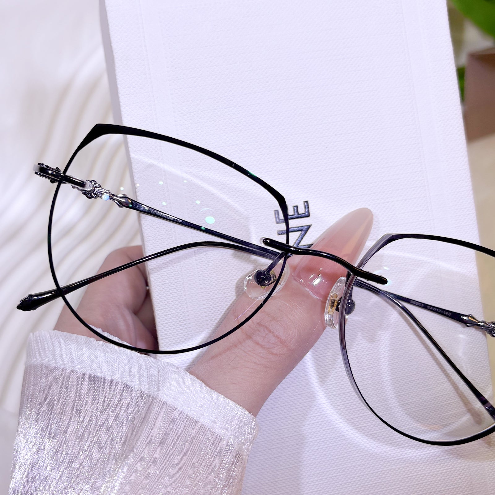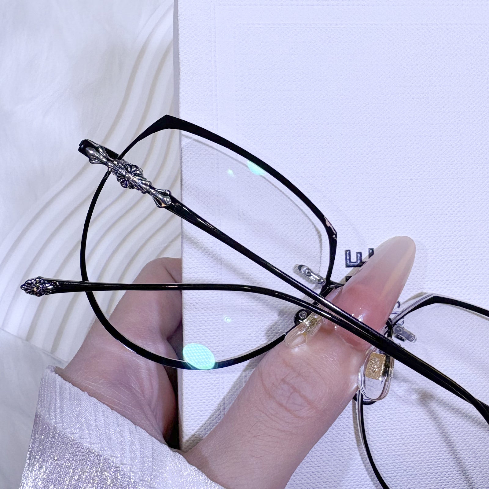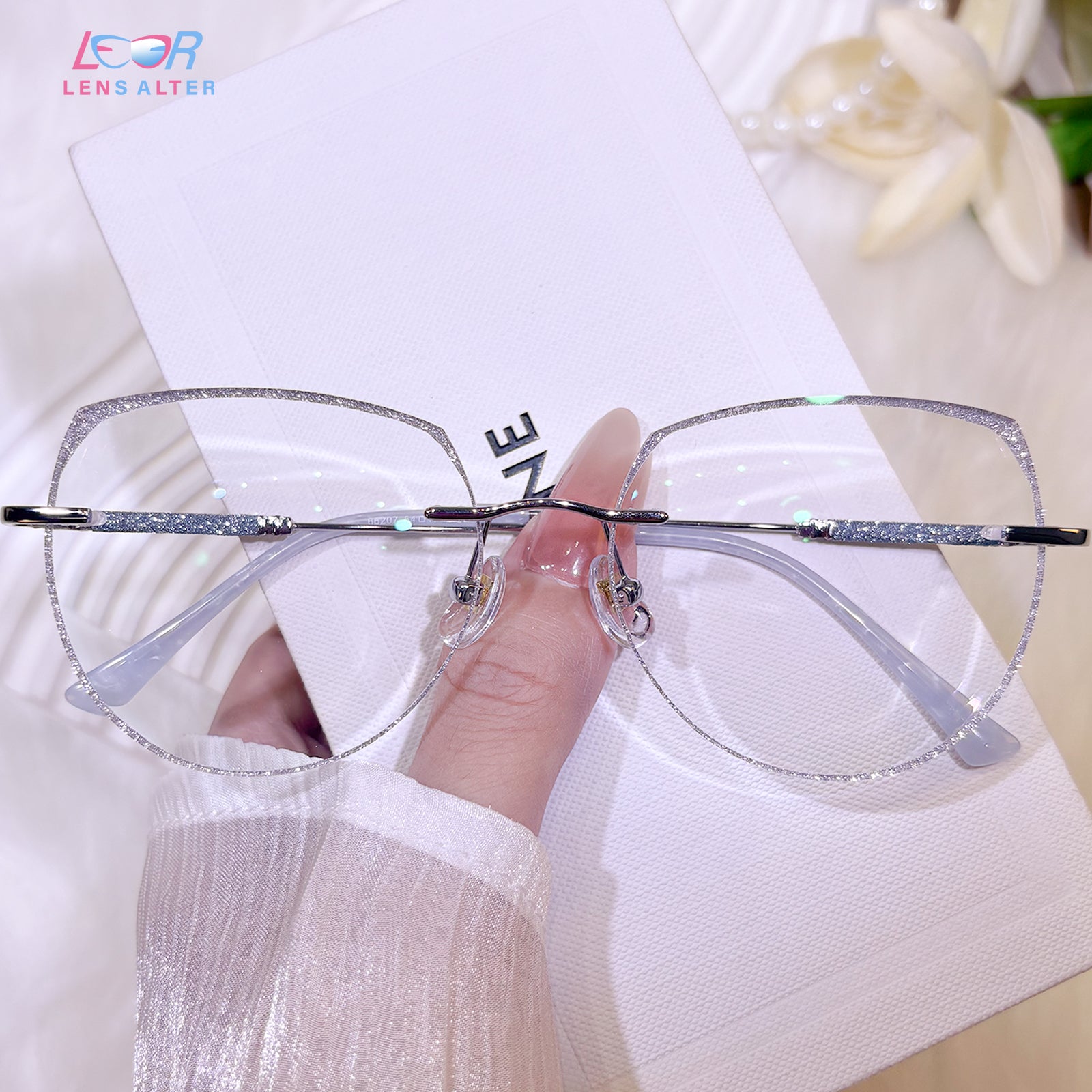 | Exclusive Design | These uniquely shaped rimless glasses feature an imaginative, avant-garde silhouette that instantly stands out. The lenses are dusted with fine glitter for a shimmering effect, while the delicately crafted temples add an extra touch of elegance and individuality. Perfect for fashion lovers who crave bold, artistic flair.