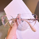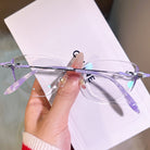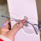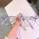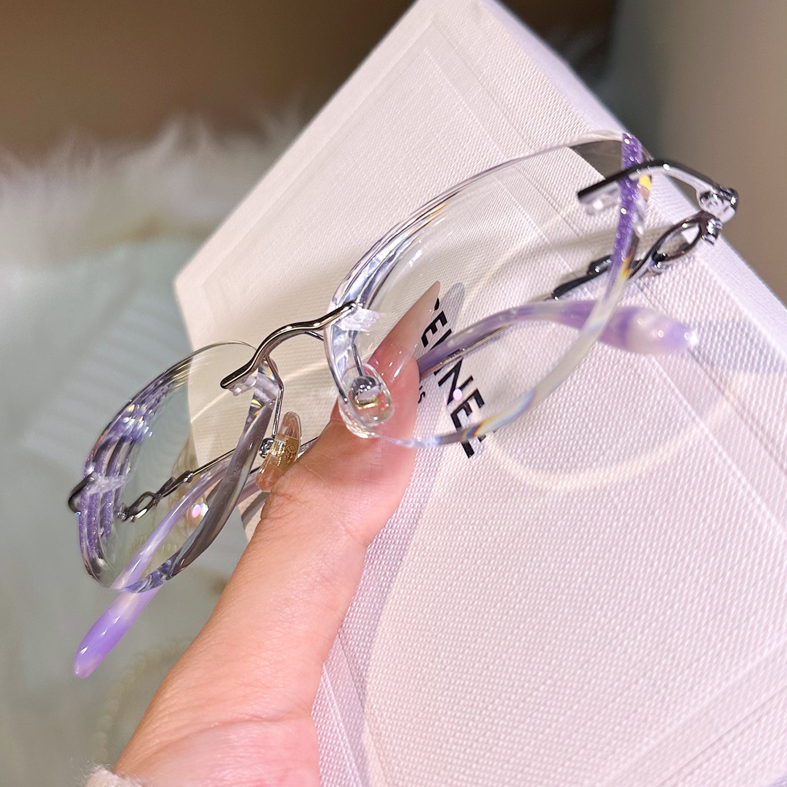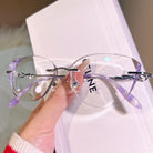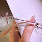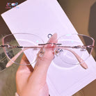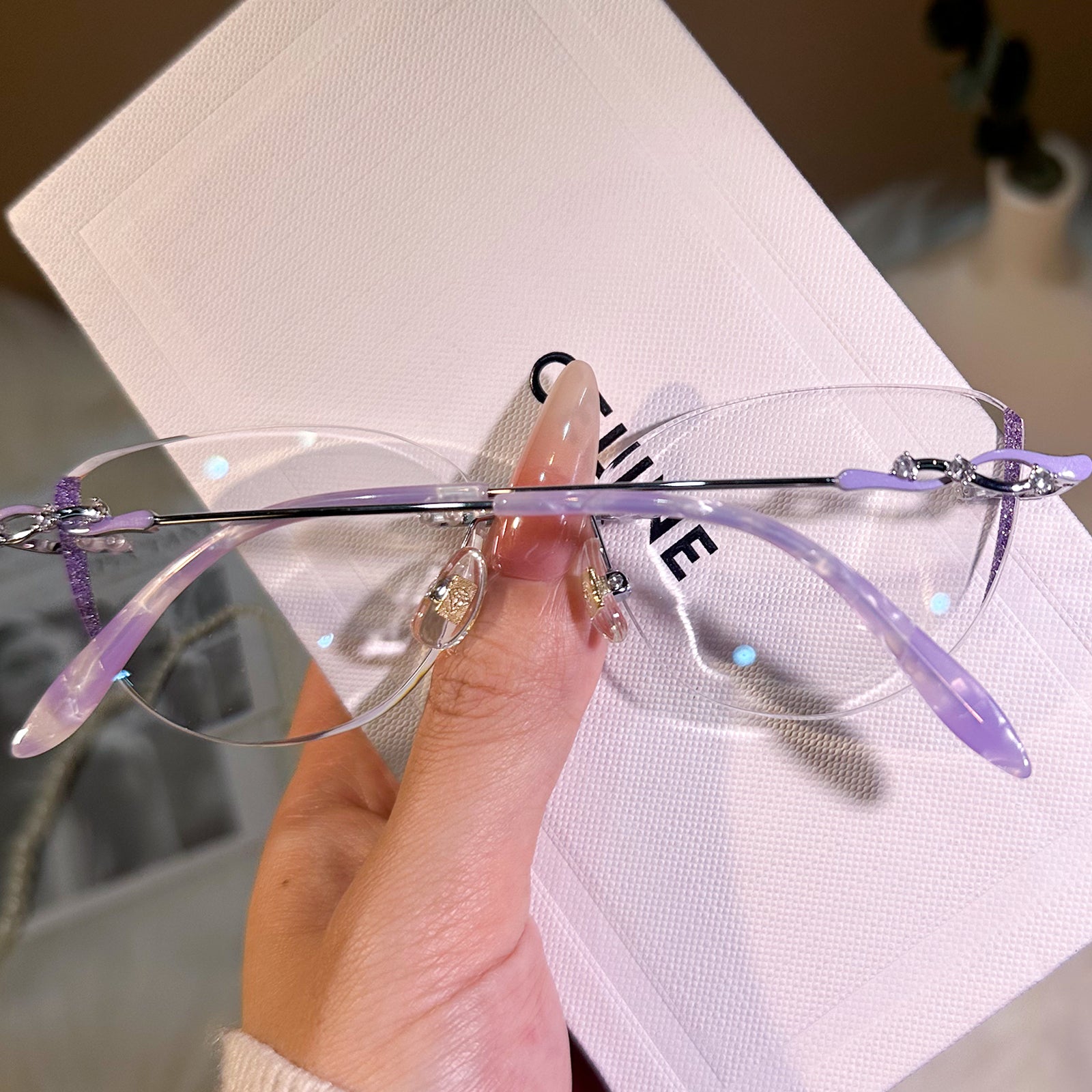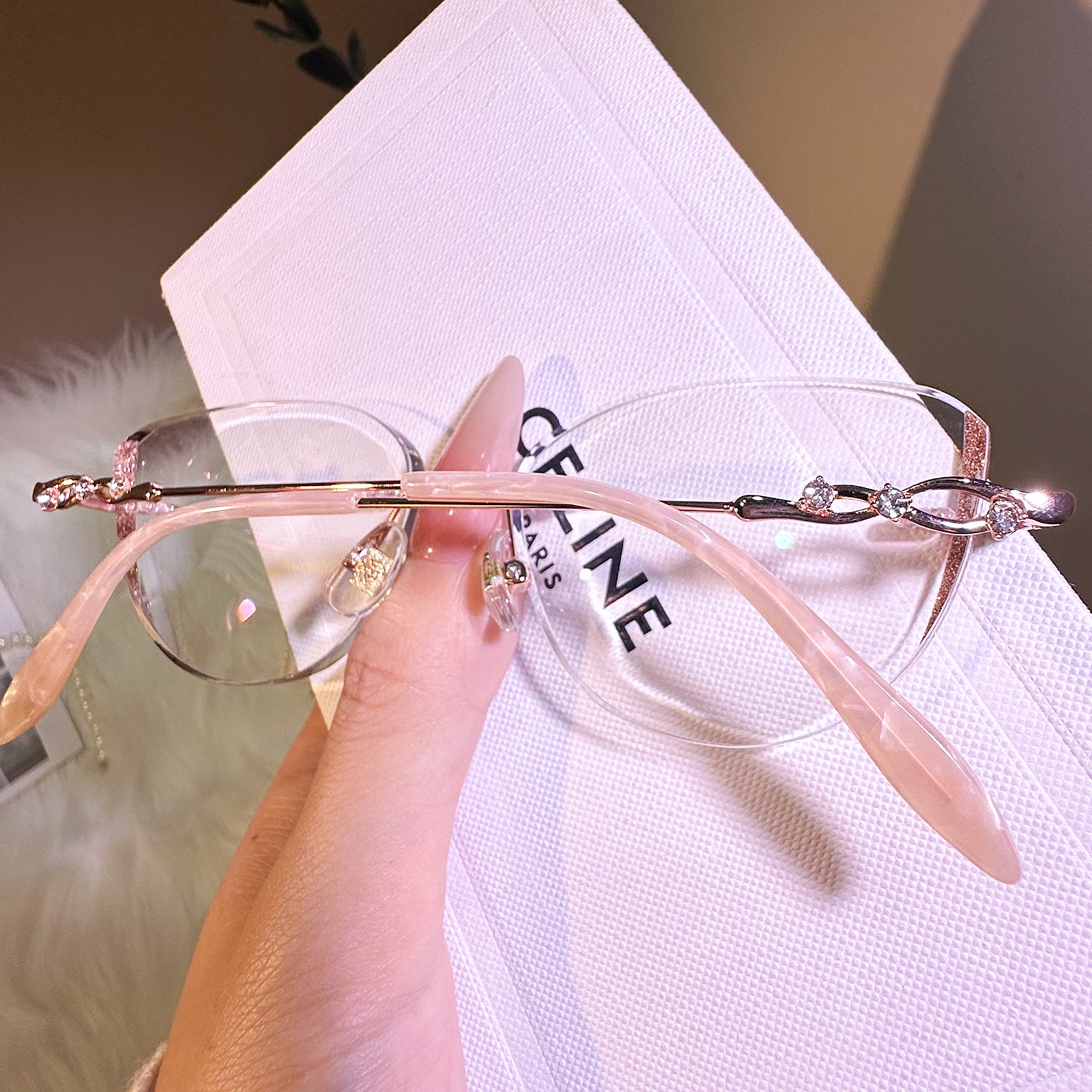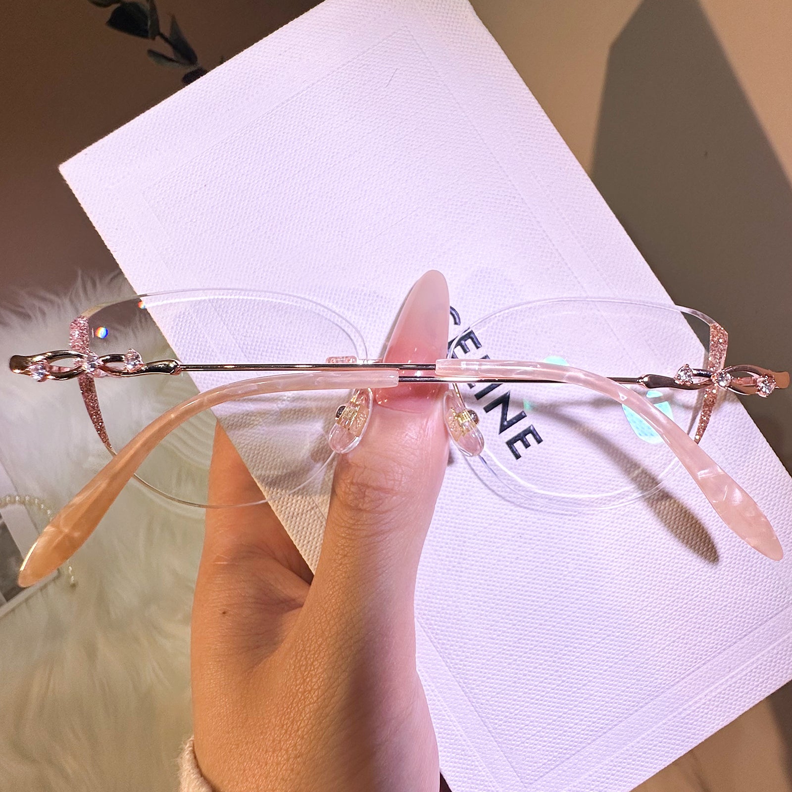 Chic rimless glasses for women feature lenses with a subtle glitter finish and sparkling diamond accents on the temples. A playful yet luxurious twist that's perfect for making a trendy statement!