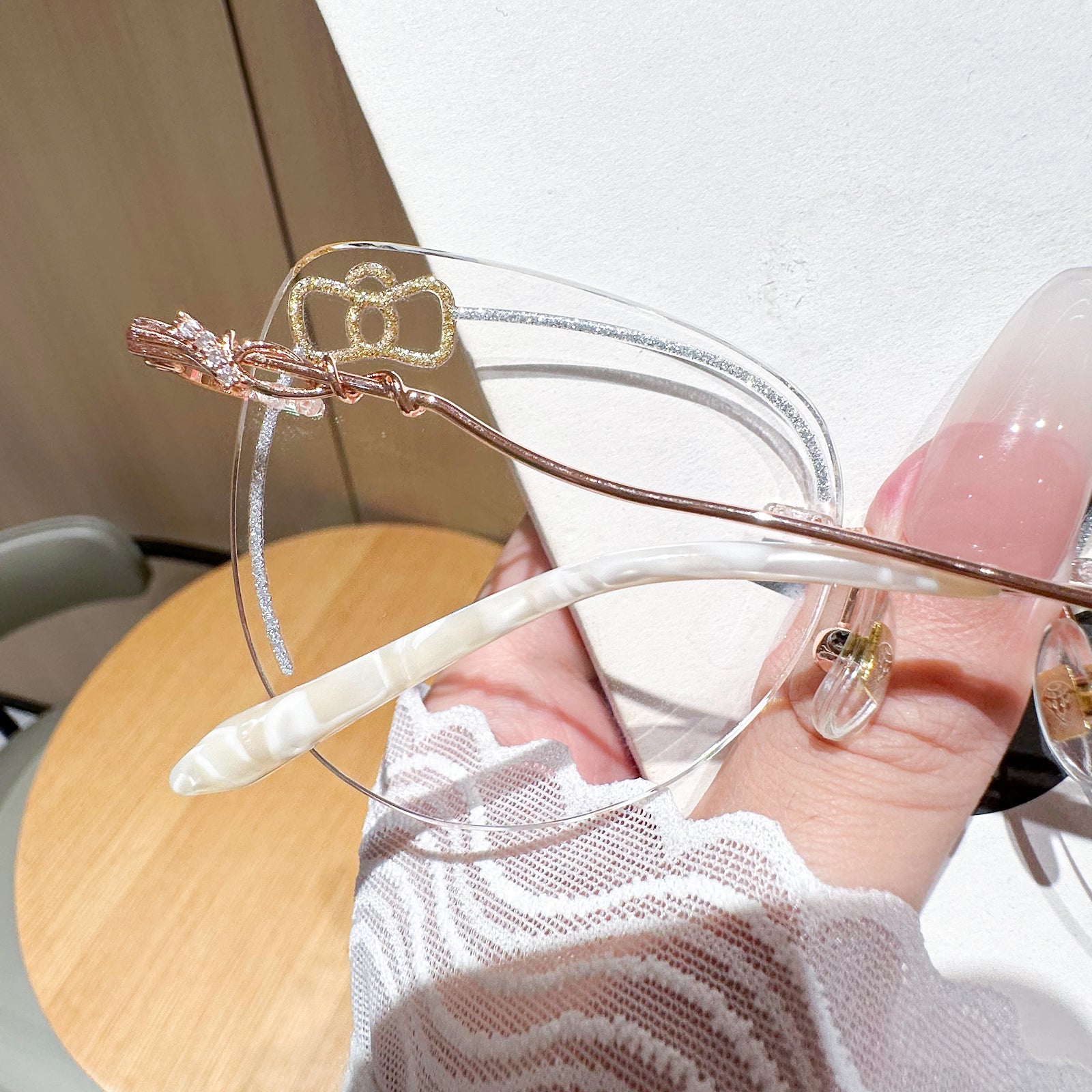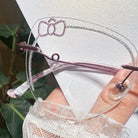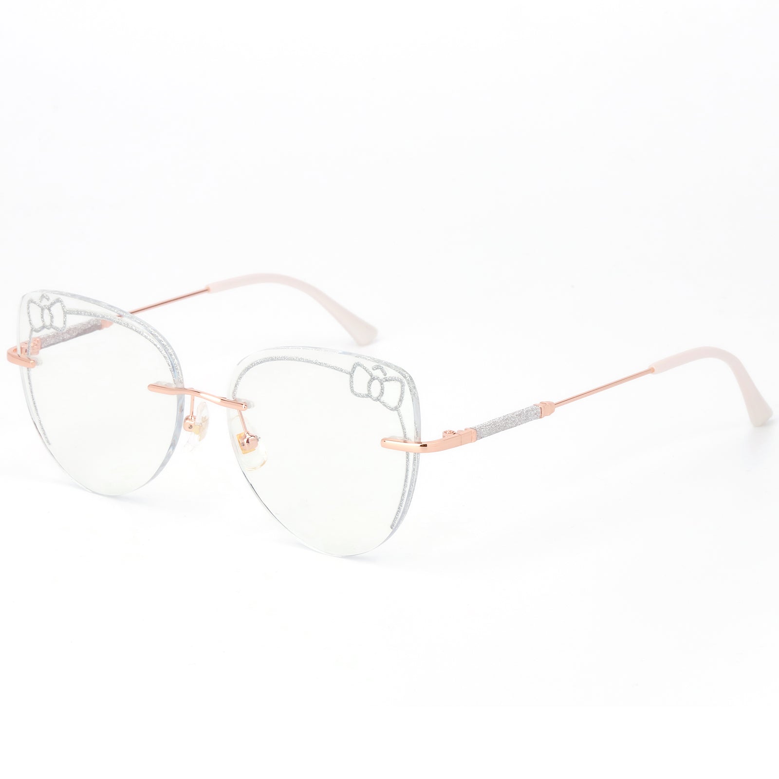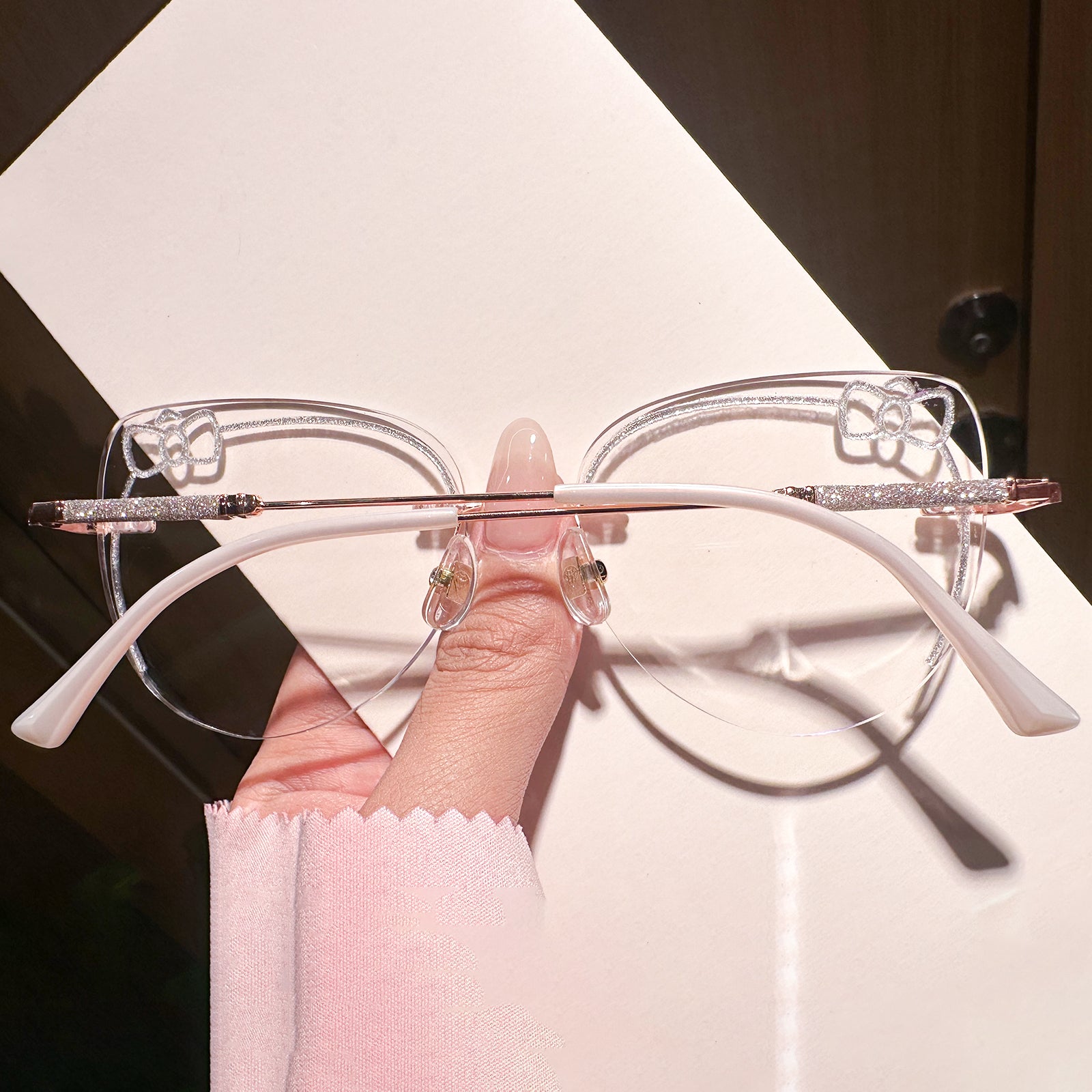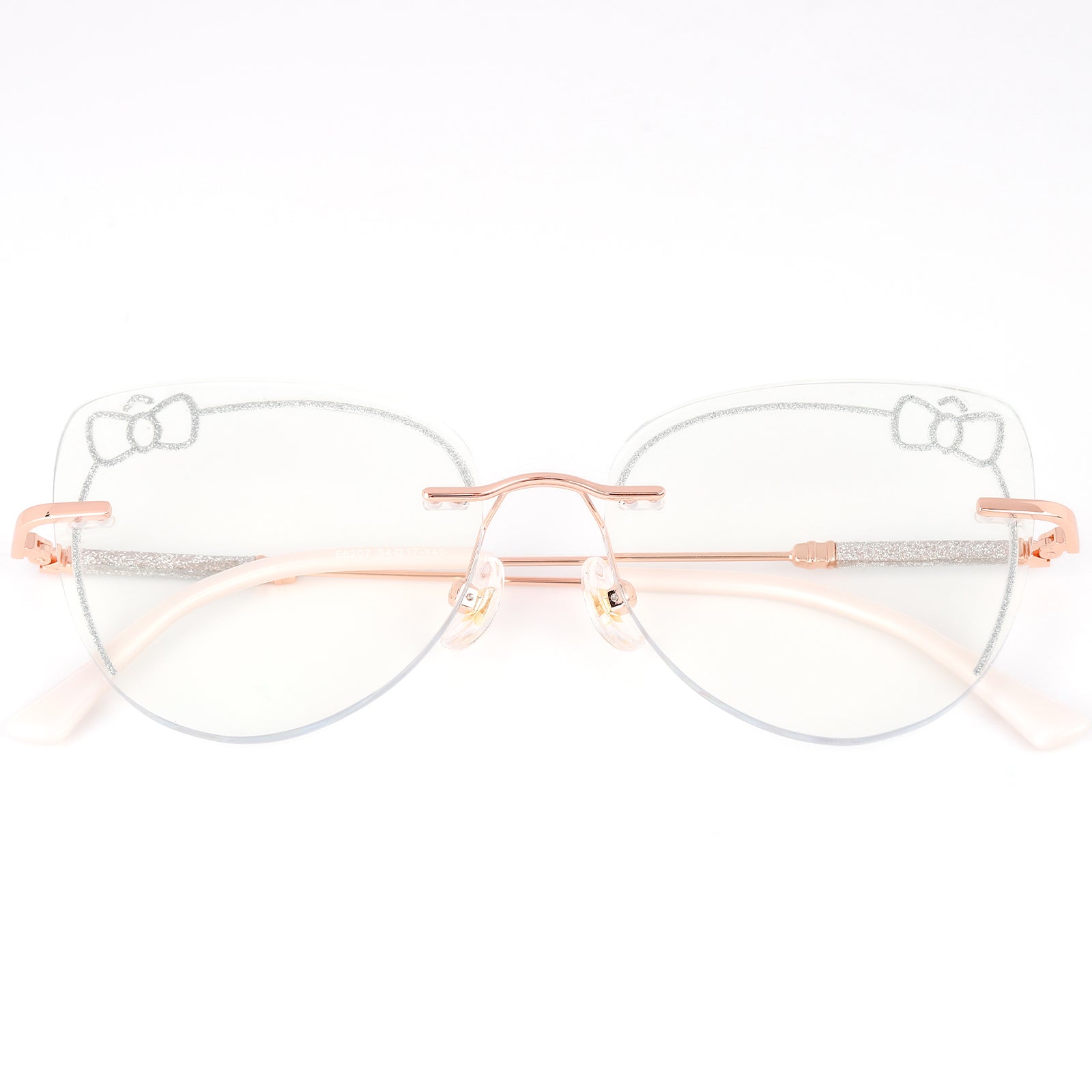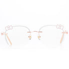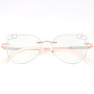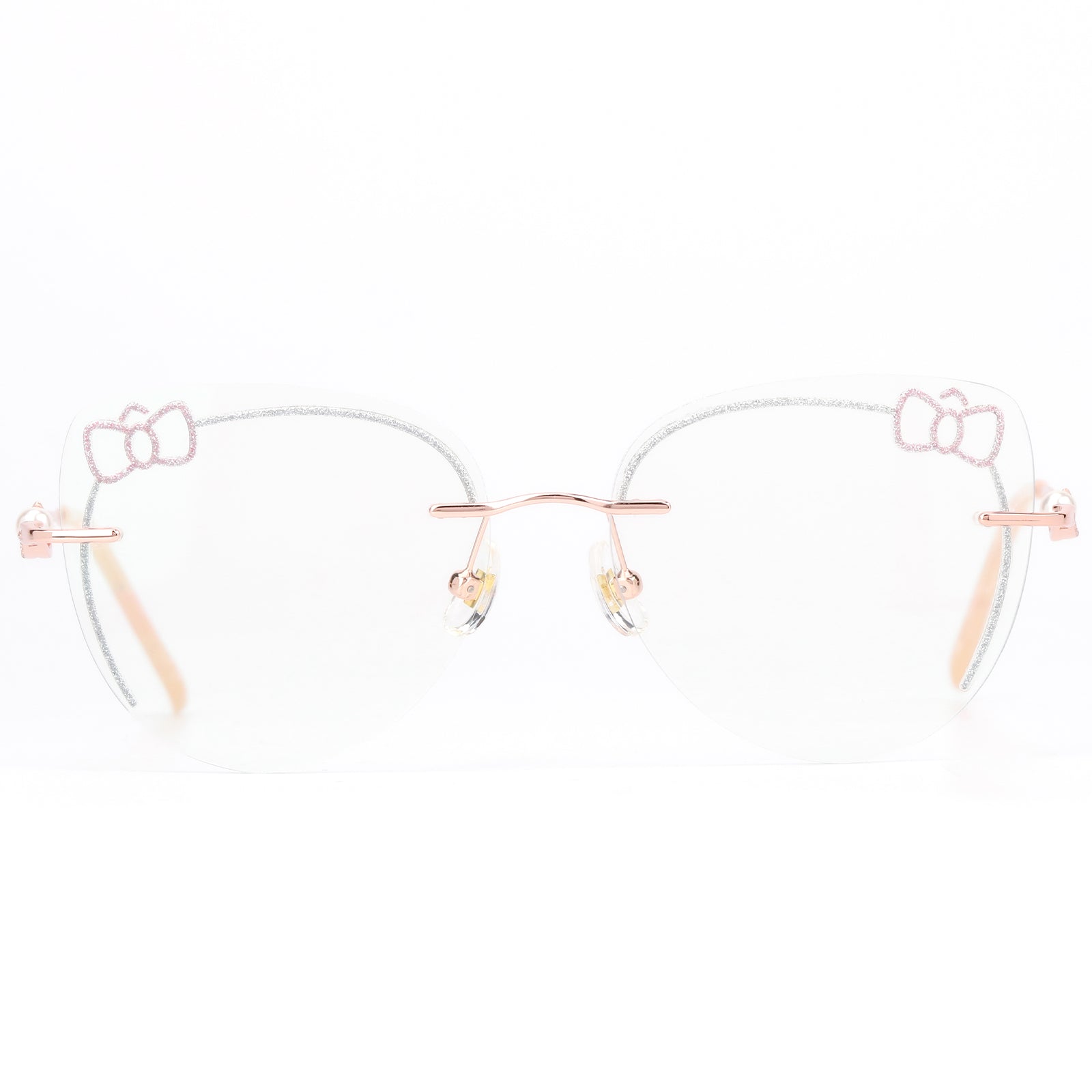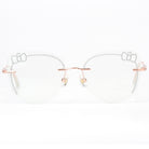 Kitty ist breite Brillen in Rossengolden und Rosa, die aus hochwertigem Metall mit entzückenden Kitty-Bögen und silbernen Glitzern hergestellt wurde. Verwenden Sie die entzückende Kollision von Cartoon und Sheen, um Ihre innere Unschuld zu zeigen.