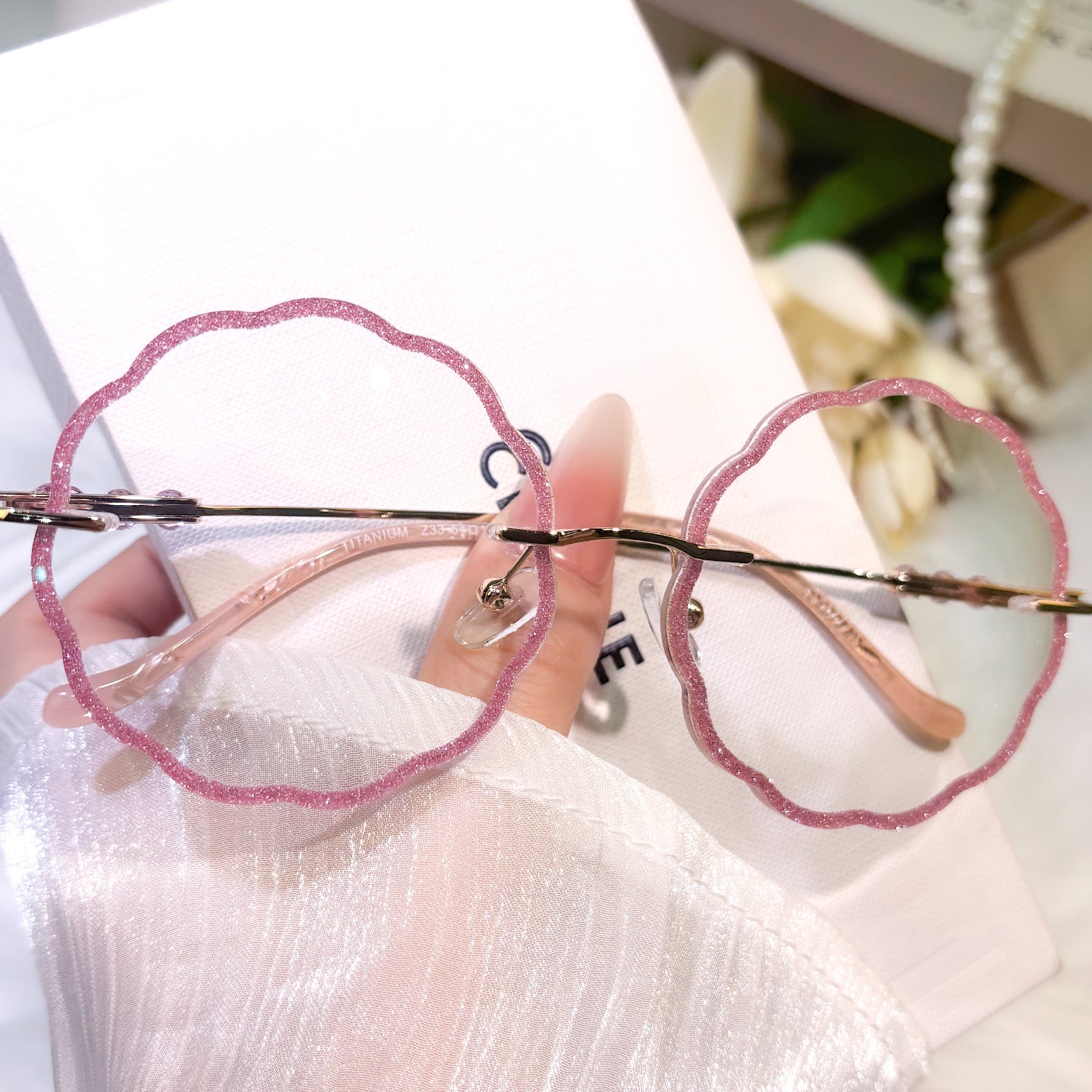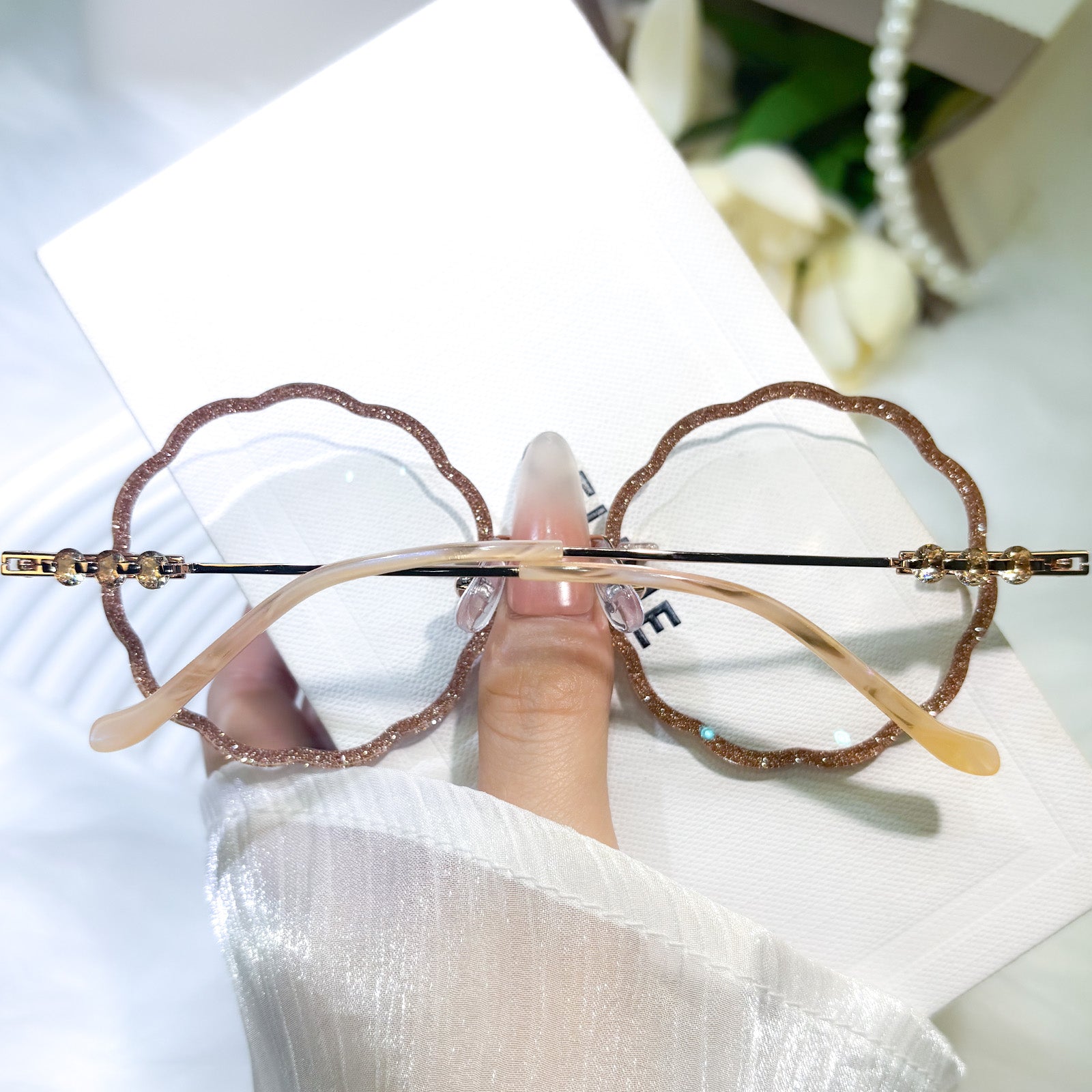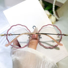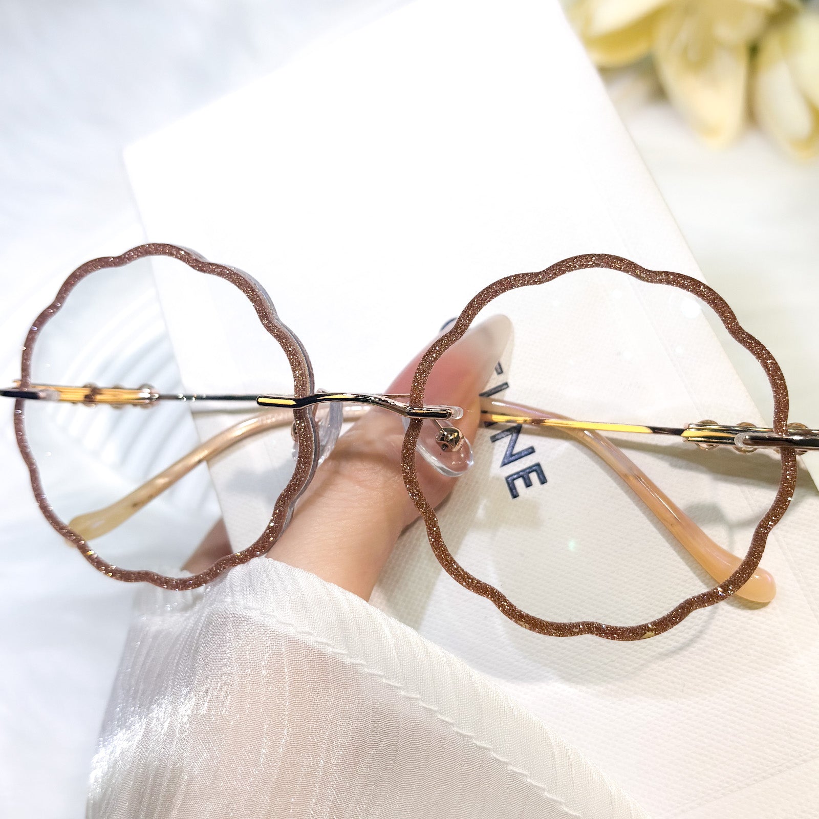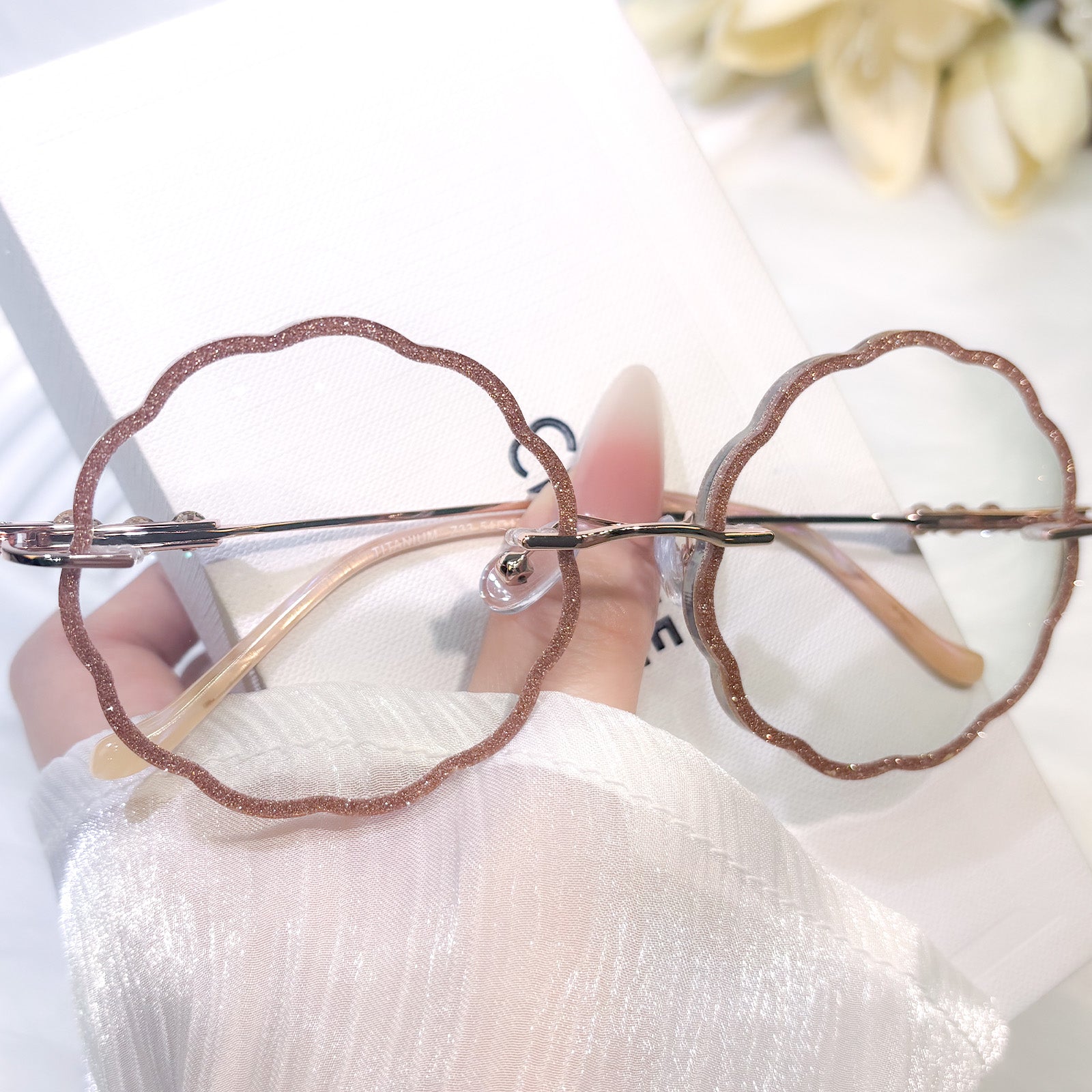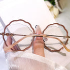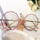 | Exlusive Design | Round flower-shaped rimless glasses for women, with a romantic and gentle design that highlights feminine grace. The lenses are fully wrapped in sparkling glitter, shining delicately in the light for an eye-catching effect. Paired with elegantly styled temples, they blend sweetness and sophistication perfectly.