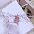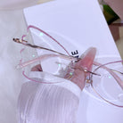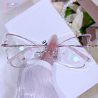 | Exclusive Design | These dreamy rimless glasses feature lenses shaped like soft, fluttery wings, delicately wrapped in sparkling pink glitter. The temples are designed to resemble wings in motion, adding a whimsical and elegant touch that makes them both enchanting and stylish.