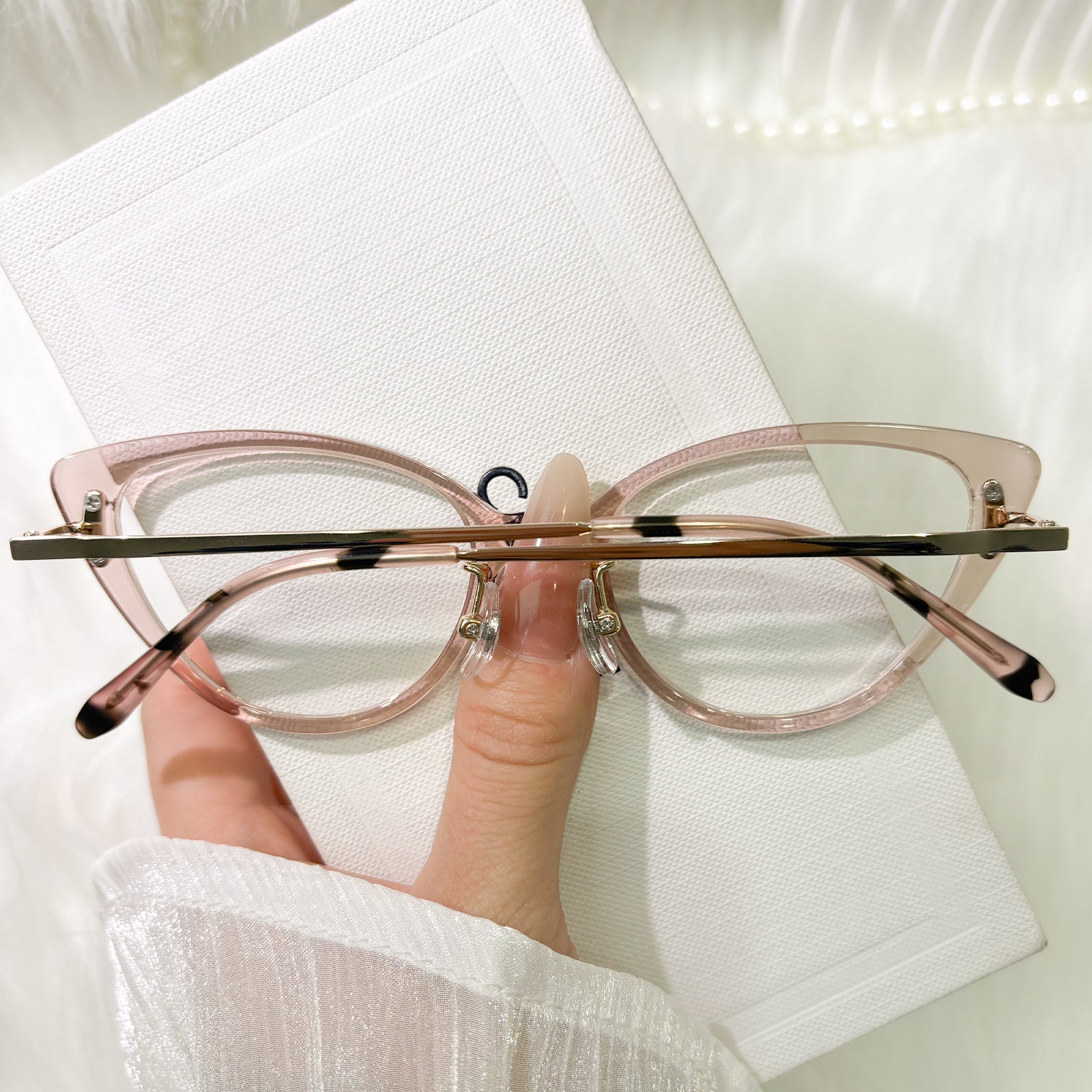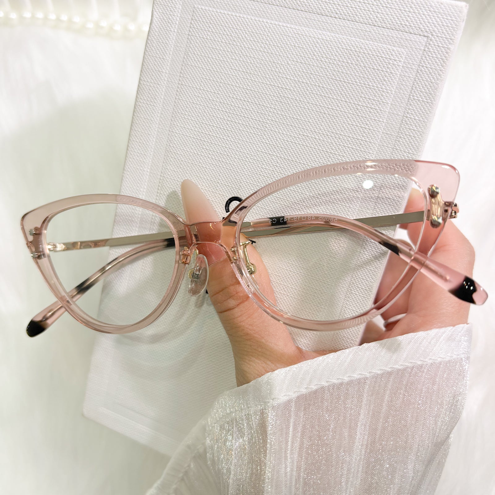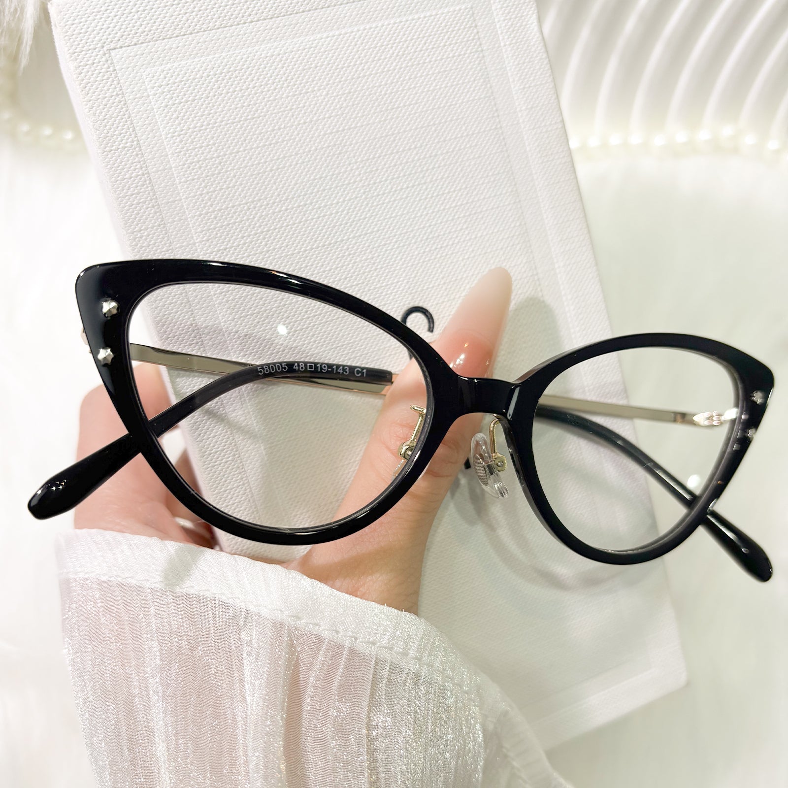Designed to reflect your inner light, these cat-eye glasses blend delicate sparkle with versatile color storytelling. Black whispers timeless maturity, translucent pink evokes gentle romance, and vivid pink sings playful charm—each inviting you to shine in your own distinct way.
