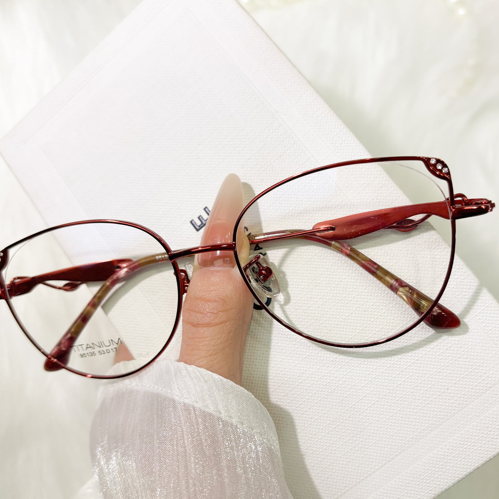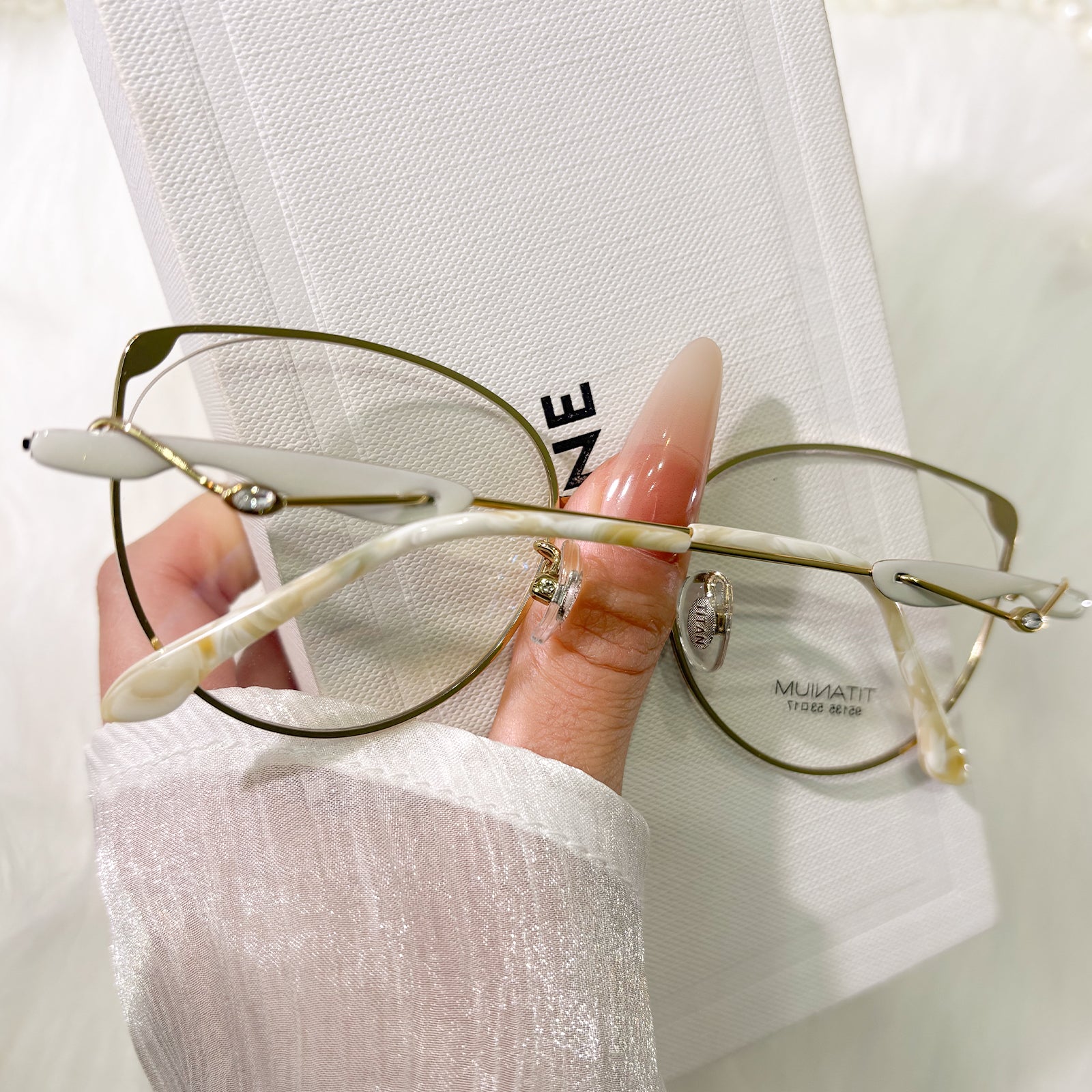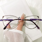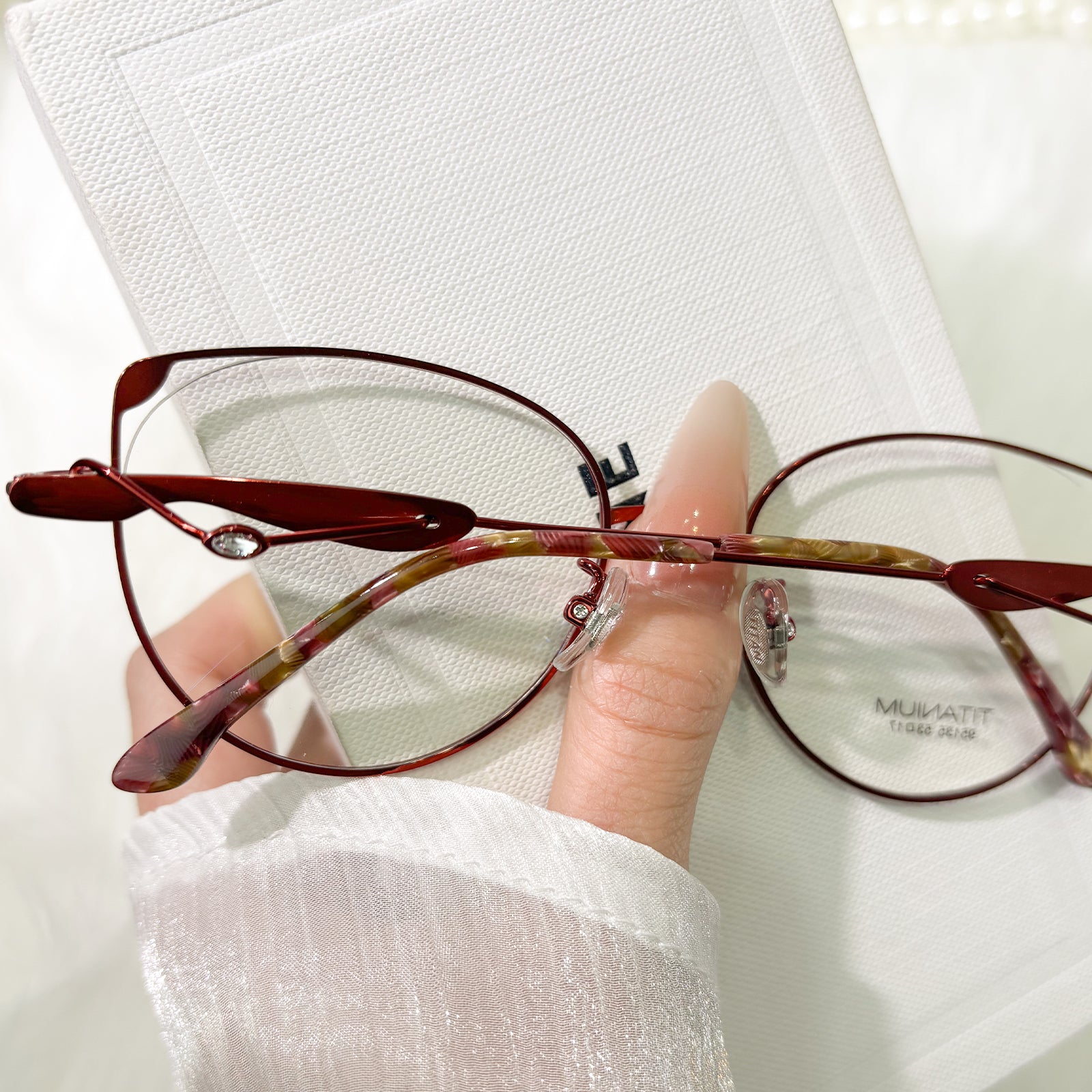 A bold fusion of light and pigment, this titanium cat-eye frame blends glacial white, electric red, and royal purple in a seamless, eye-catching flow. The lightweight metal construction ensures all-day brilliance, while the gradient transitions like a sunset over a modern skyline—designed for the color-confident visionary.