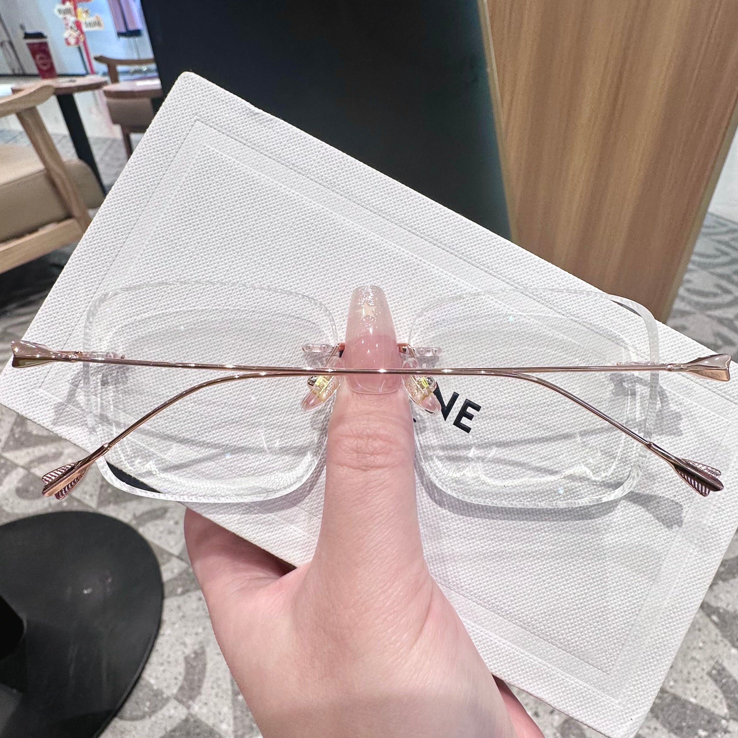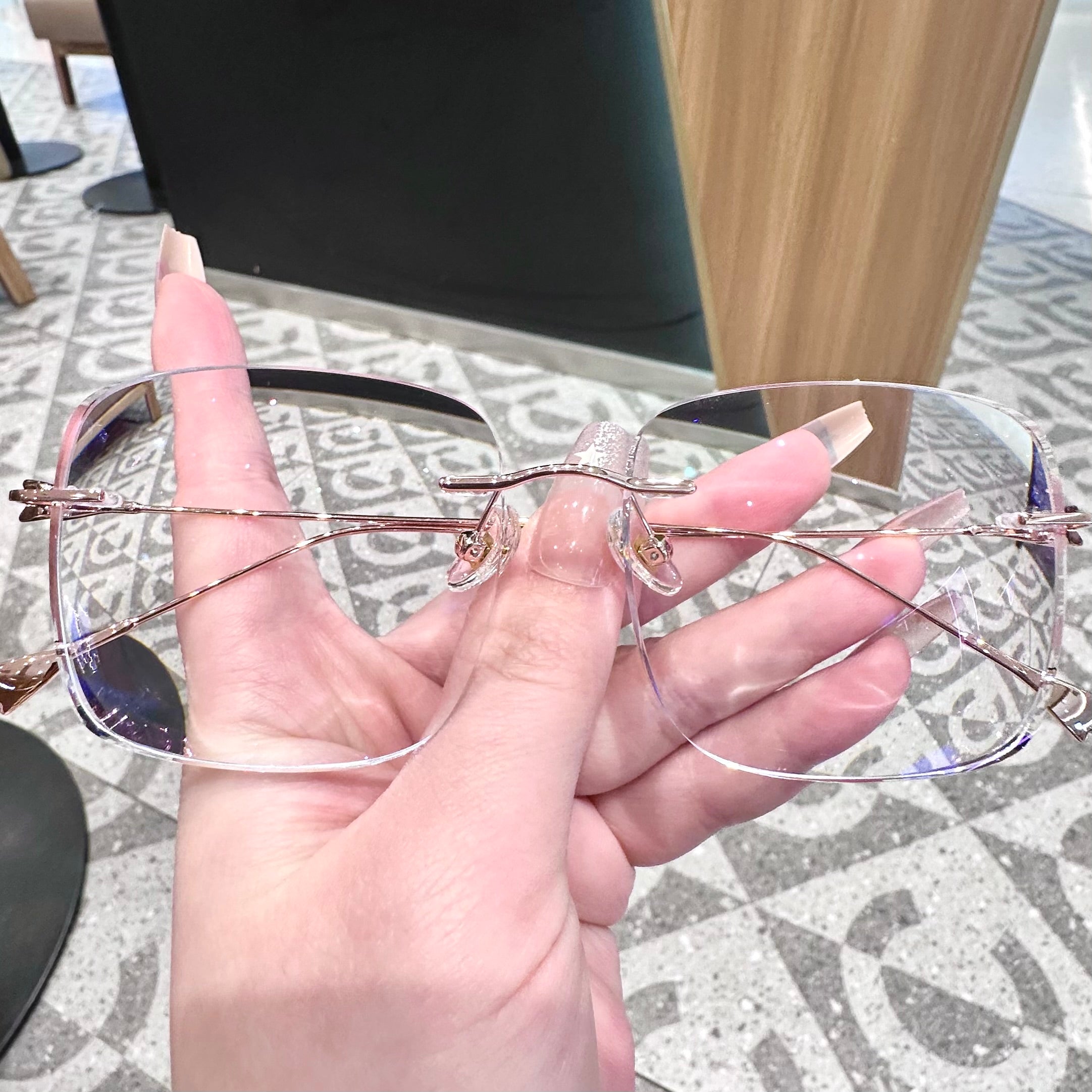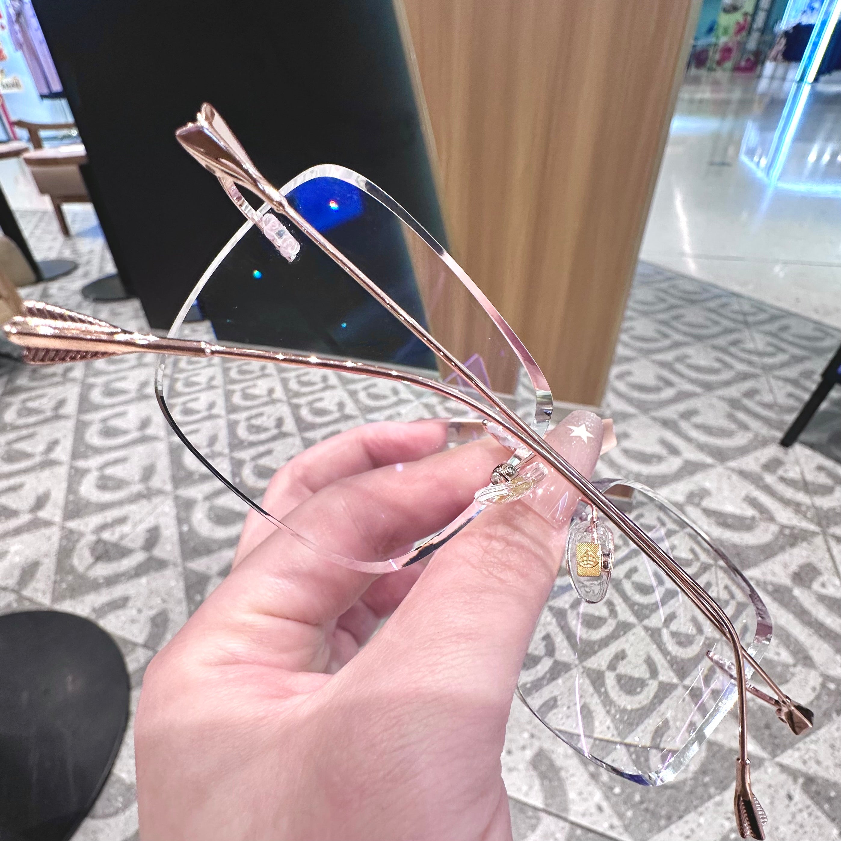 Square rimless glasses exude sophistication with their minimalist design and stunning rose gold temples. The arrow-shaped detail on the temples adds a bold, yet refined touch—aimed to capture attention and steal hearts.