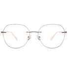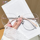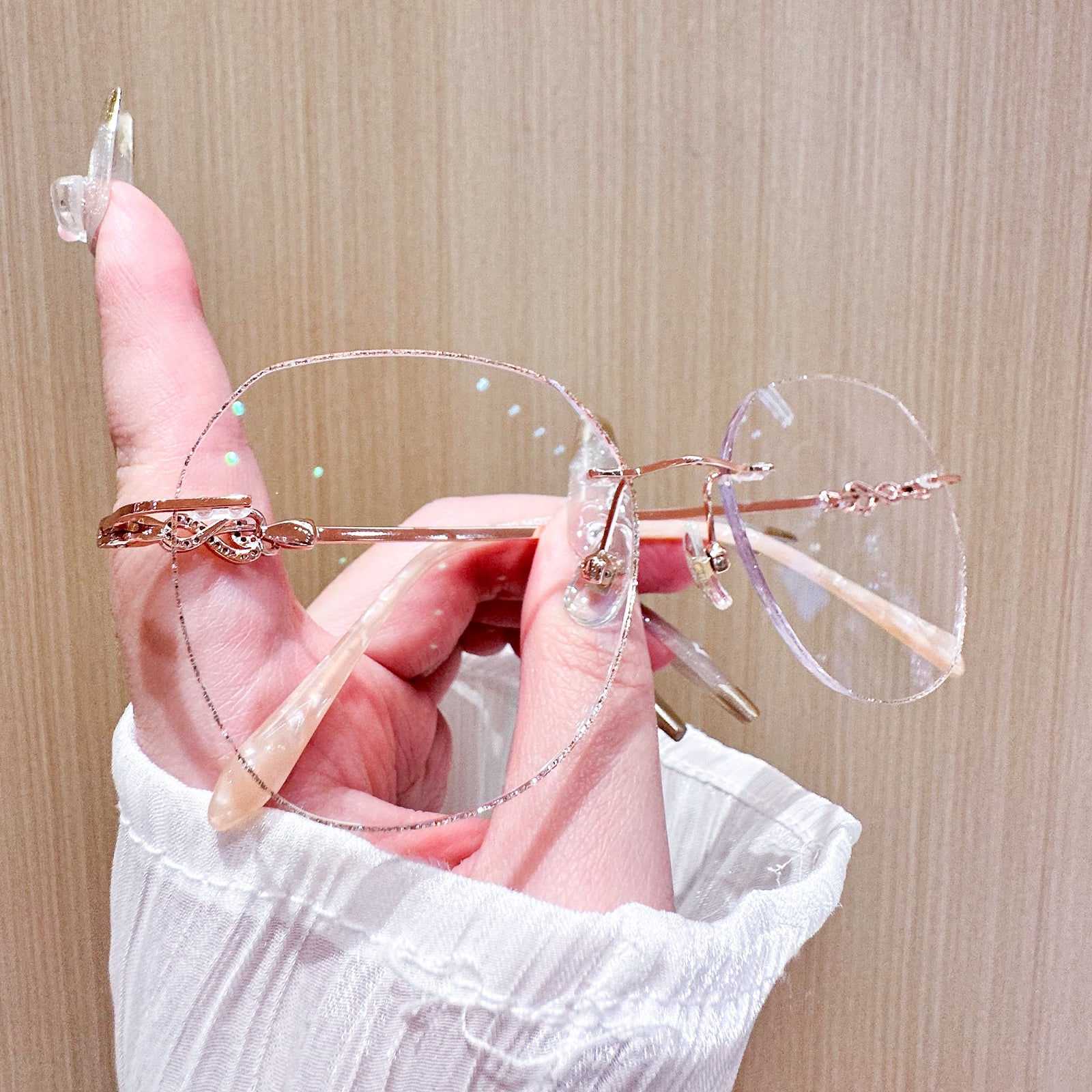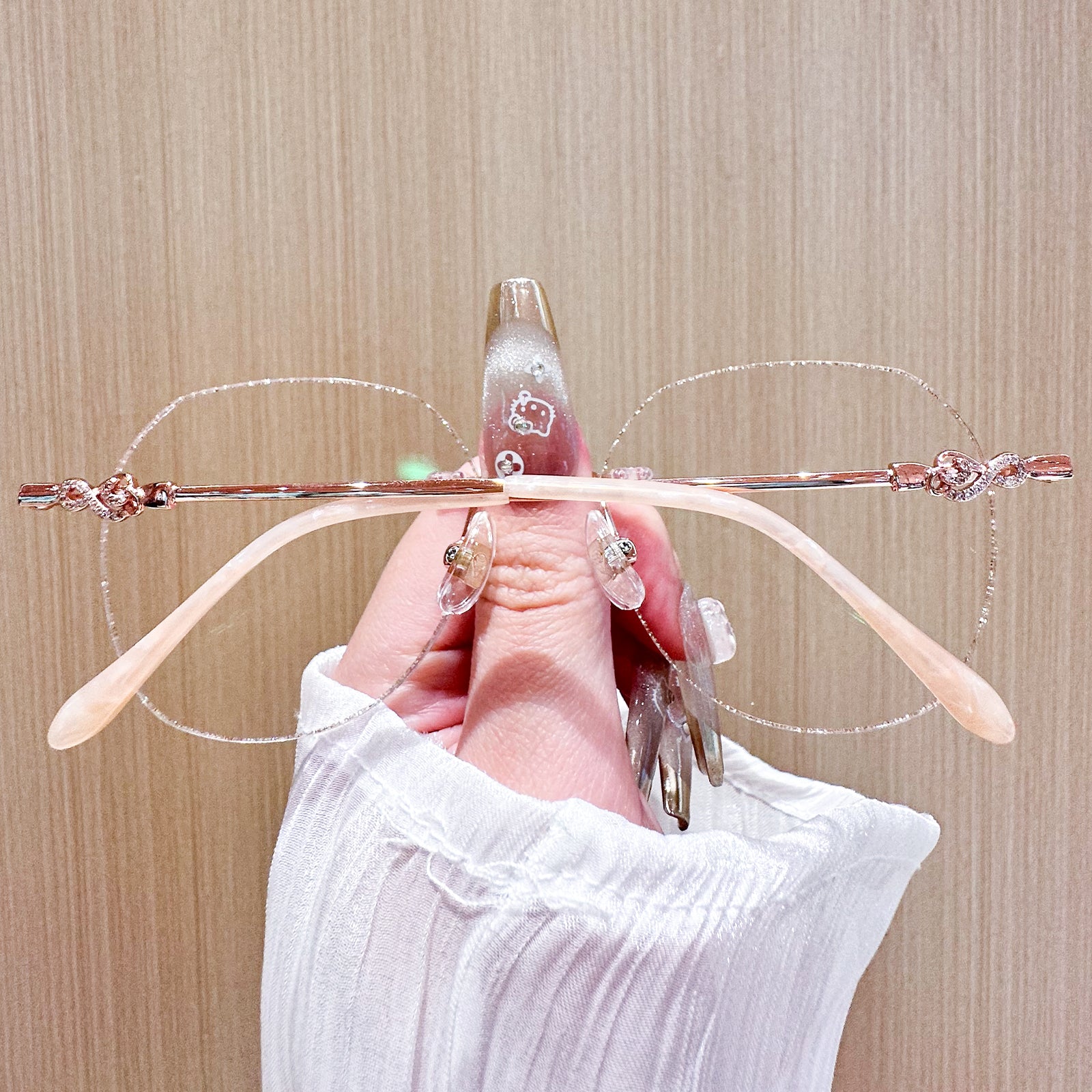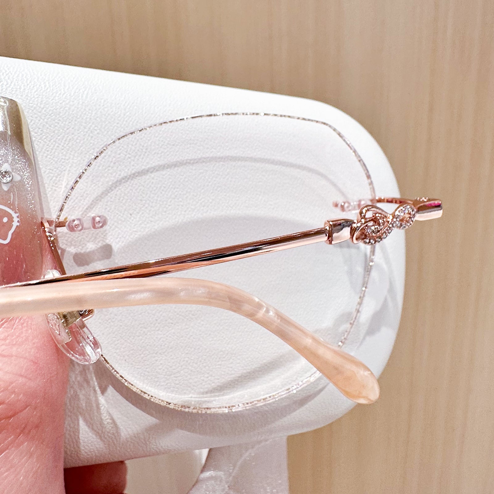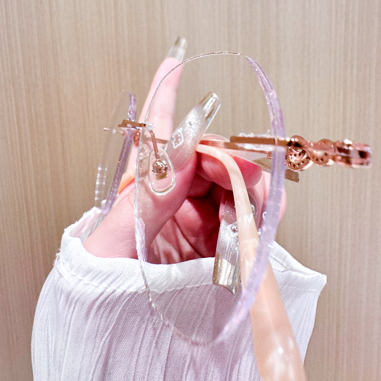 Exquisite Brillen mit Beinen mit einem zarten Erröten, das rosa Kristallen ähnelt und subtil einen platinähnlichen Glanz enthüllt. Wenn harmonische Notizen um Ihre Ohren tanzen, wird Ihr Blick mühelos von den Diamanten fasziniert, die die Beine schmücken und einen faszinierenden Reiz verursachen.