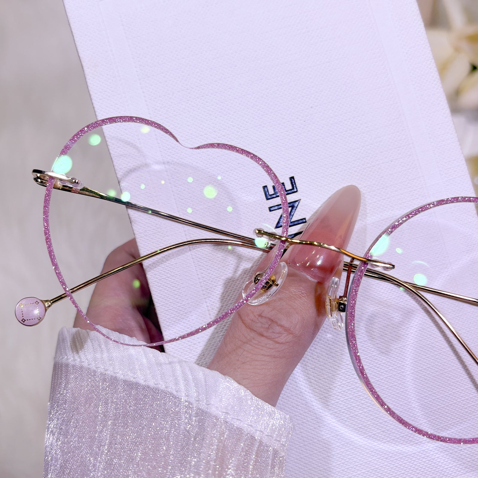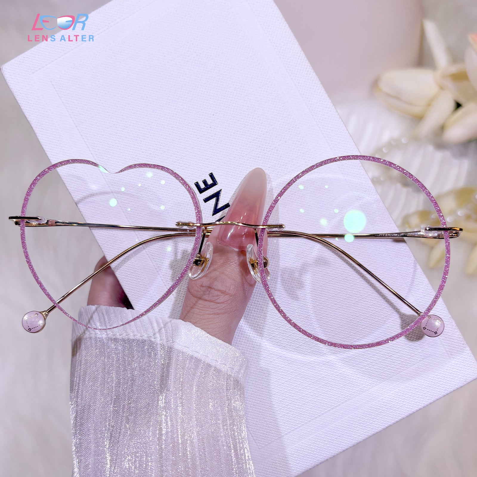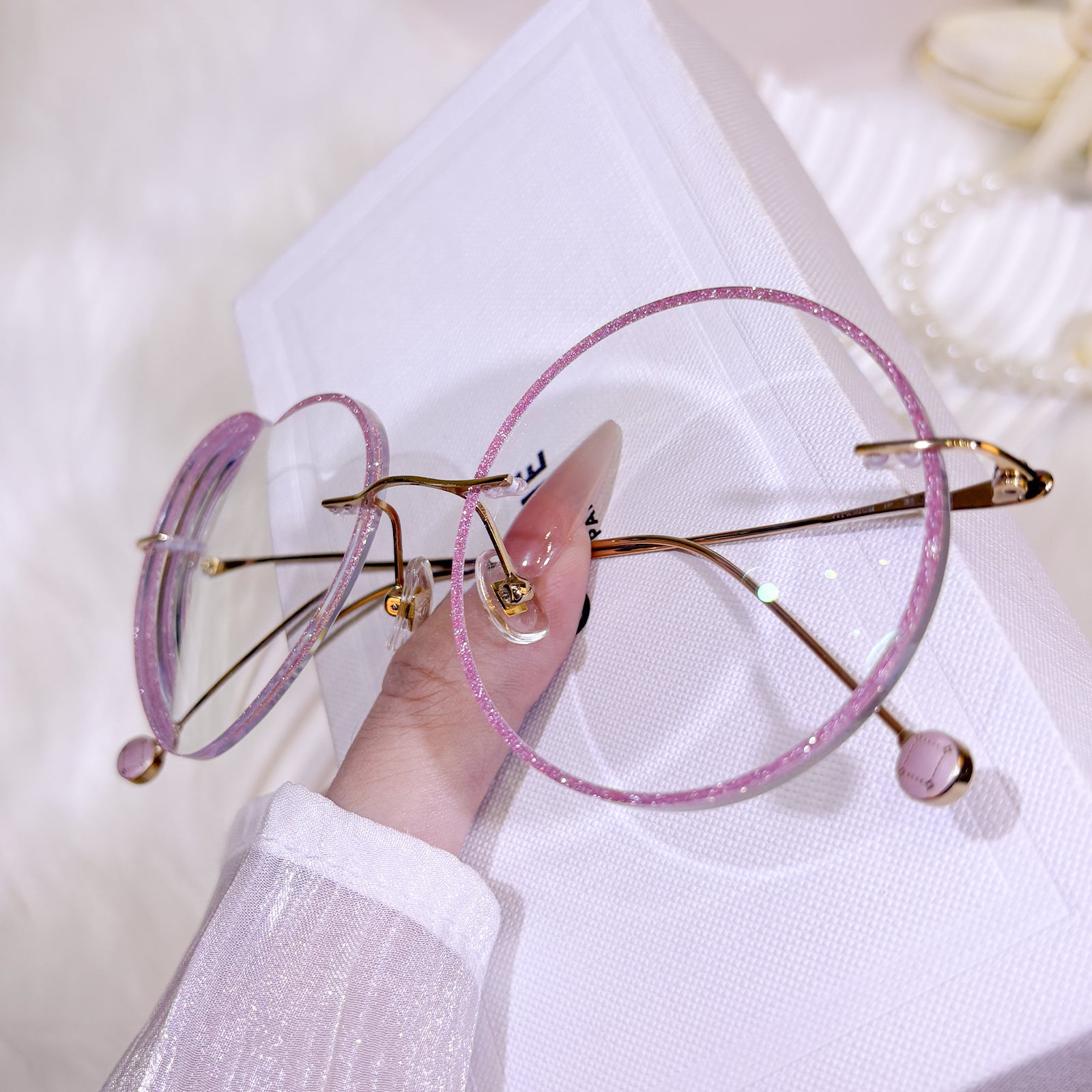 | Exclusive Design | These rimless glasses blend a round lens with a heart-shaped one, creating a whimsical and romantic silhouette. The lenses are dusted with delicate glitter, while the ultra-thin titanium temples add a touch of elegance and sweetness—perfect for those who adore playful charm with a refined finish.