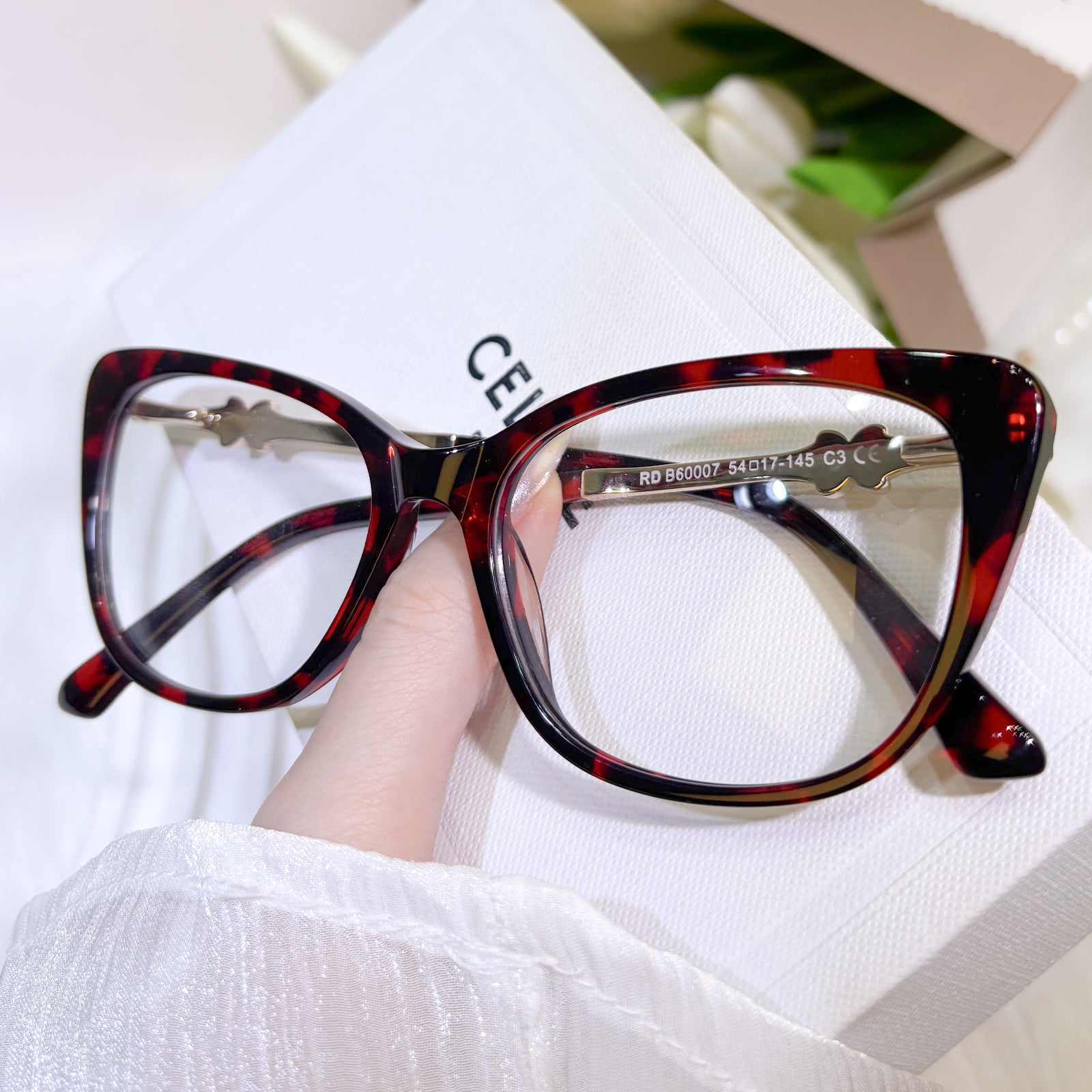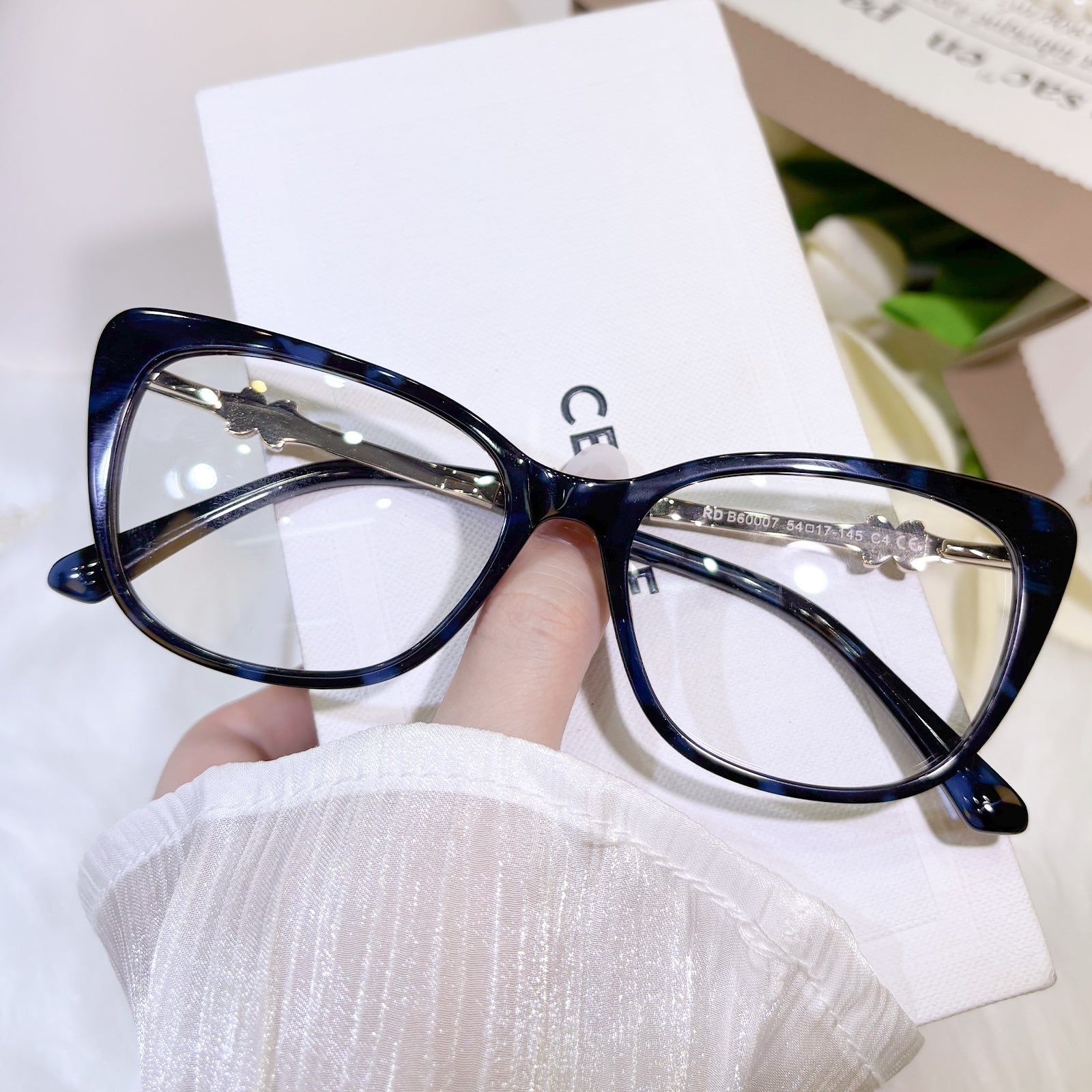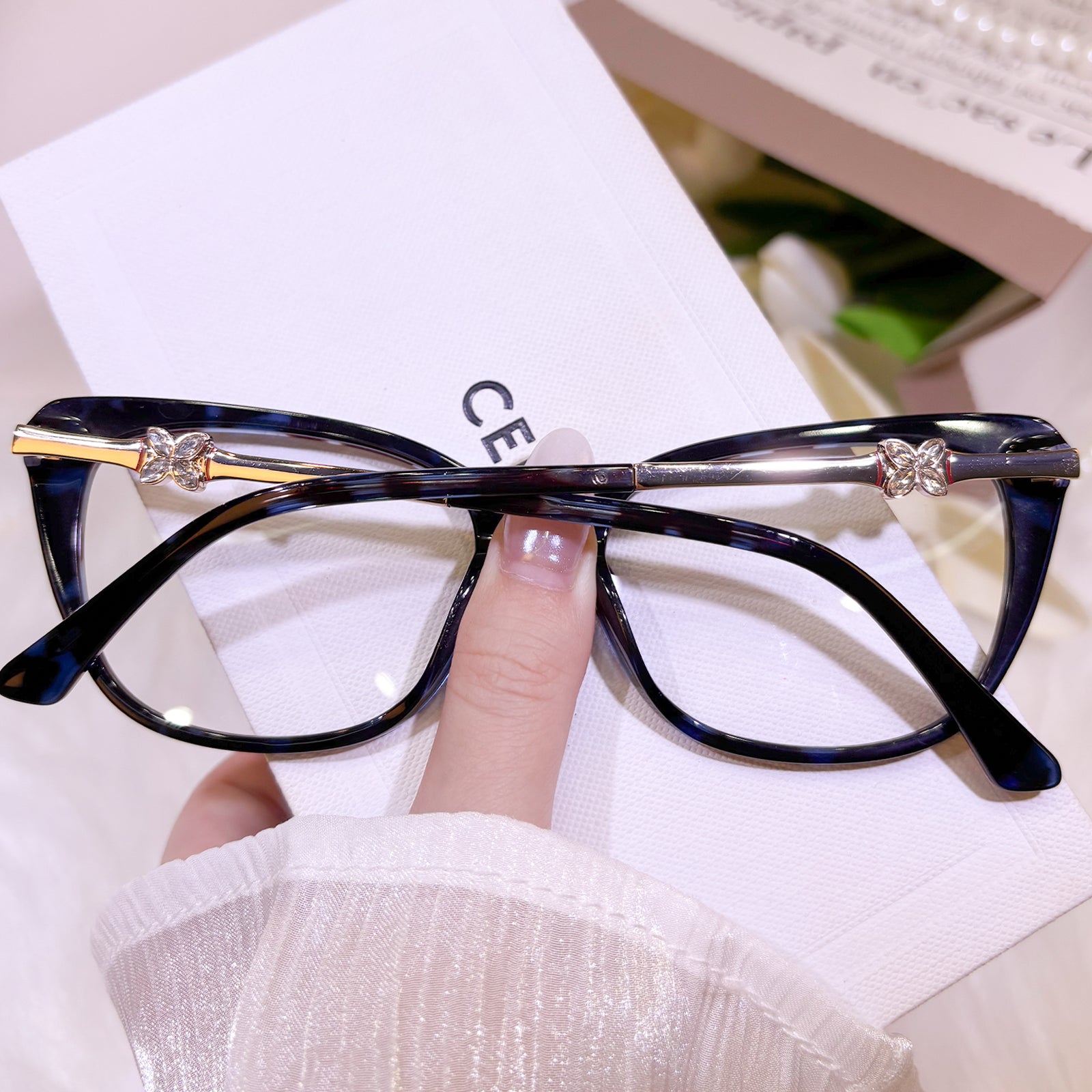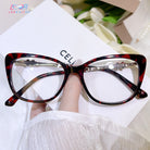 These glamorous and high-end cat-eye women’s glasses exude elegance and sophistication. The temples are adorned with ornate decorations, adding a touch of brilliance and refinement. Perfect for women who desire eyewear that is both stylish and exquisitely distinguished.