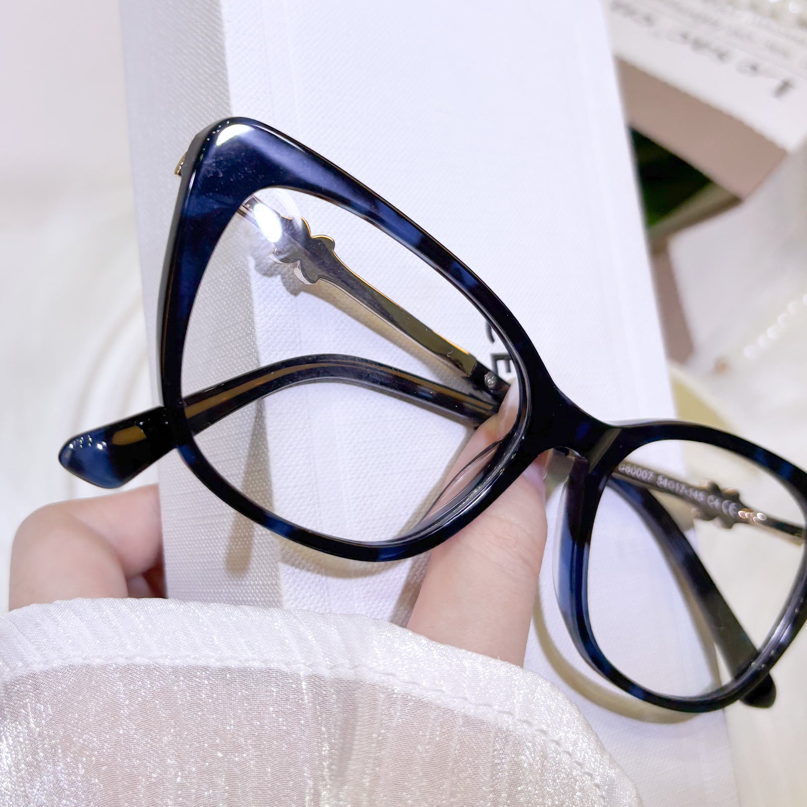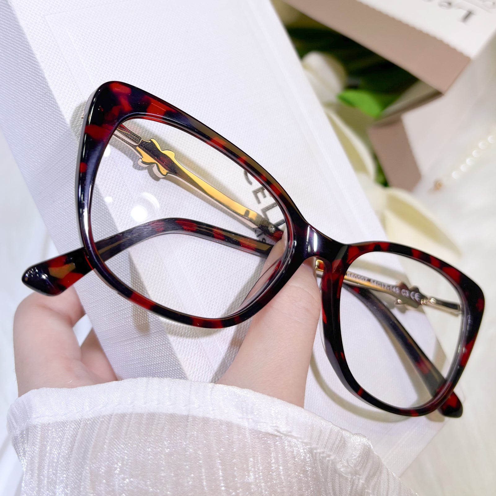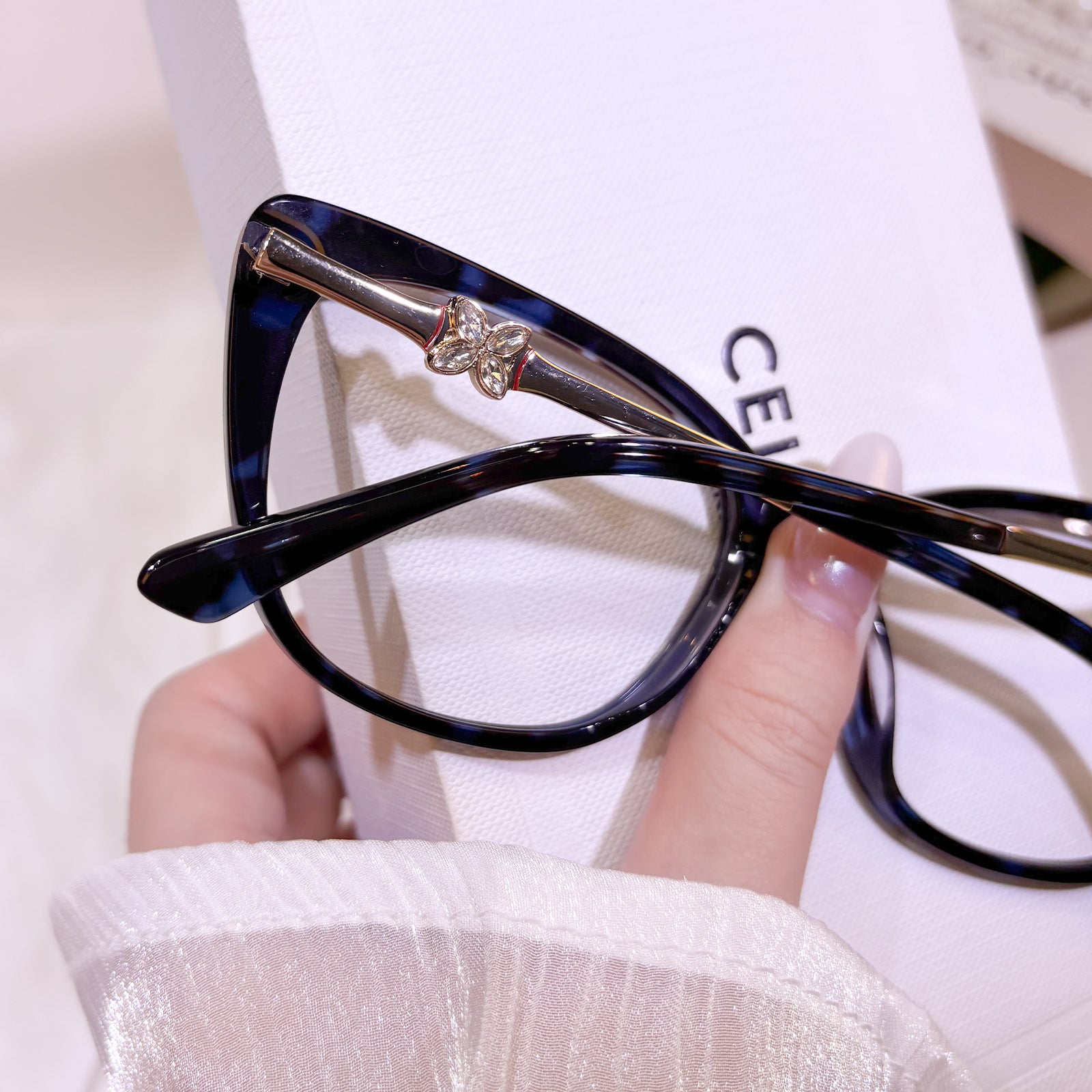 These glamorous and high-end cat-eye women’s glasses exude elegance and sophistication. The temples are adorned with ornate decorations, adding a touch of brilliance and refinement. Perfect for women who desire eyewear that is both stylish and exquisitely distinguished.