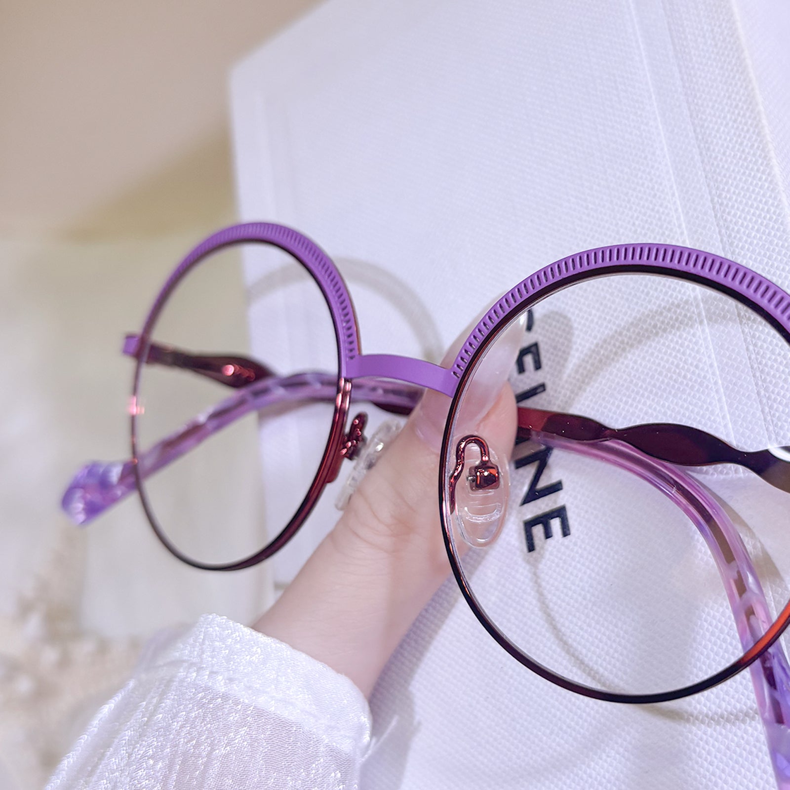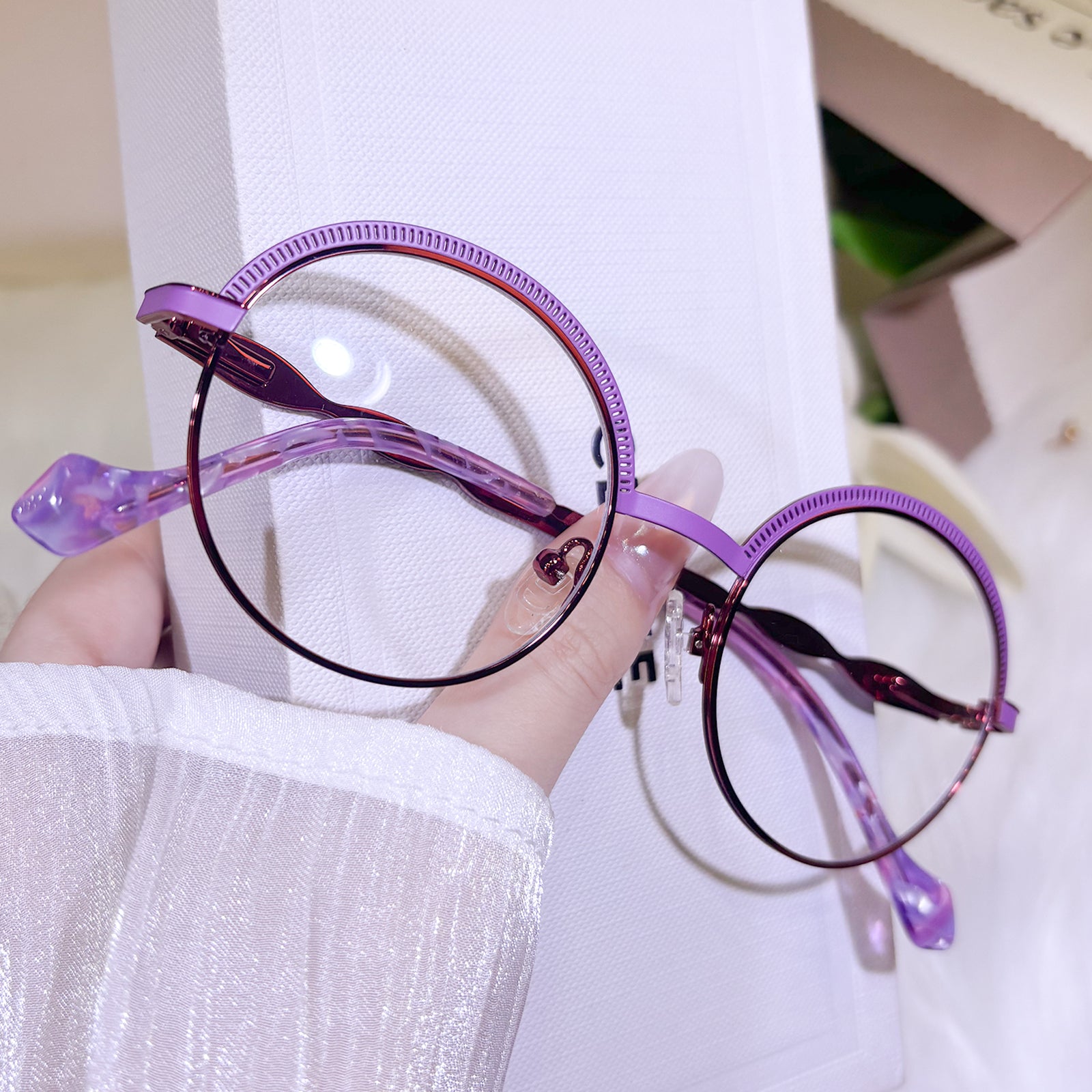 These round purple glasses feature a unique and eye-catching design that effortlessly blends glamour with a bold, modern edge. Vibrant and striking, they add a touch of luxury and personality to any look. Perfect for women who love to make a fashionable statement.