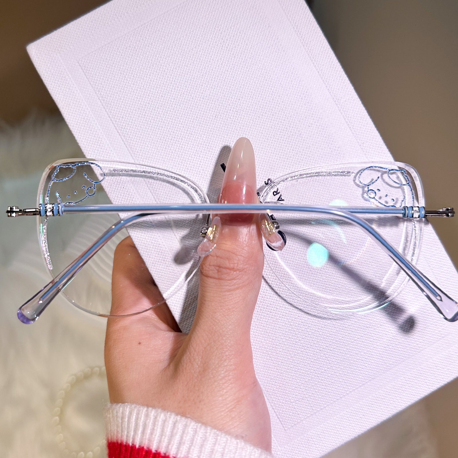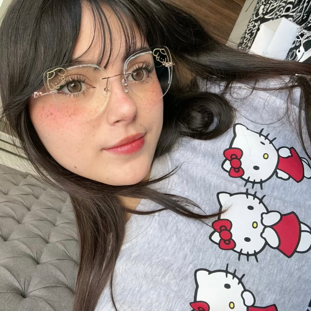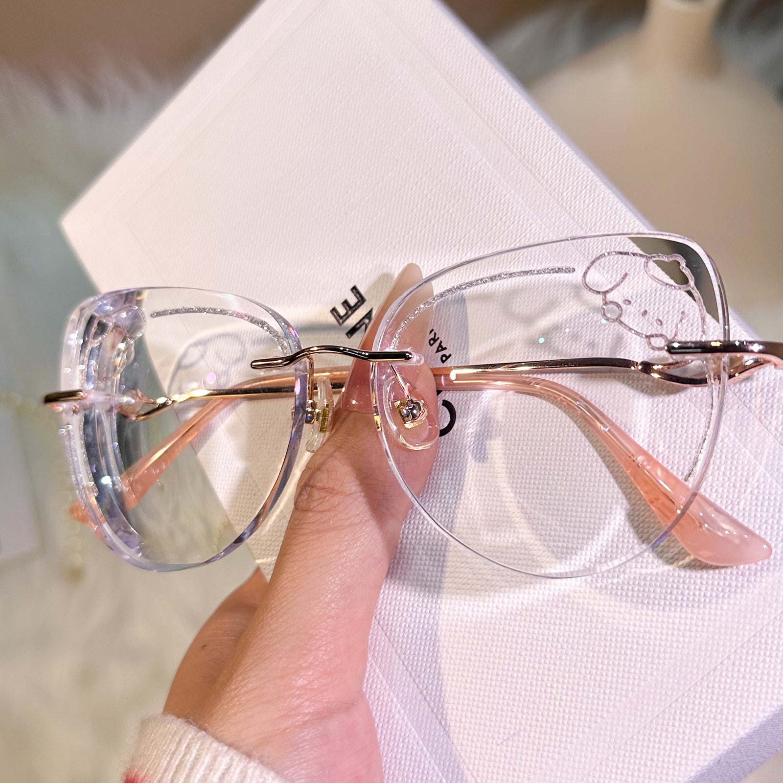 Channel the irresistibly cute vibes of Pompompurin with these charming rimless glasses. Featuring a delightful yellow puppy design and sparkling glitter accents on the lenses, this pair is a perfect blend of whimsy and style. A must-have accessory for lovers of all things kawaii!