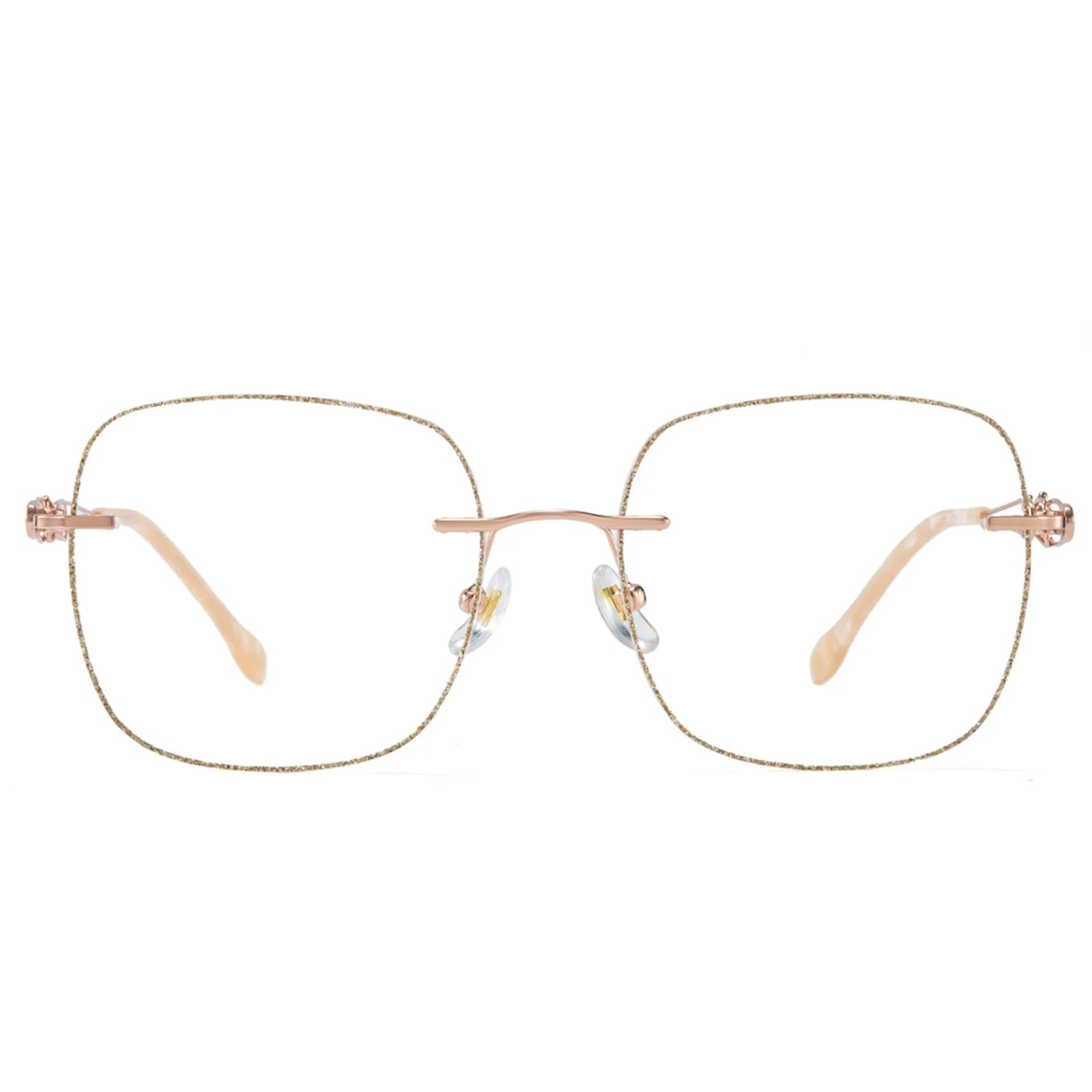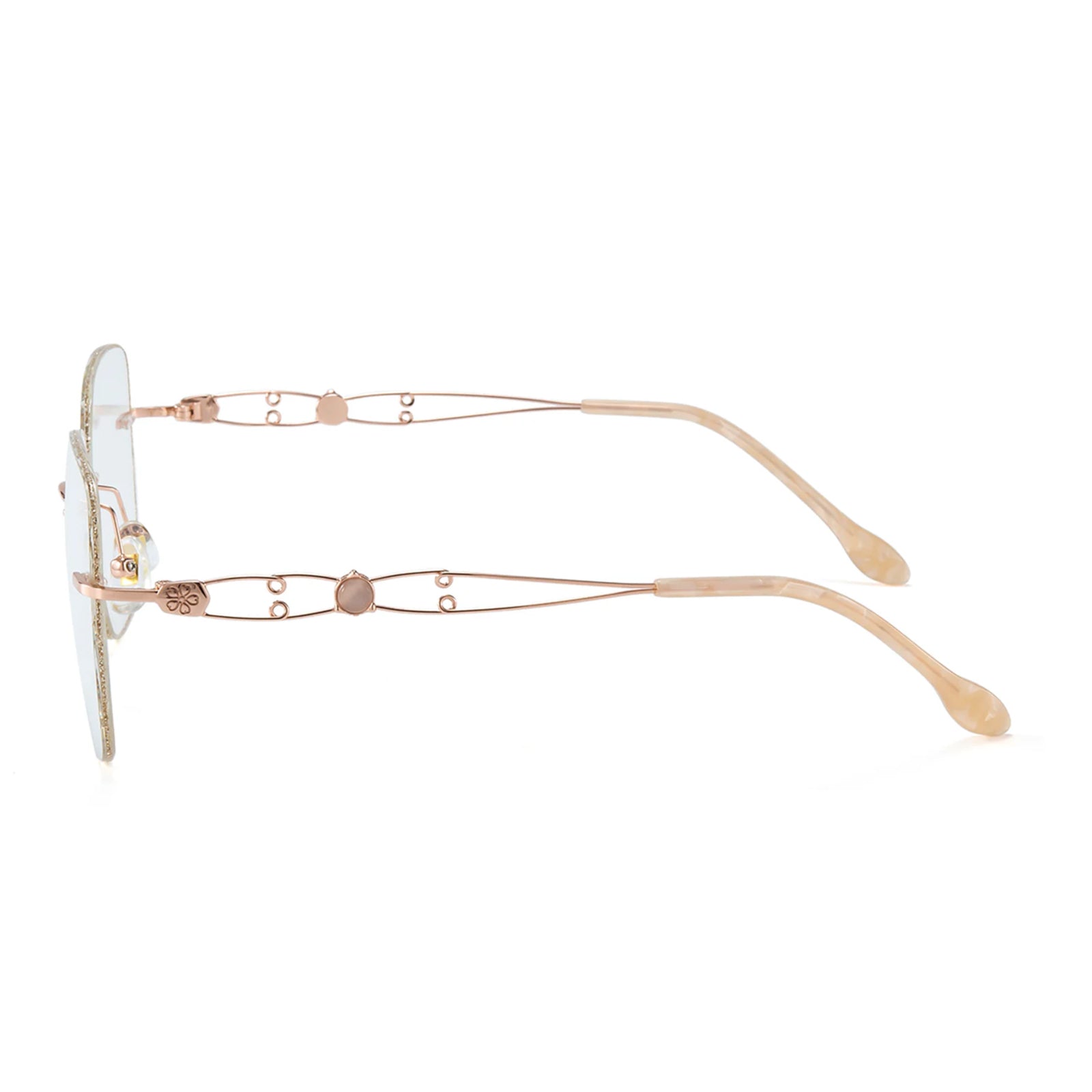 Exquisite roségoldlose Brille mit einzigartig gestalteten Tempeln, die mit Blumenmustern und zarten Schmuckakzenten geschmückt sind. Diese charmanten und edlen Rahmen erhöhen Ihren Stil mit ihrer raffinierten Eleganz und komplizierten Details. Perfekt für diejenigen, die Luxus und raffinierte Schönheit in ihren Brillen schätzen.
