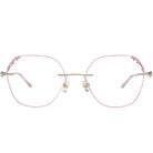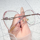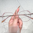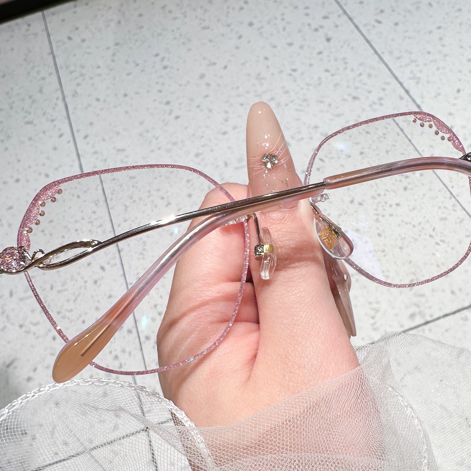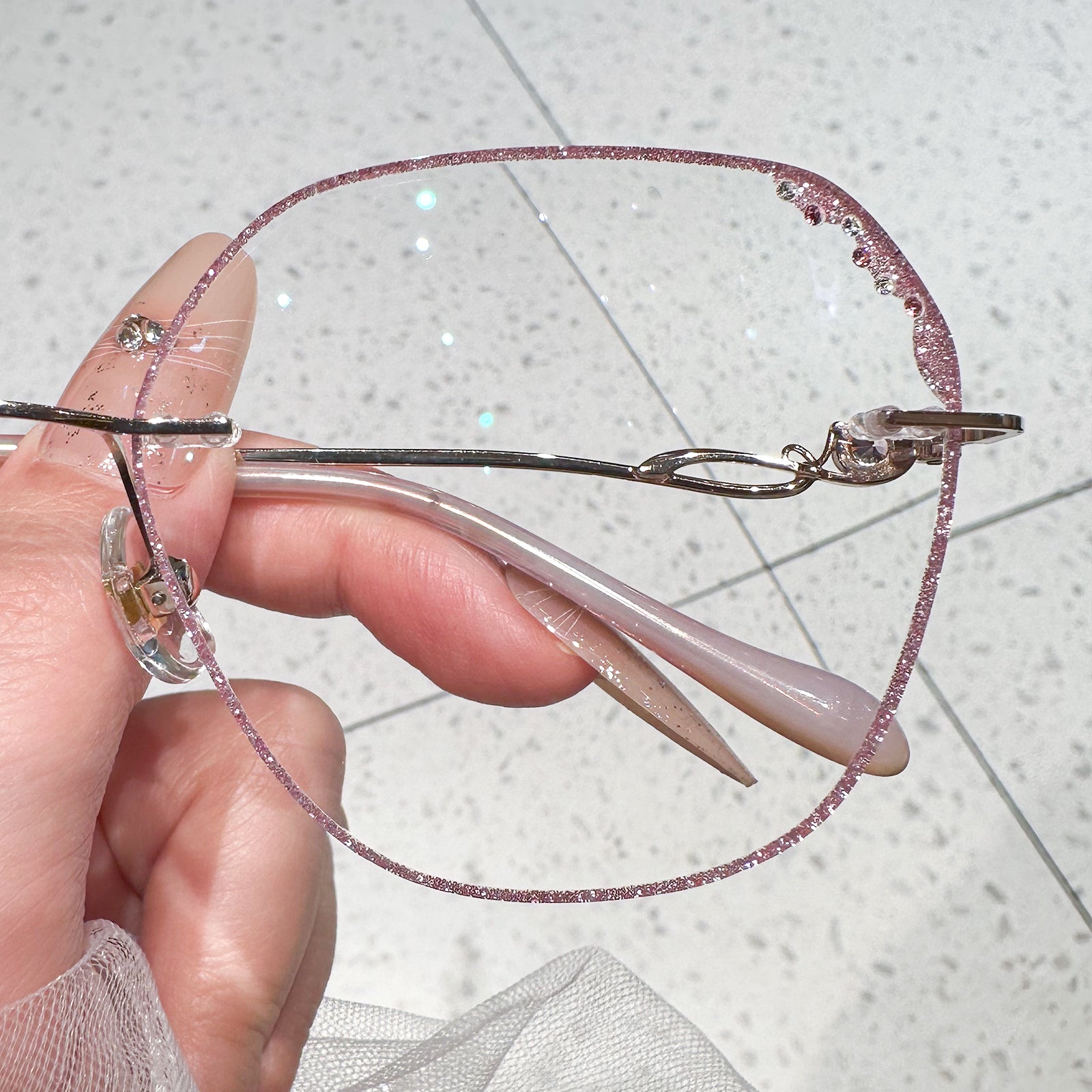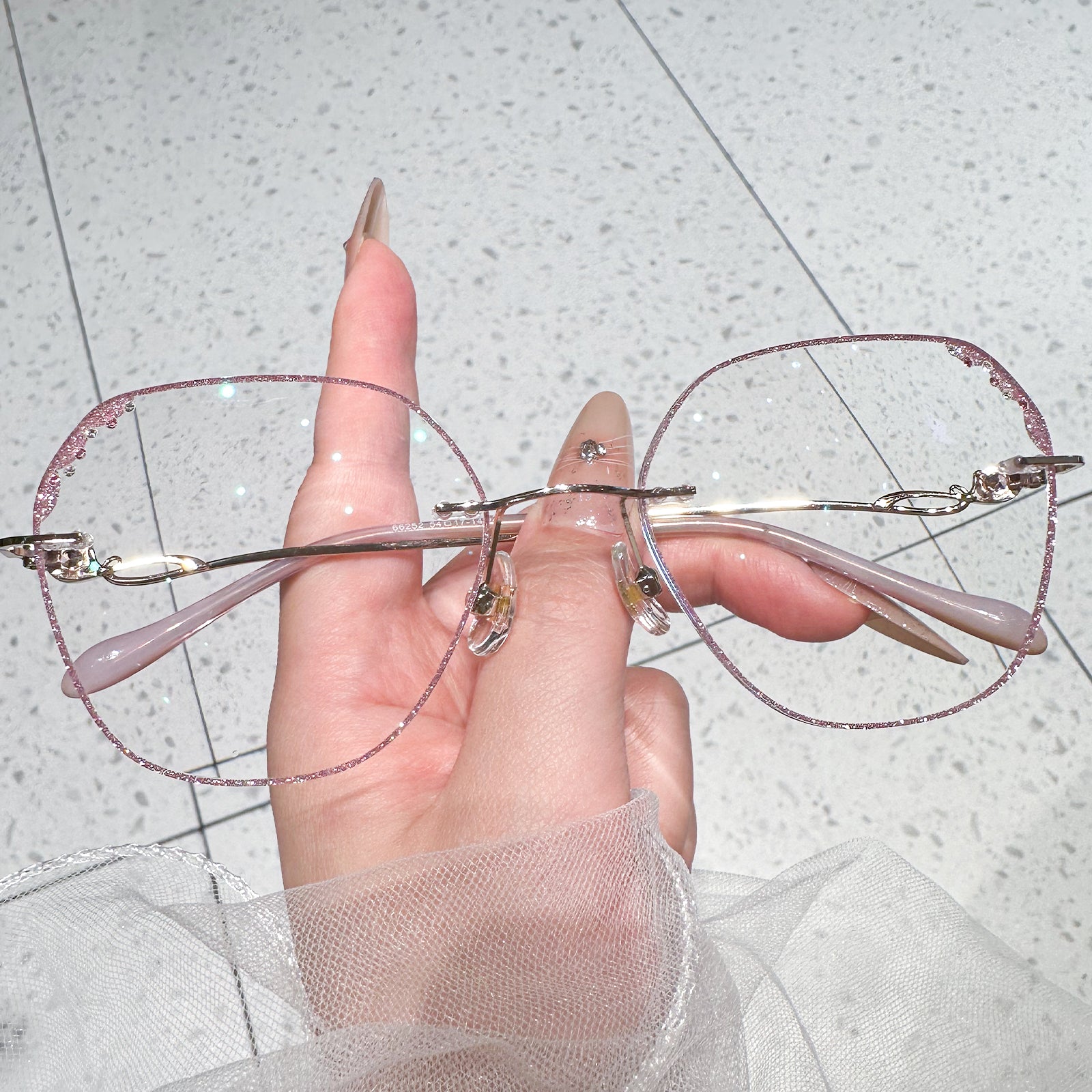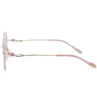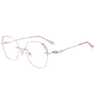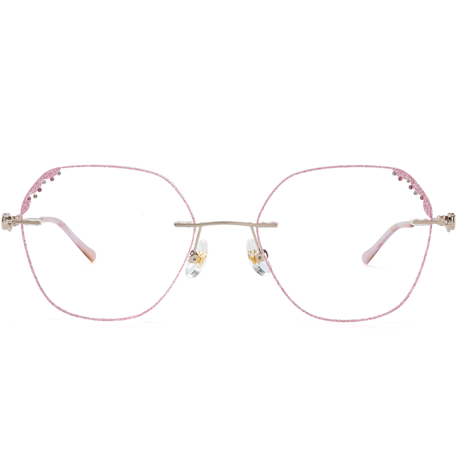 Elegante rosa Randbrille. Die Objektive sind mit funkelnden Diamanten geschmückt. Die ausgehöhlten Tempel, die ebenfalls mit Diamanten verziert sind, verleihen einen Hauch von Luxus und Raffinesse. Diese Brille ist perfekt für ein stilvolles und glamouröses Statement ausgelegt, um zu glänzen.