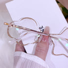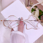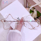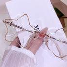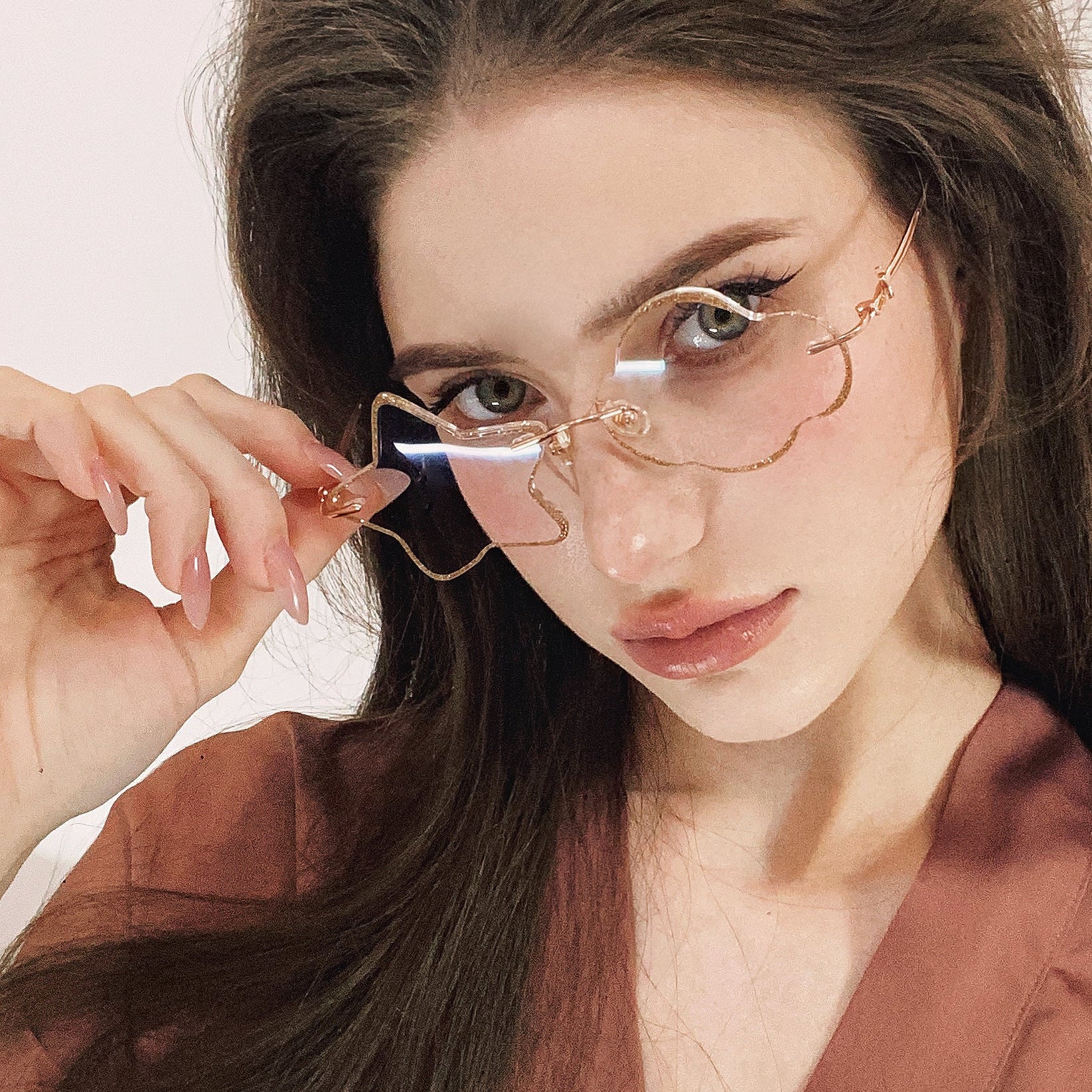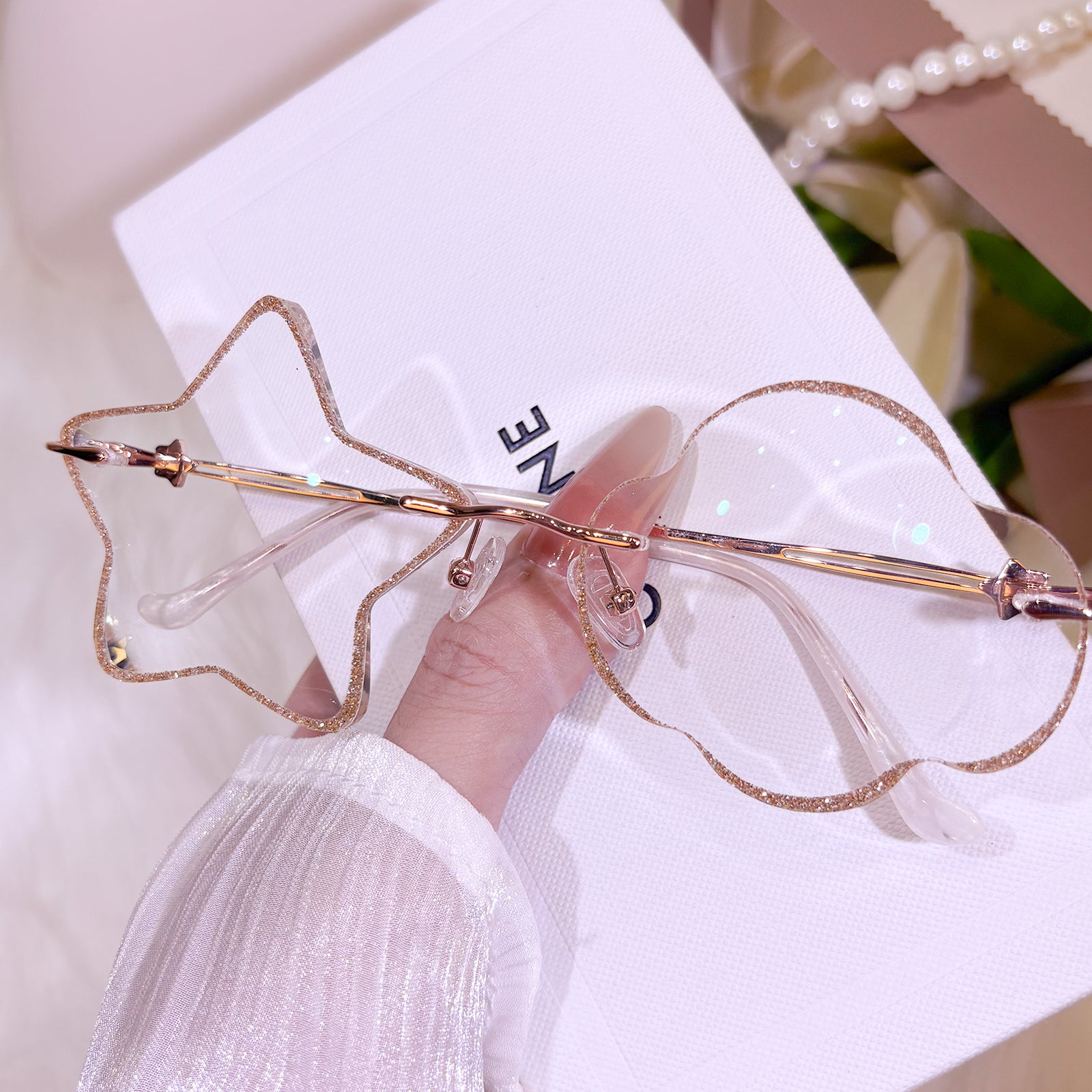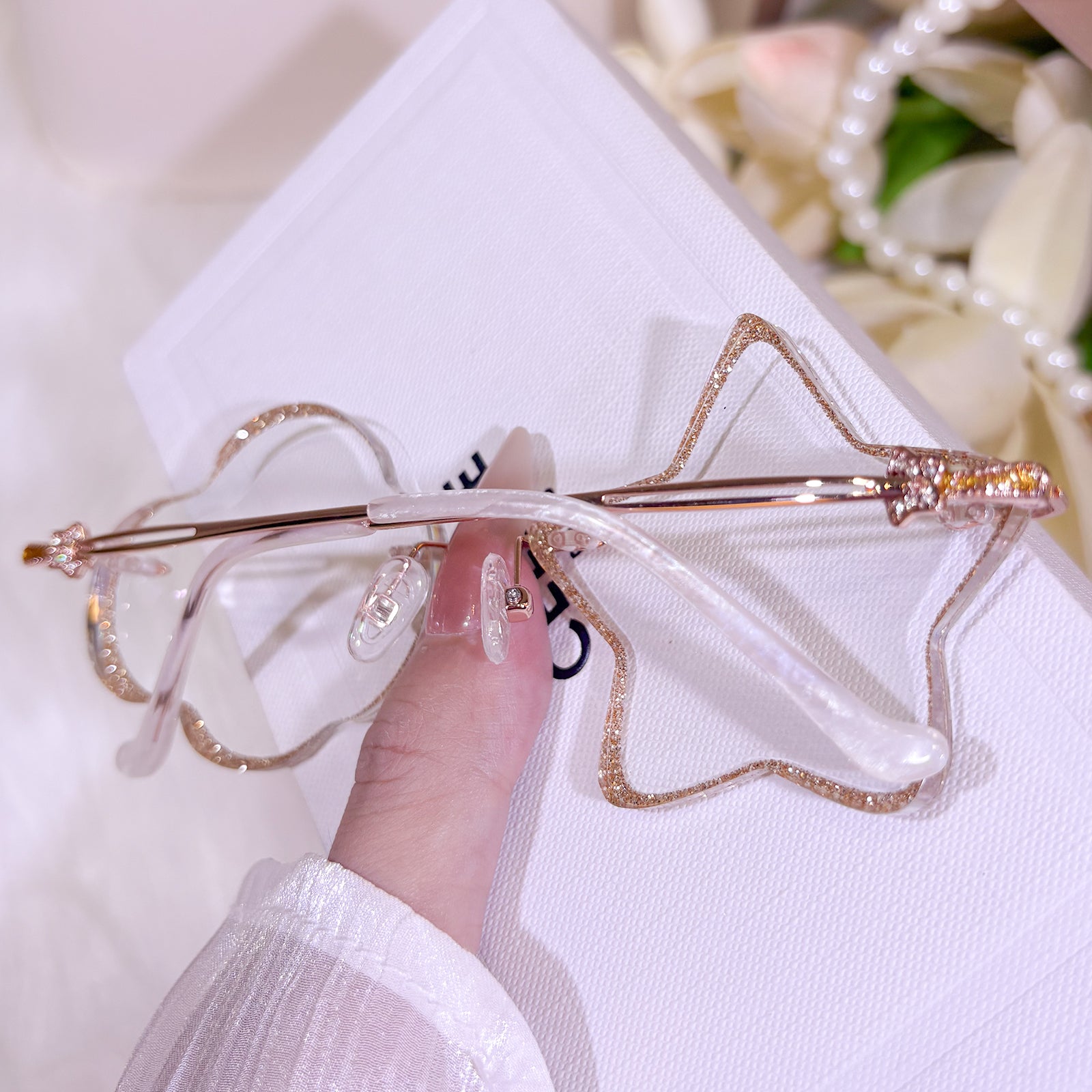 | Exclusive Design | Step into the spotlight with these rimless glasses featuring a whimsical star-and-cloud lens design, outlined with sparkling champagne-gold glitter for a dreamy shimmer. The delicate temples are adorned with tiny star accents, making this enchanting accessory both playful and refined.