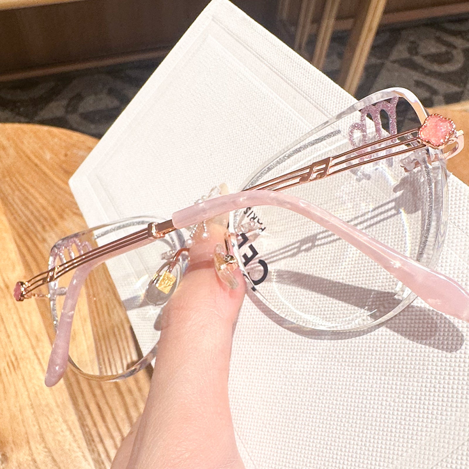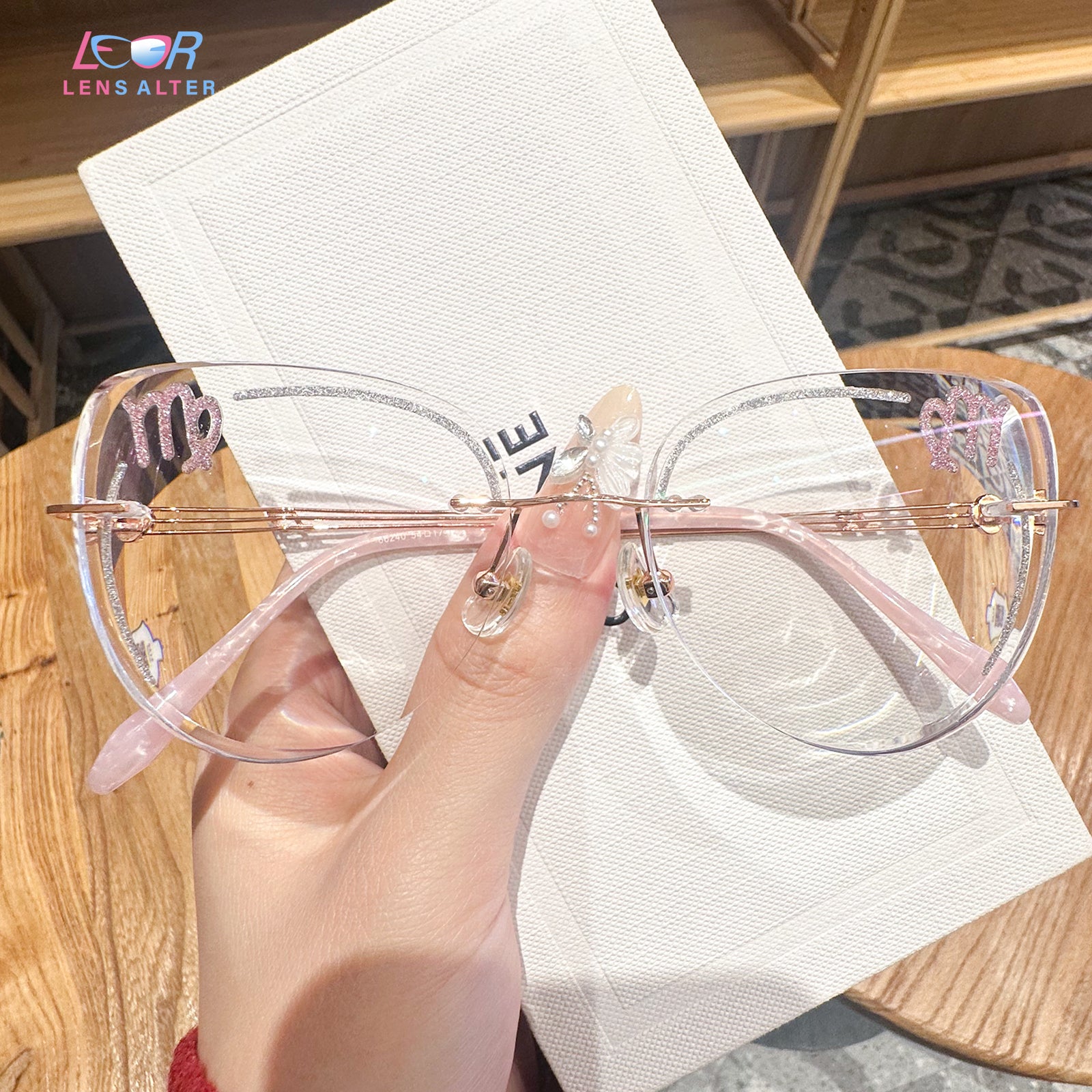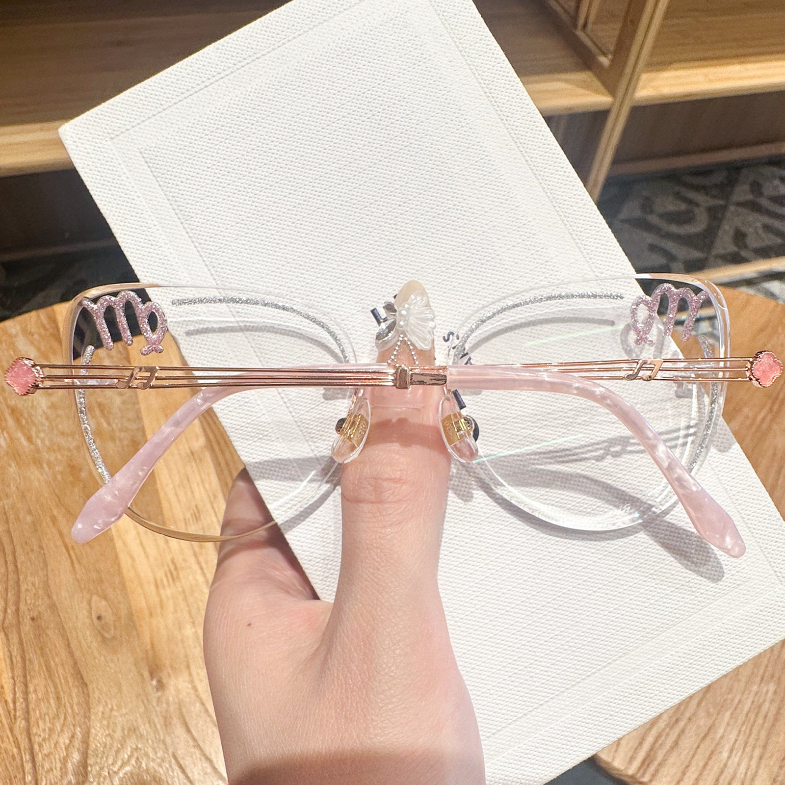 Practical and detail-oriented, Virgo is drawn to order and refinement. Sleek and sophisticated, the Virgo-inspired rimless glasses feature minimalist clear lenses with pink accents. The clean design and precise detailing mirror Virgo's natural elegance and attention to detail.