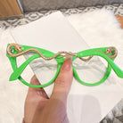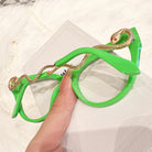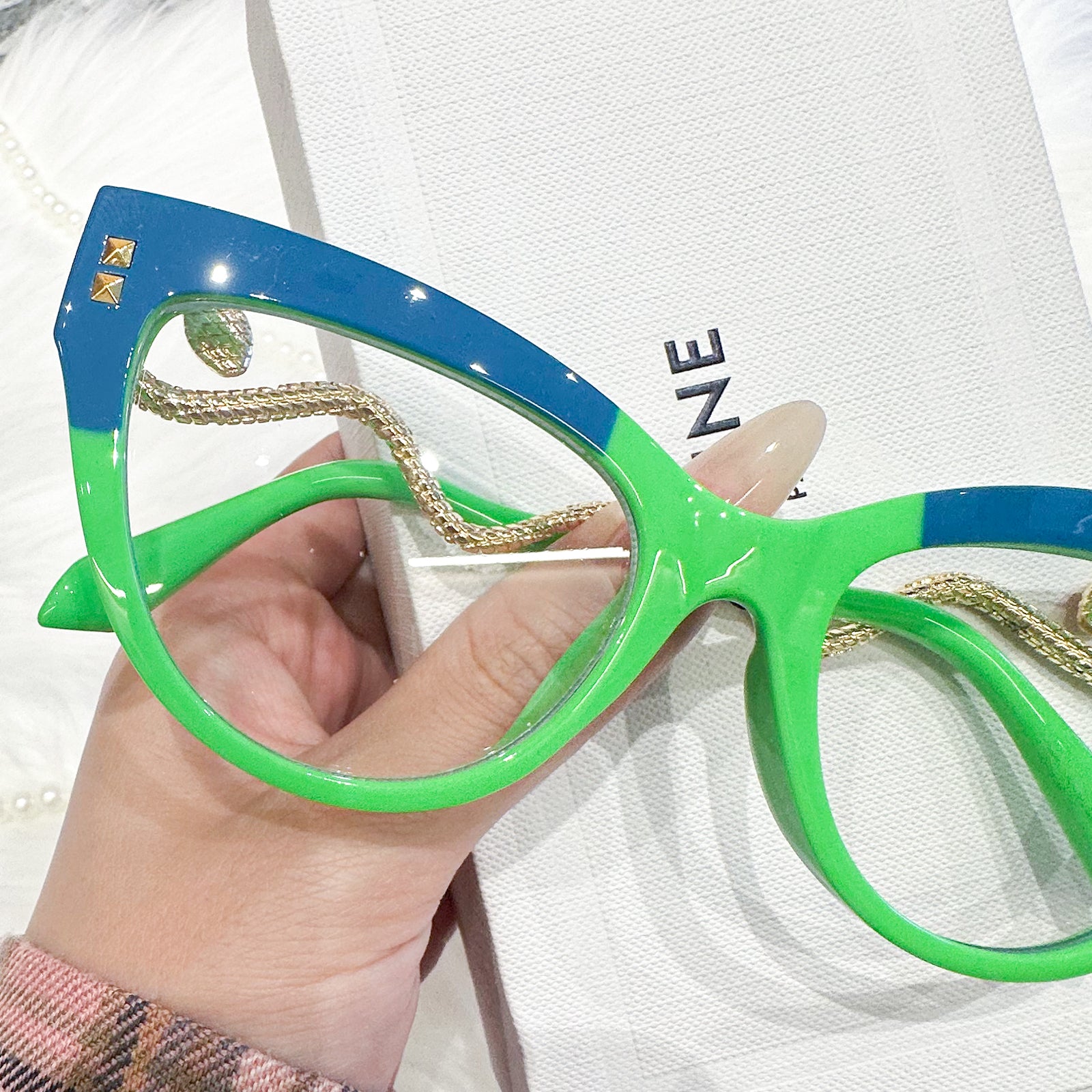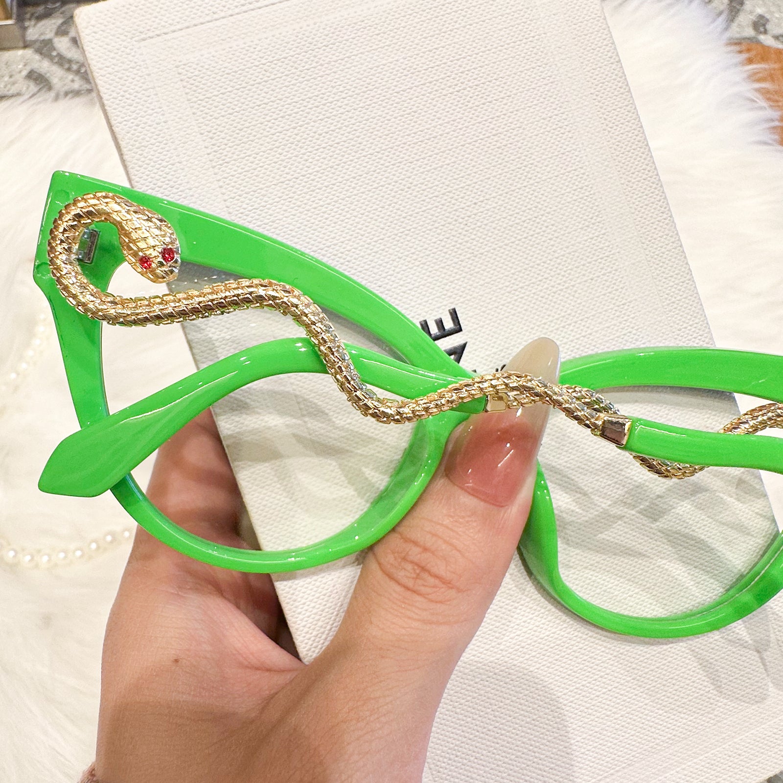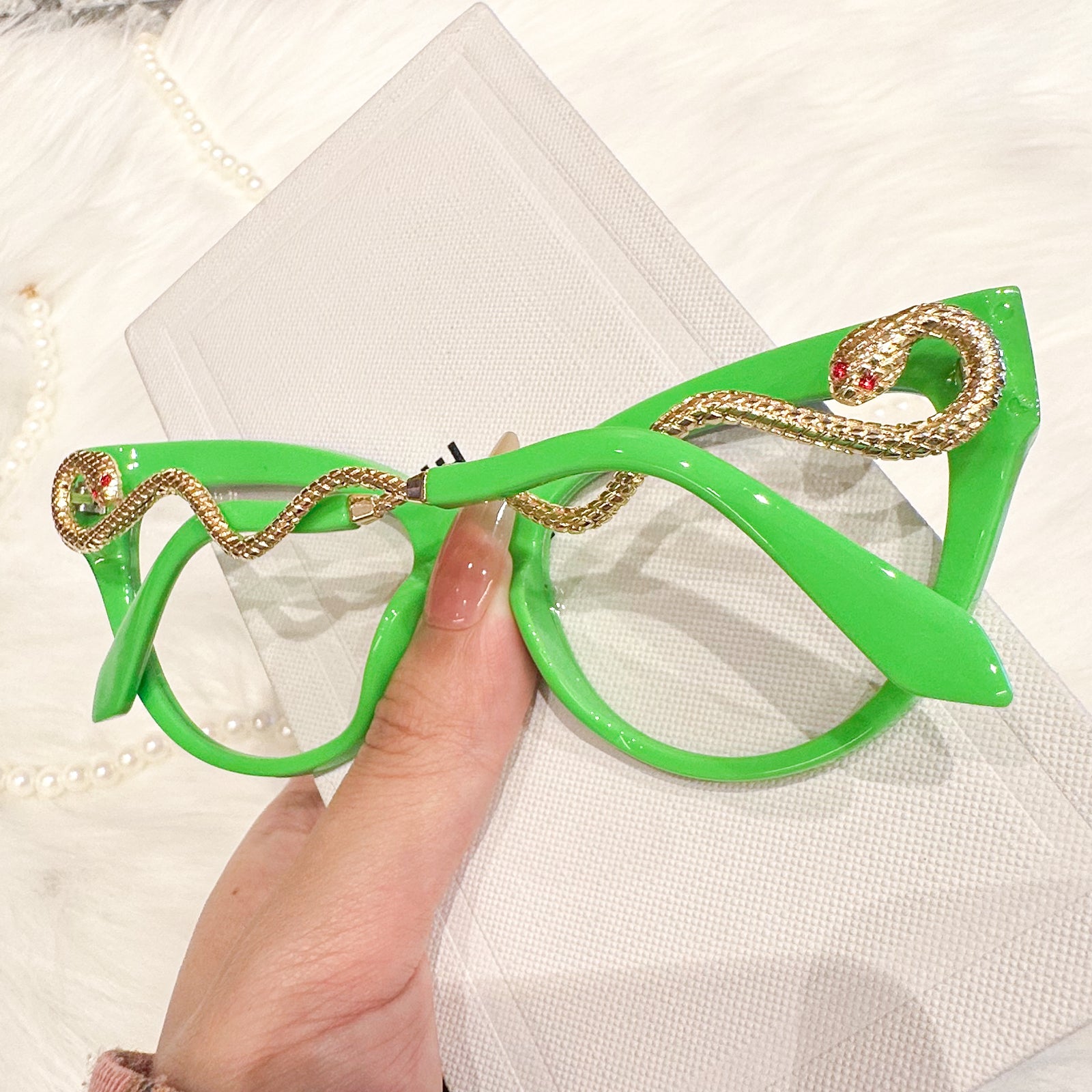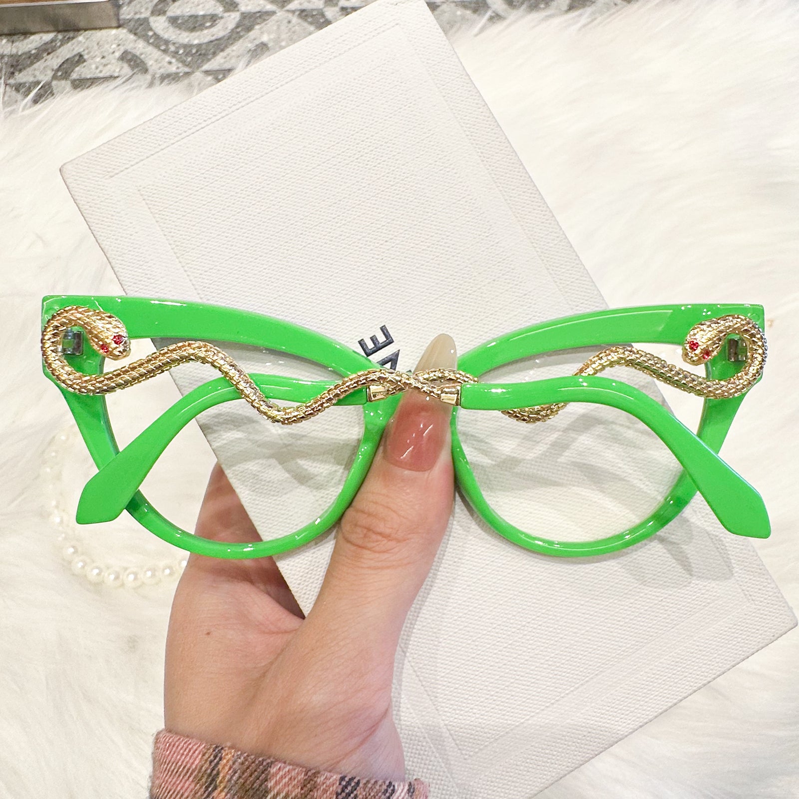 These green cat-eye glasses are a bold blend of elegance and edge. The striking green frames exude vintage charm, while the temples feature a delicate snake slithering design that adds a mysterious, high-fashion twist. Perfect for those who dare to be different and love accessories with a story.