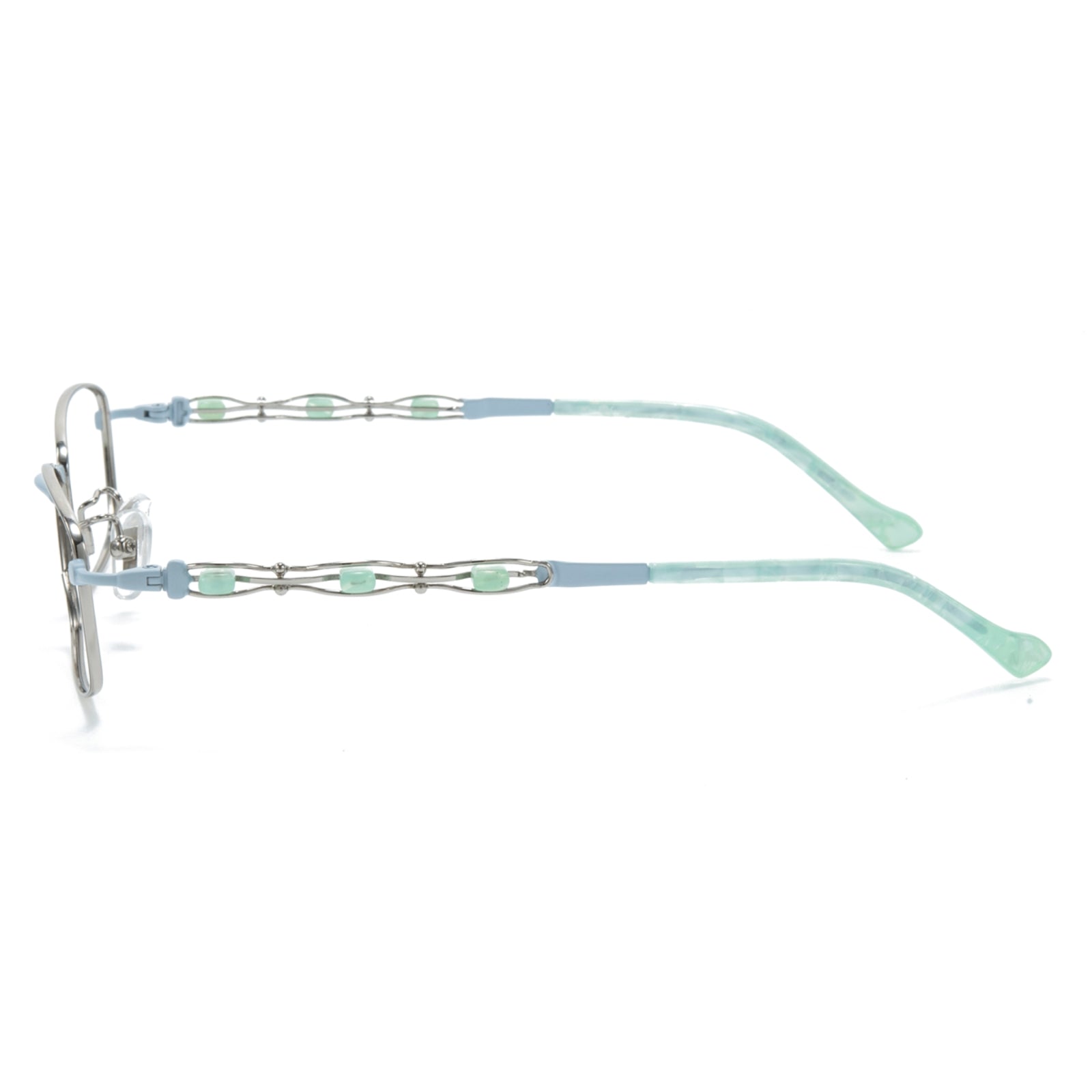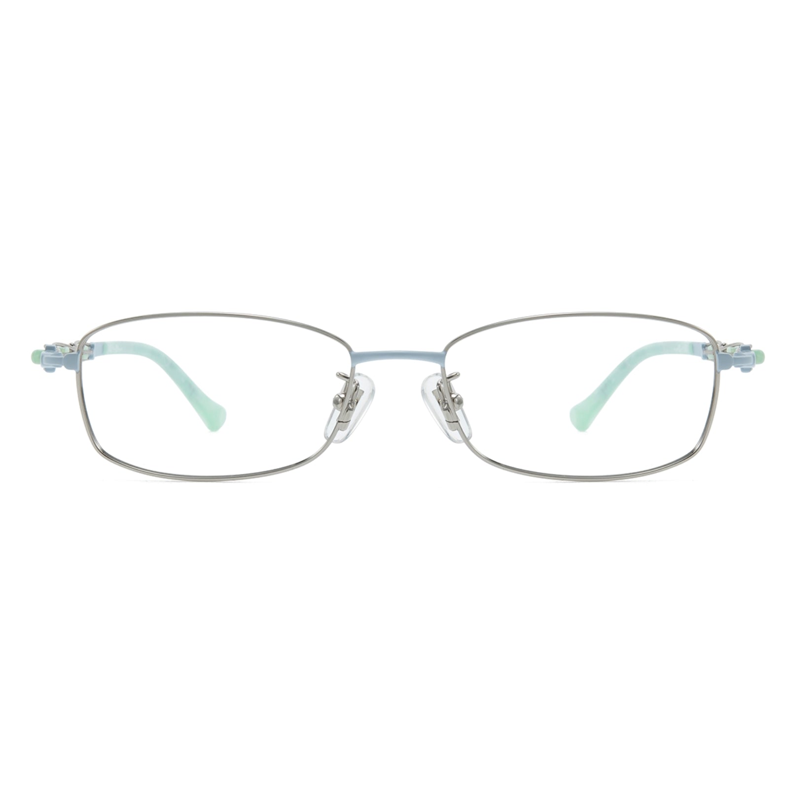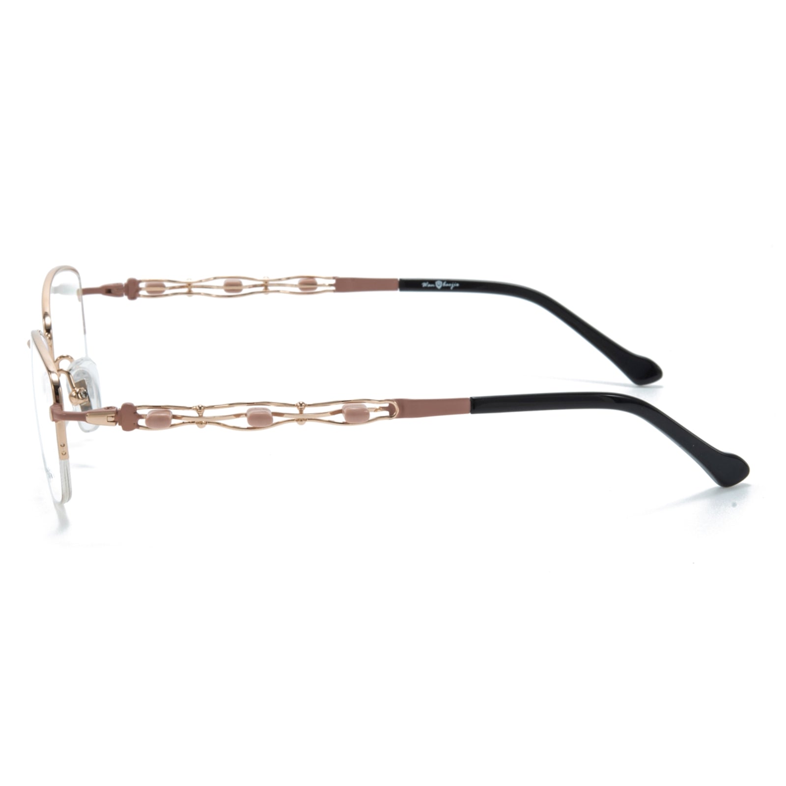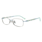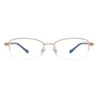 Sleek rectangular half-rim metal glasses with exquisitely designed temples. The refined structure enhances a sophisticated and modern look, while the intricate details on the temples add a touch of elegance, making them a captivating choice for everyday wear.