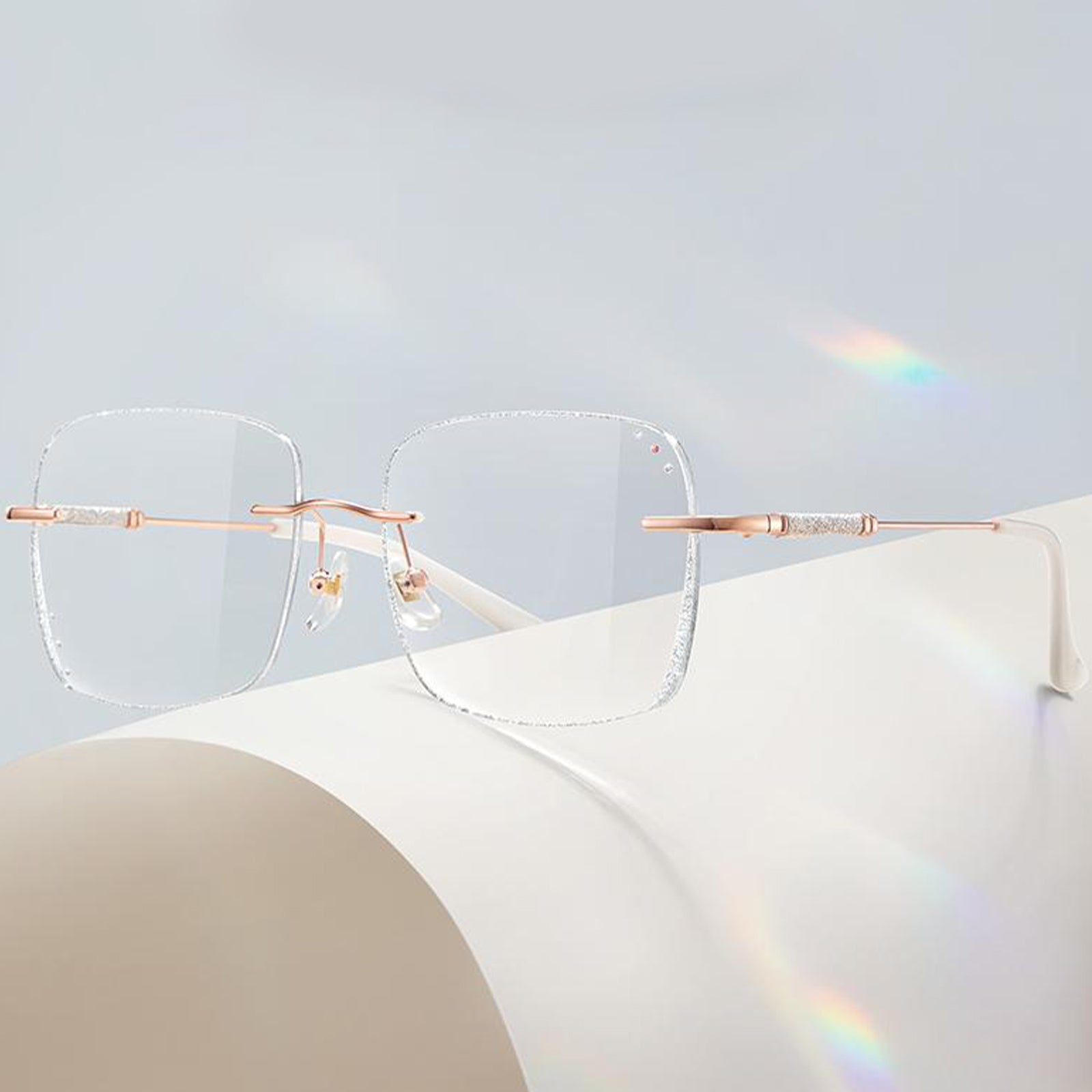 The chic women eyeglass is decorated with shimmering diamonds and accompanied by innovative eye makeup filters. The glimmering diamonds add a touch of opulence and luxury, while the delicate shiny silver edges impart a sense of nobility and cool sophistication.