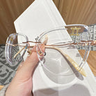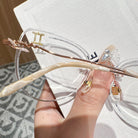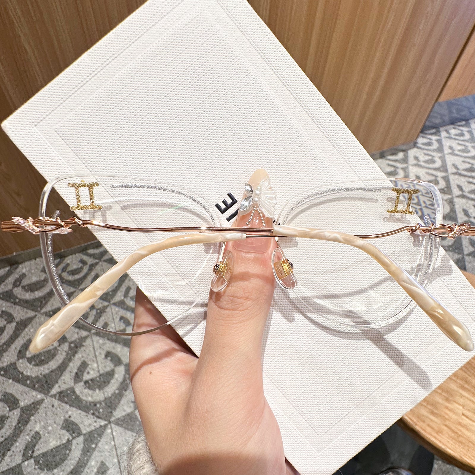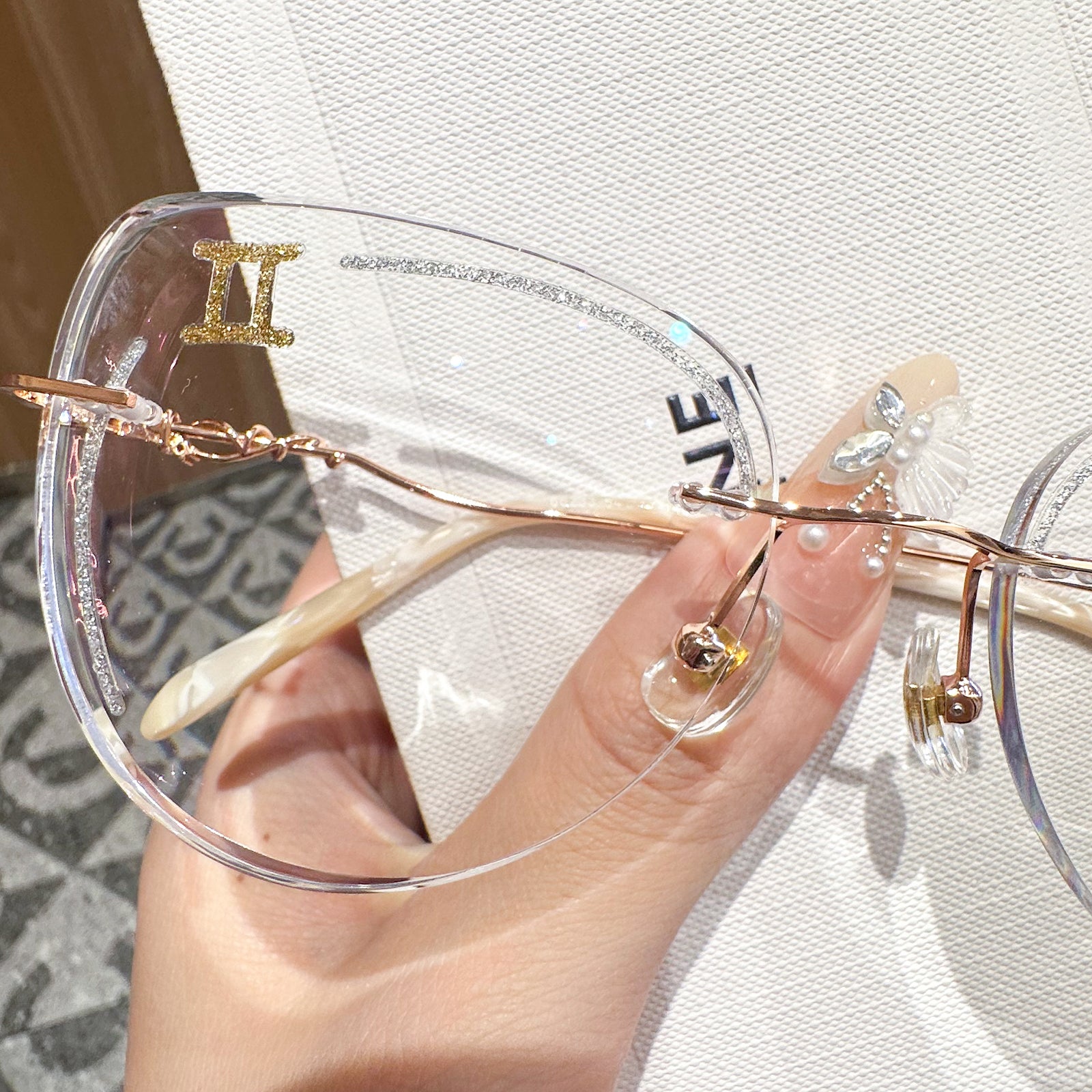 Charming and adaptable, Gemini is a master of communication and versatility. Playful and versatile, the Gemini-inspired rimless glasses showcase golden glitters on lenses and finely crafted metal temples. Light and flexible, they reflect Gemini's dynamic and ever-changing spirit.