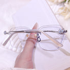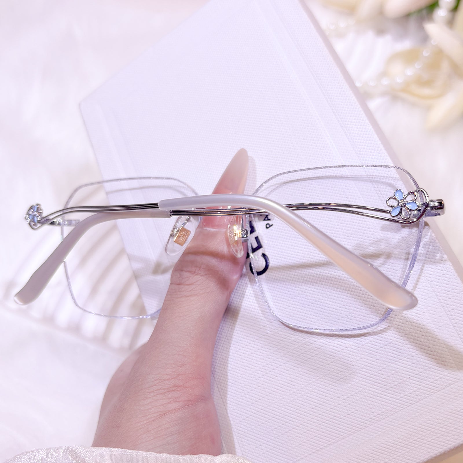 | Exclusive Design | These elegant rimless geometric glasses are delicately framed with silver glitter around the lenses, adding a soft sparkle. The slender temples are adorned with tiny floral accents, creating a refined and feminine charm.