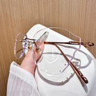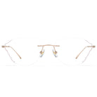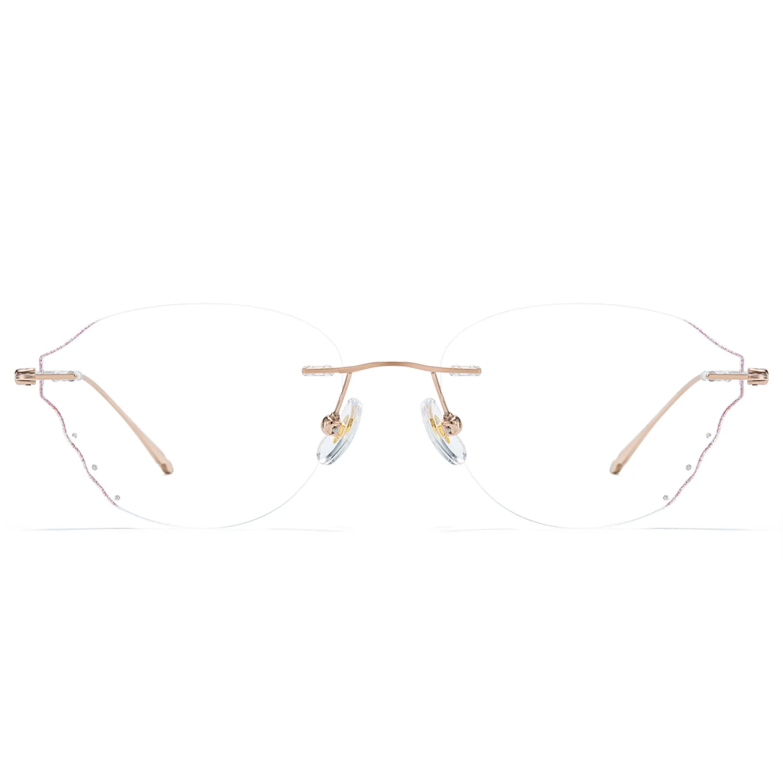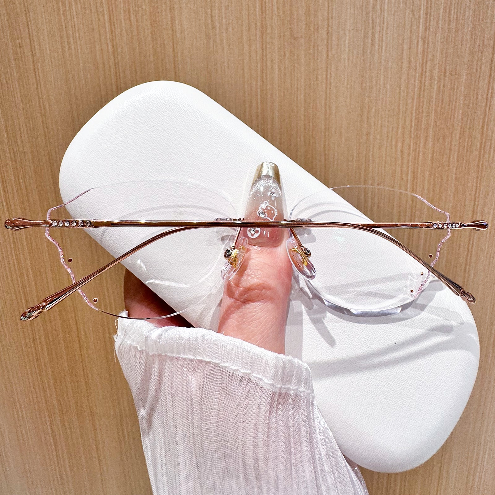 Delight in graceful sophistication with these exquisite flower-shaped rimless glasses. The soft pink design exudes timeless elegance, while the sparkling diamond accents on the temples add a luxurious touch. Perfect for women who love a blend of femininity and refinement, these frames are a stunning accessory for any occasion.