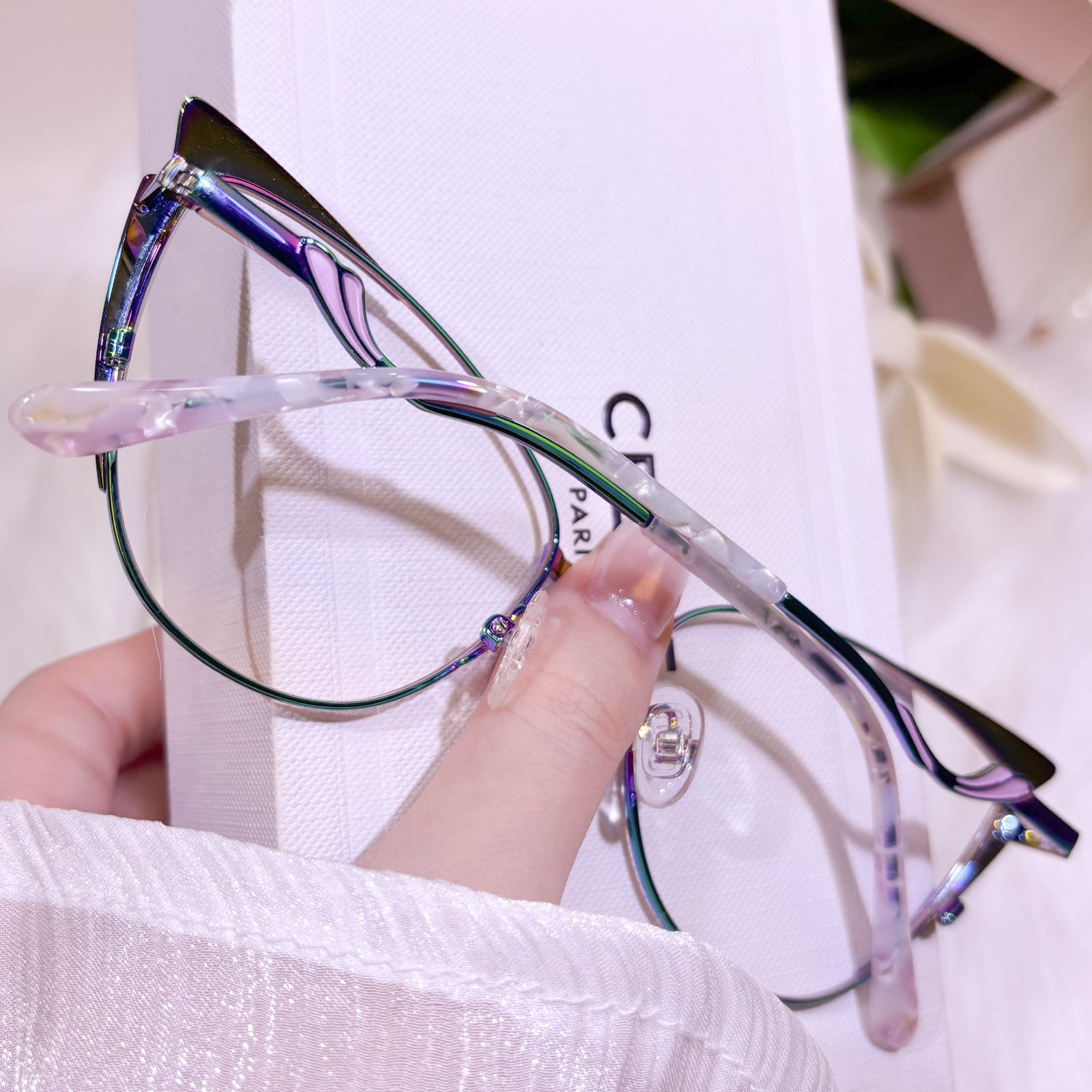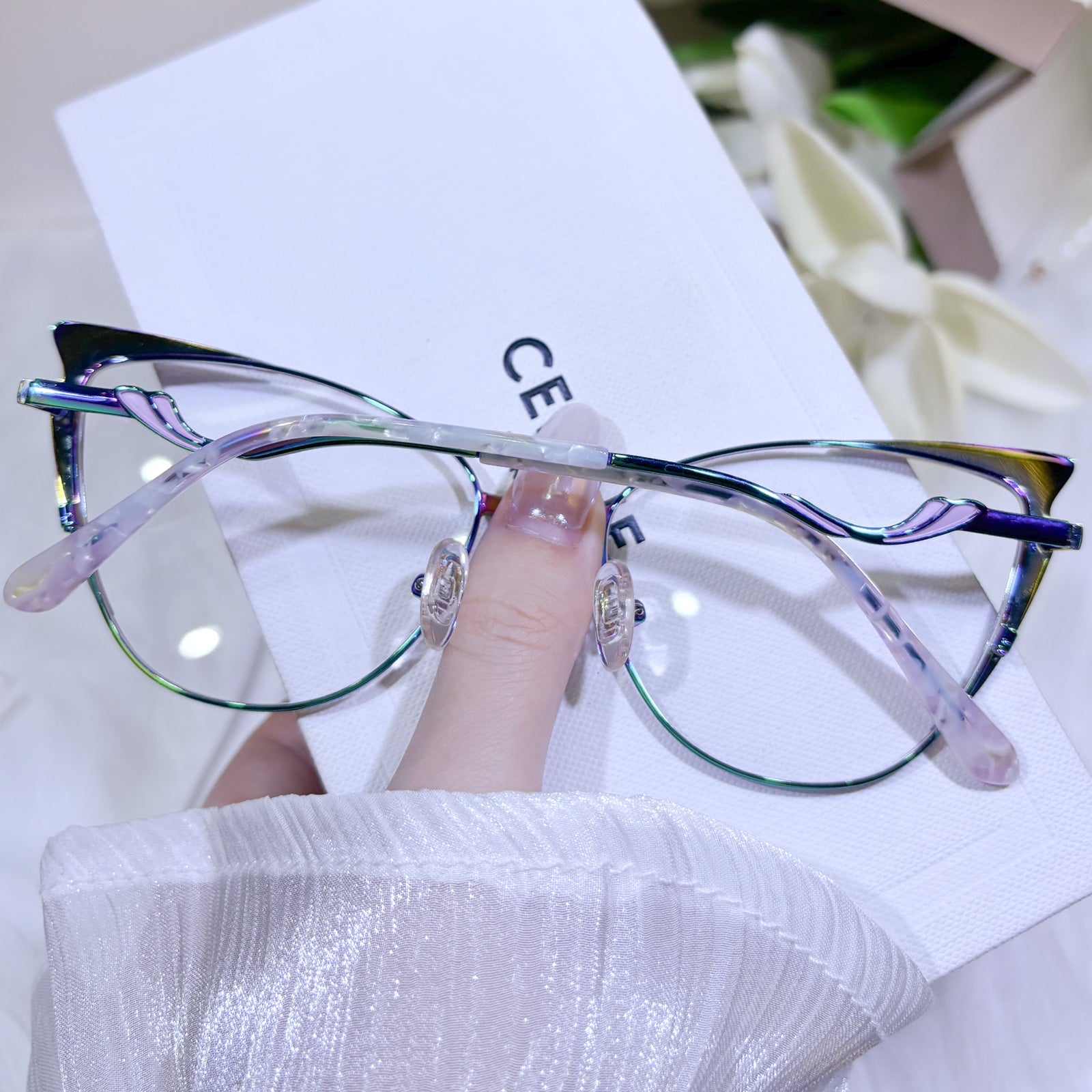 These purple cat-eye glasses feature a sleek metal frame with a bold, futuristic edge. Their cool and captivating design adds an irresistible charm, making them the perfect statement accessory for women who want to stand out in style.