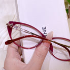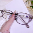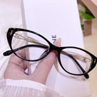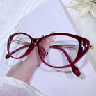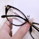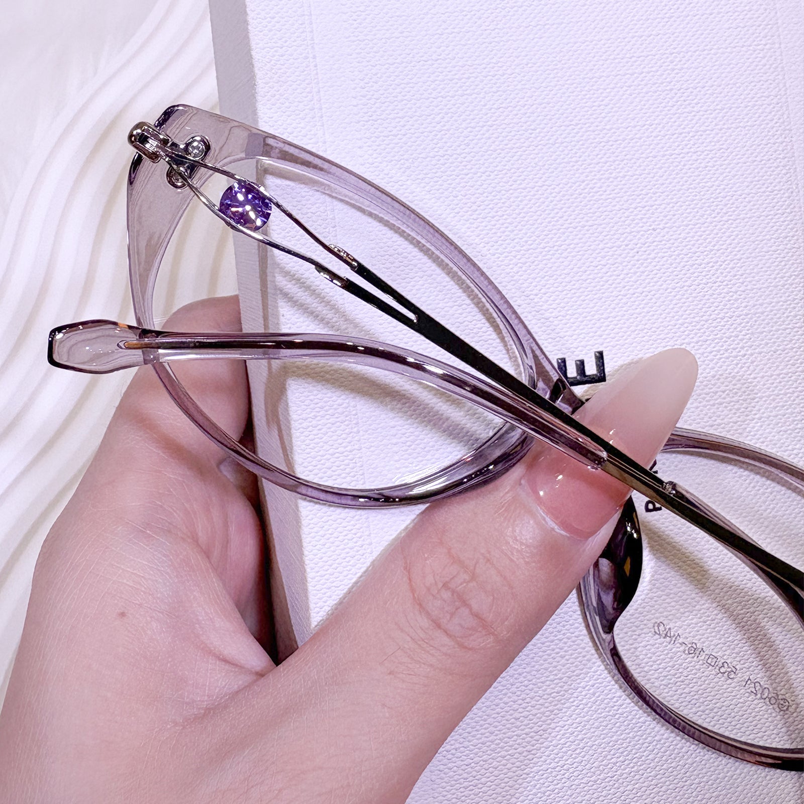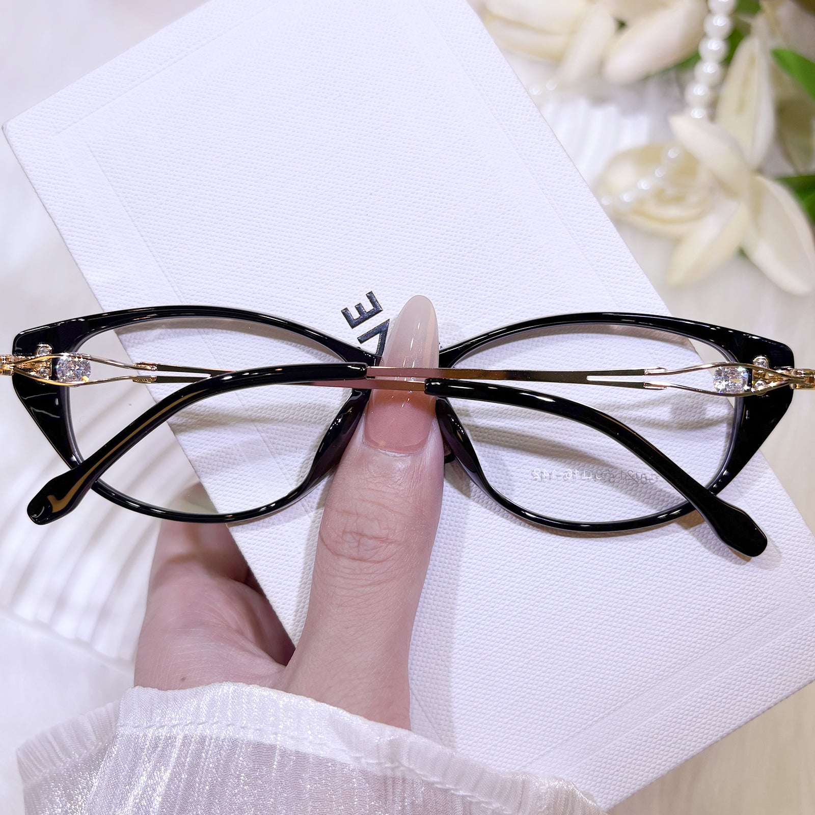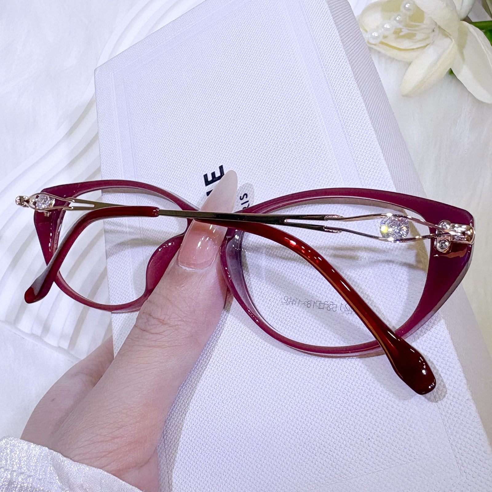 These ultra-feminine cat-eye glasses feature a refined blend of TR and metal materials for both style and durability. The temples are embellished with sparkling diamond accents, adding a luxurious and elegant flair that makes them perfect for women who love a touch of glamour.