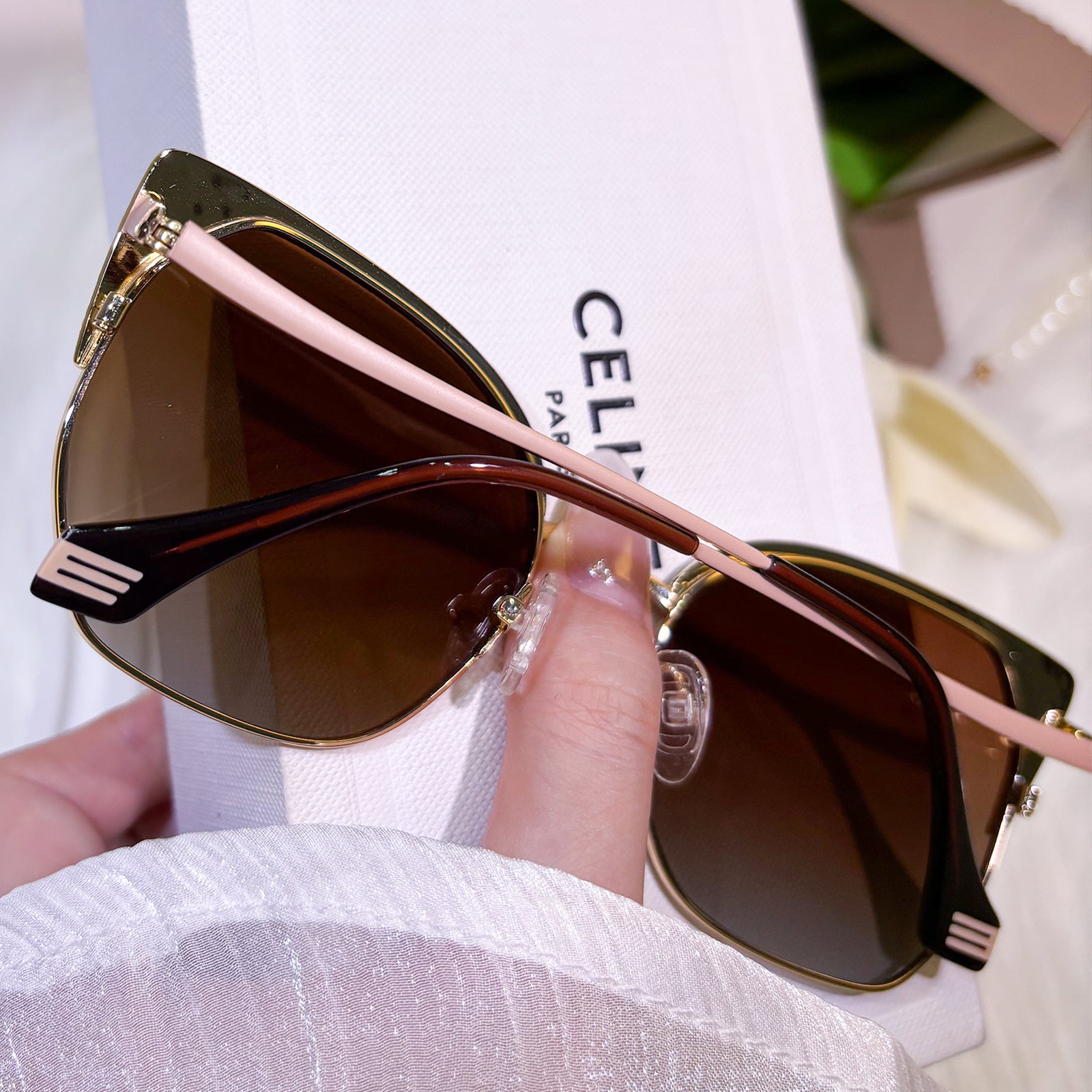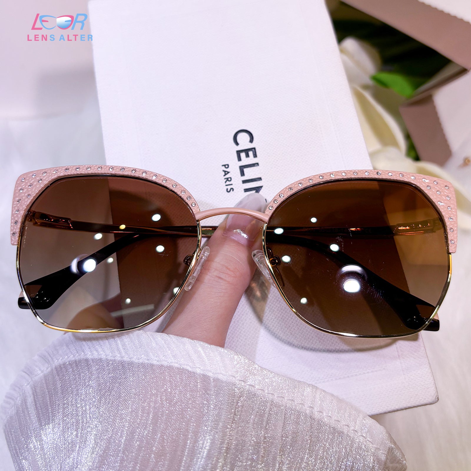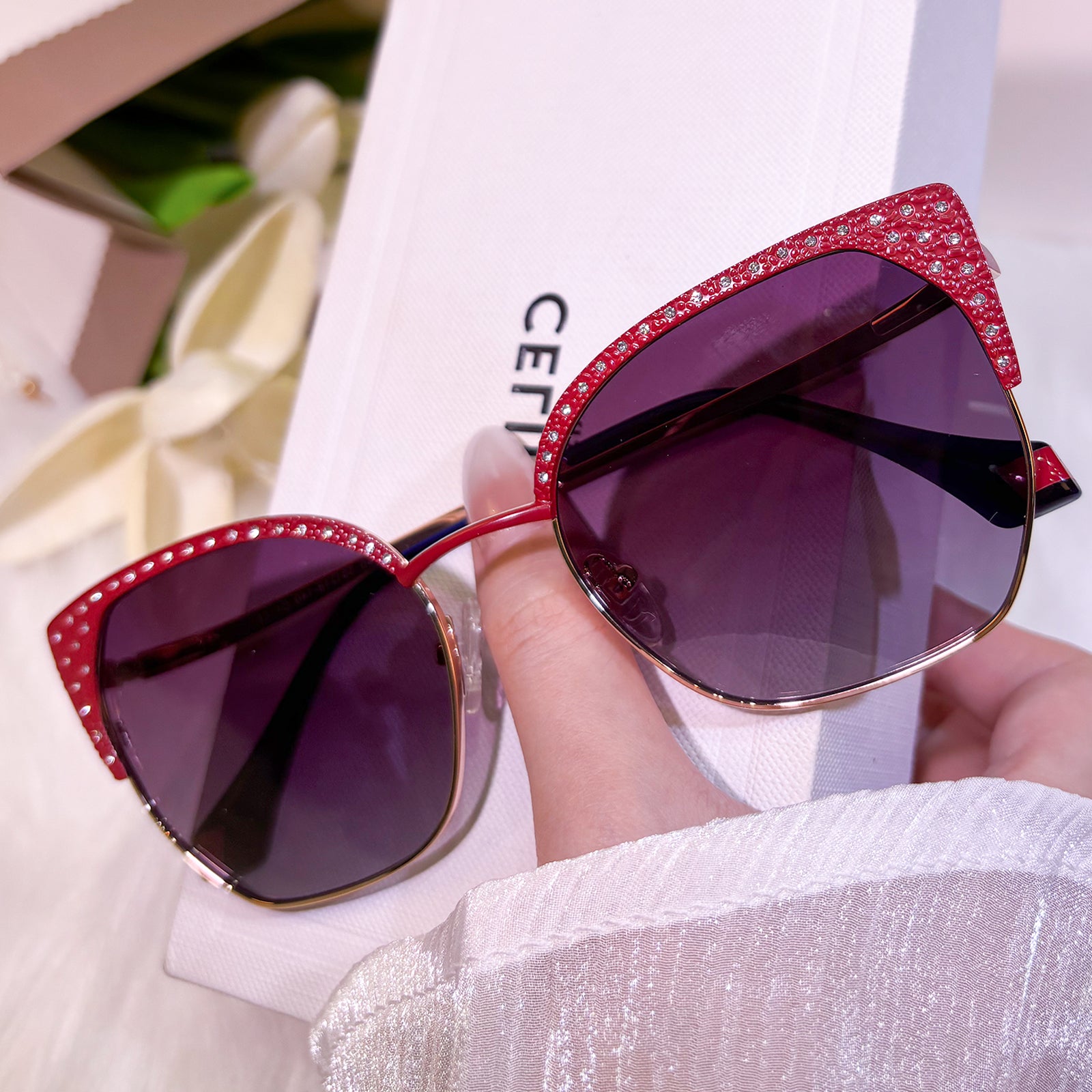 These candy-colored cat-eye sunglasses are dazzlingly adorned with sparkling diamonds, blending sweetness with luxury. Their playful yet glamorous design makes them the perfect statement accessory for fashion lovers who want to shine.