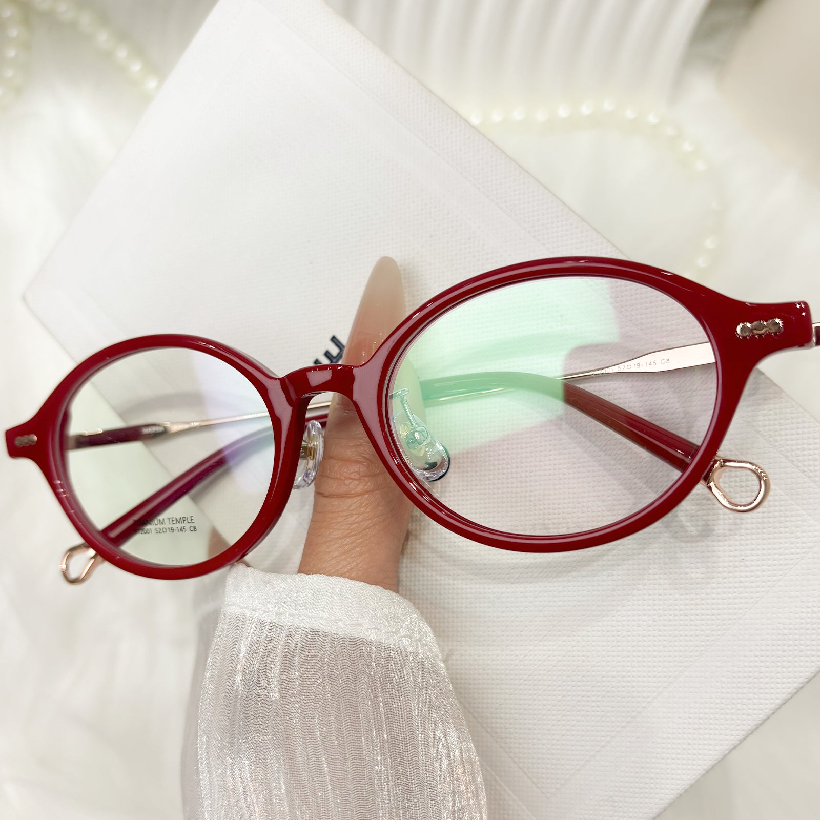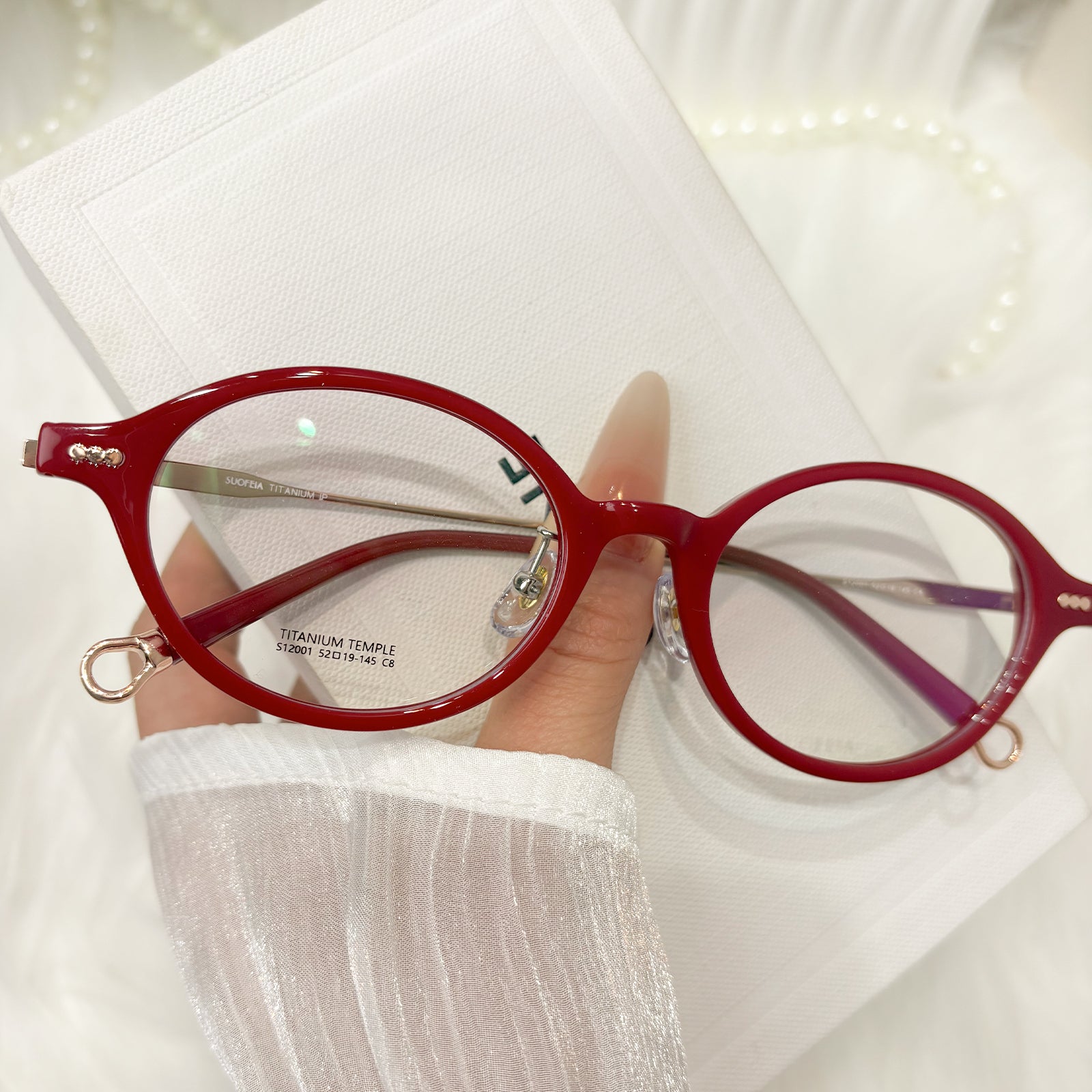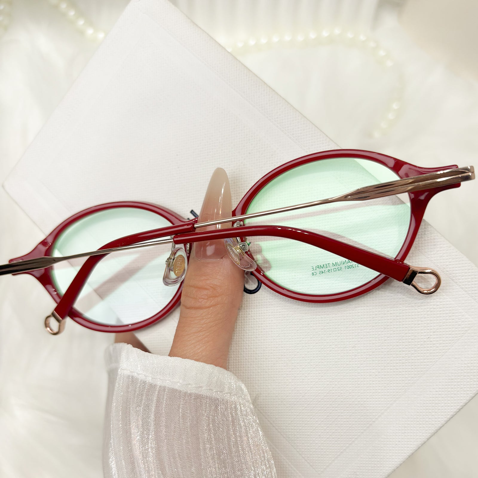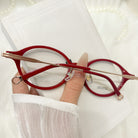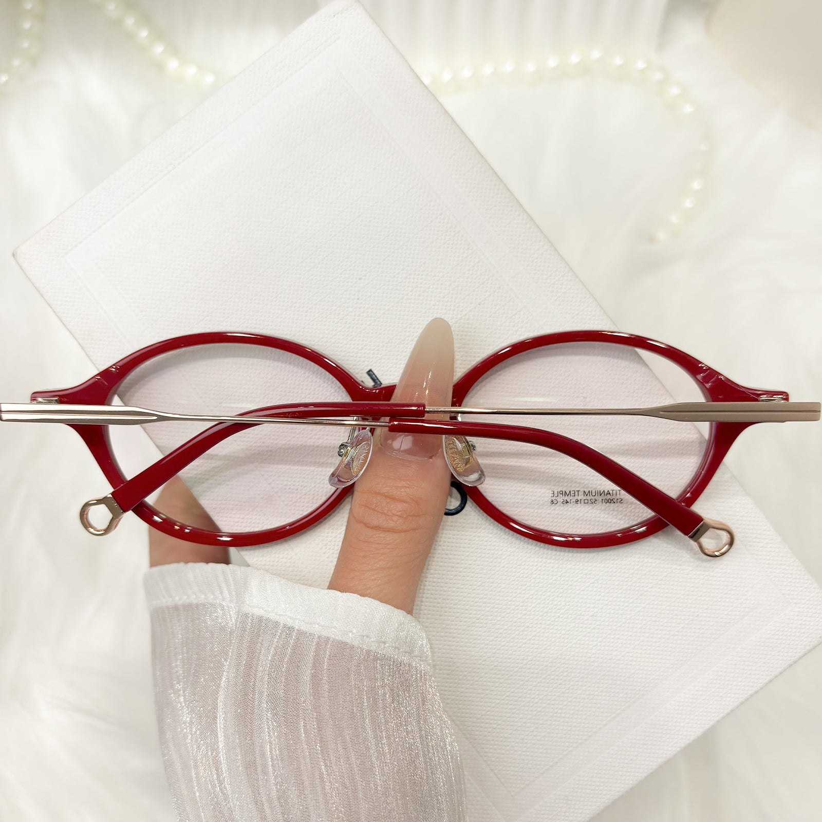 Crafted from lightweight TR material, this oval-frame glasses radiate playful mystery with a fiery red gradient that deepens like a secret waiting to be told. The soft elliptical shape balances whimsical charm with effortless wearability, perfect for the spirited woman whose style dances between bold imagination and everyday enchantment.