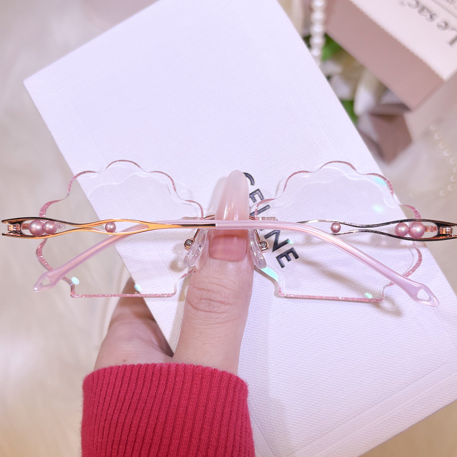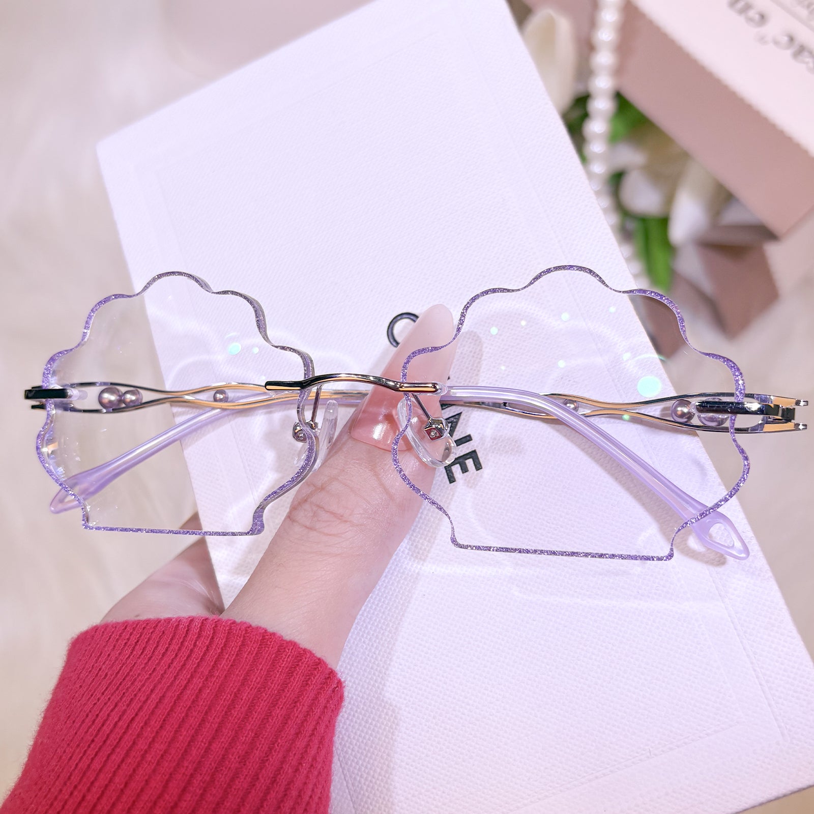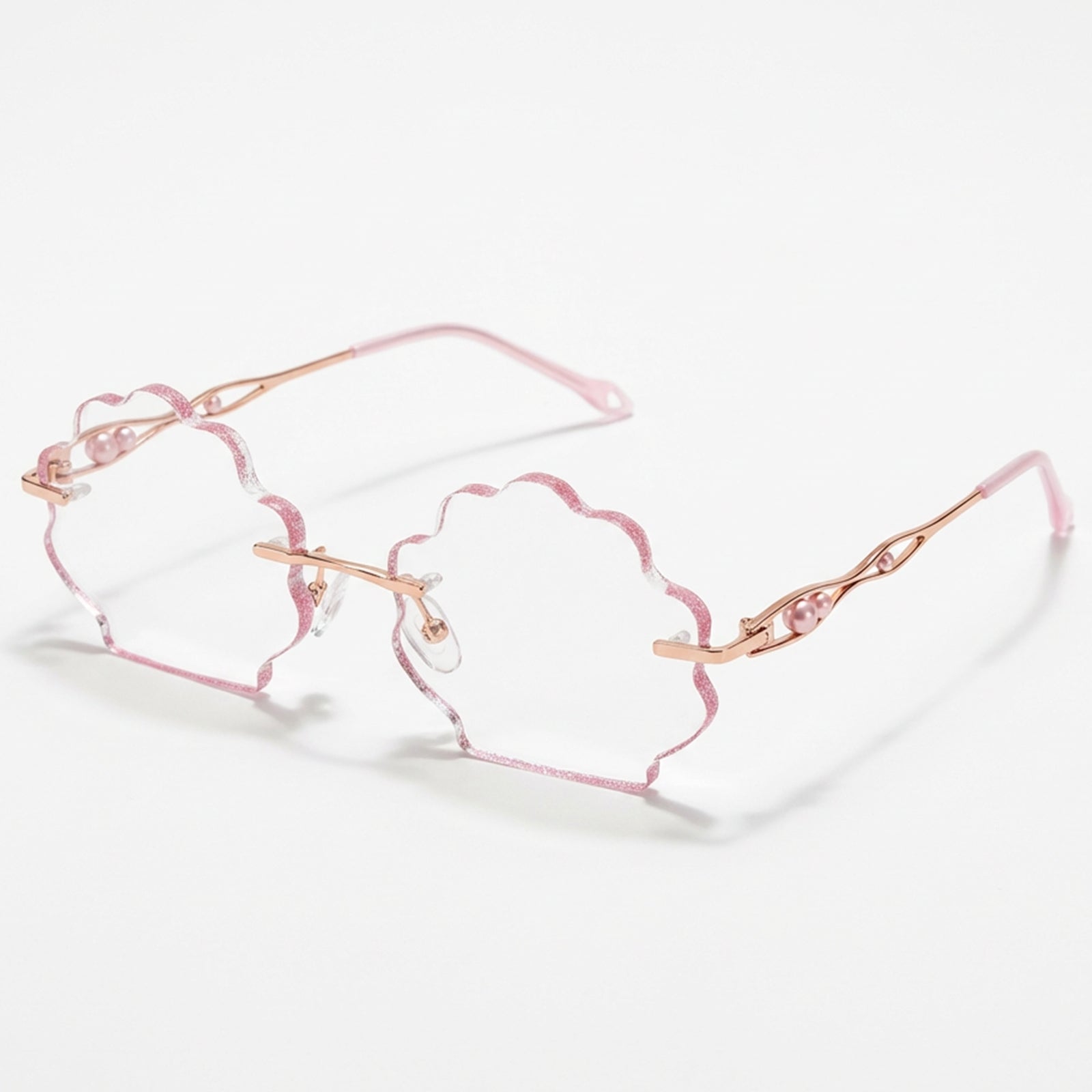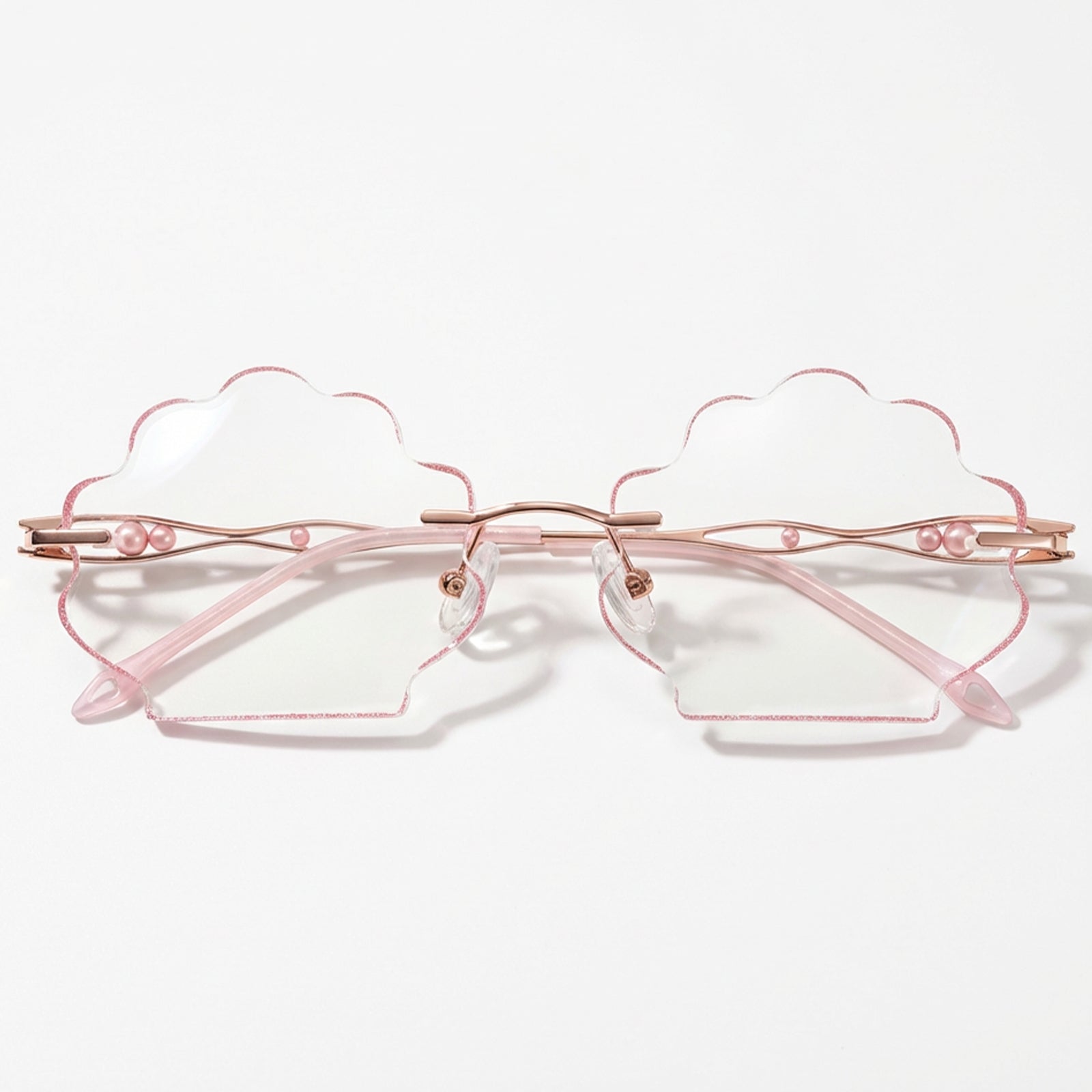 | Exclusive Design | This seashell-shaped rimless eyewear captures the magic of the deep sea, with shimmering glitter tracing the edges of the lenses and delicate pearls adorning the temples. Lively, elegant, and beautifully ocean-inspired, it looks just like a sparkling shell lifted straight from underwater treasure.