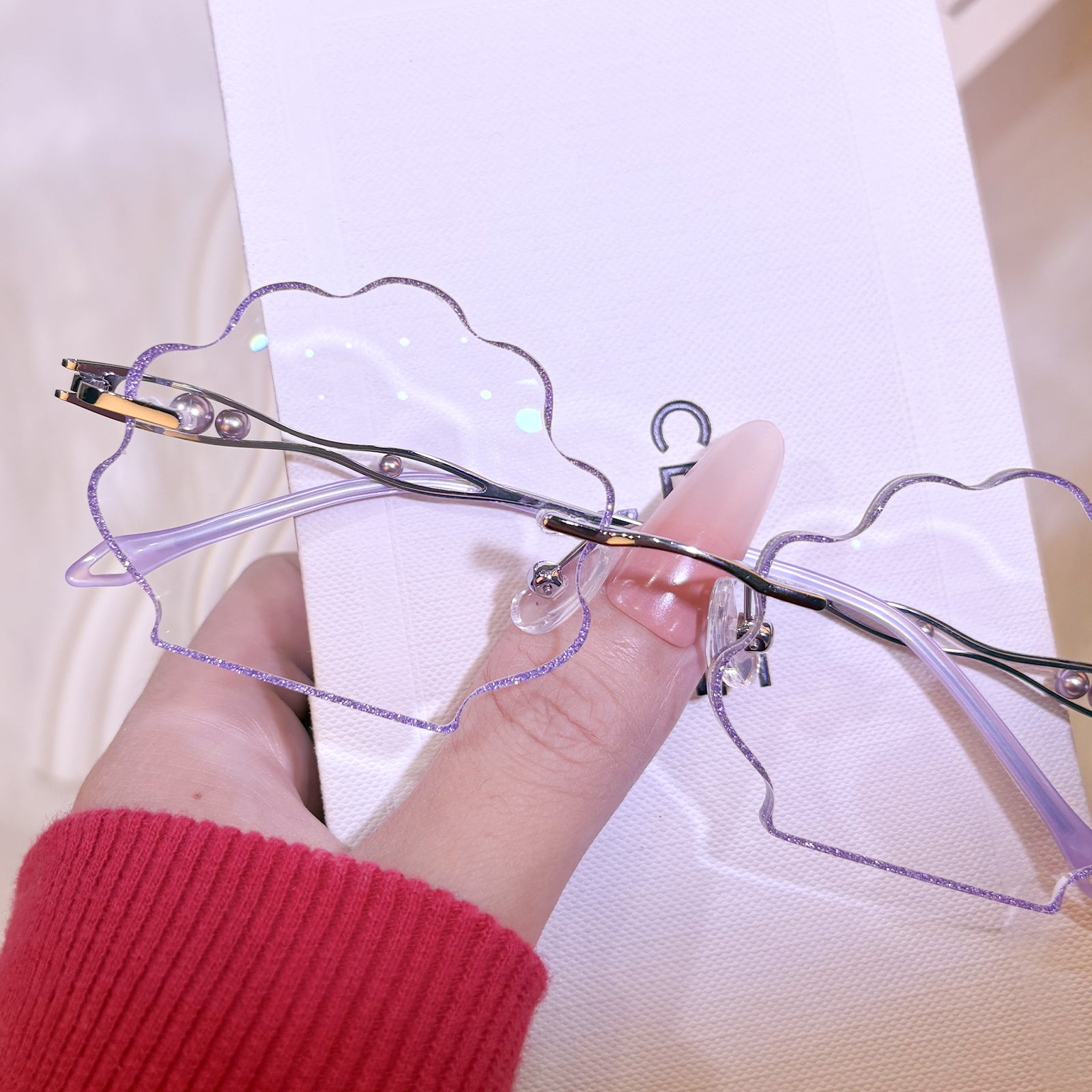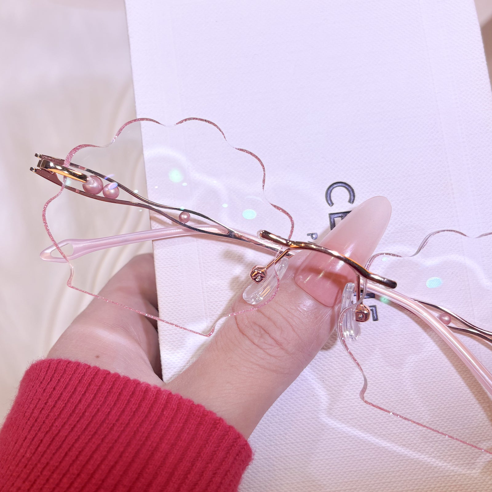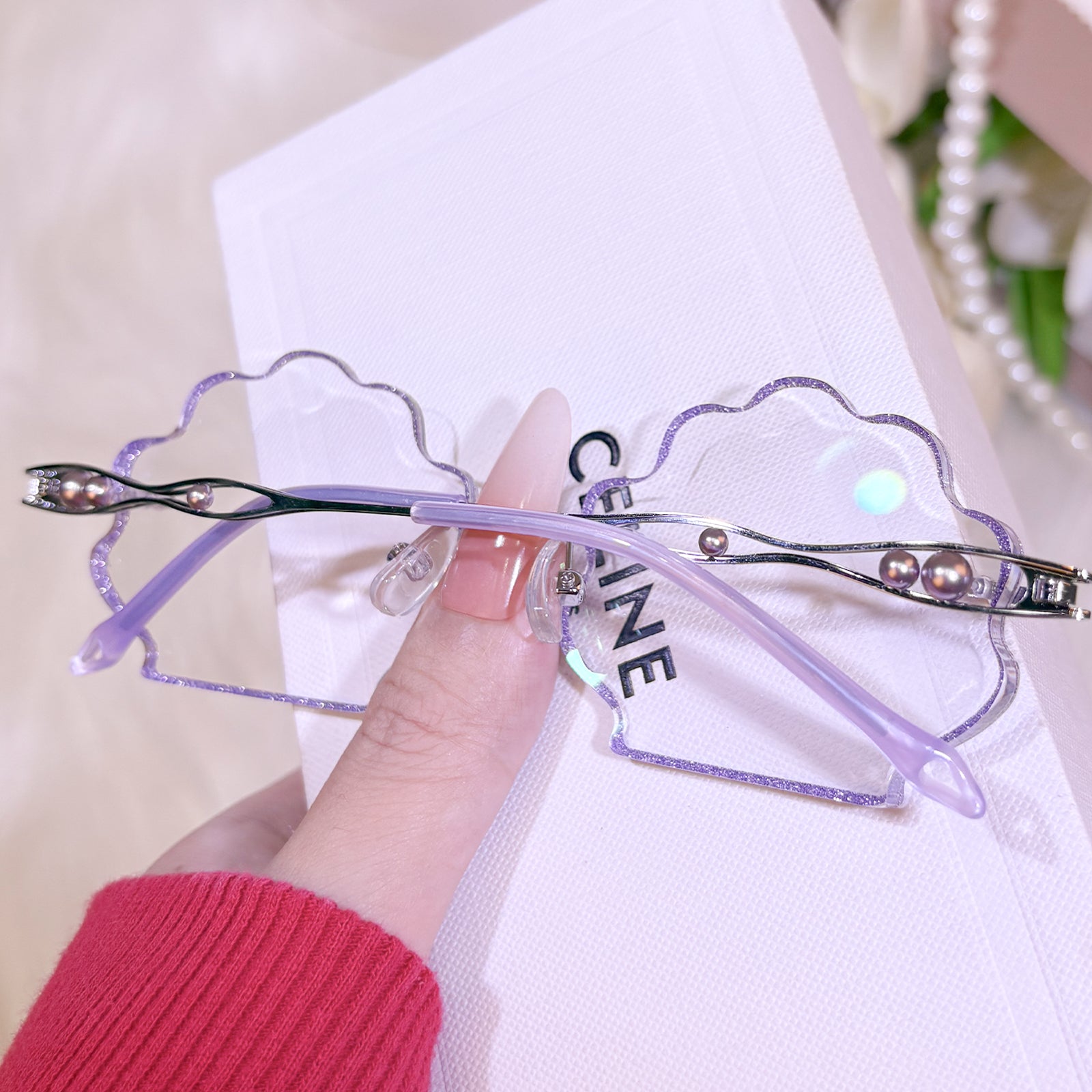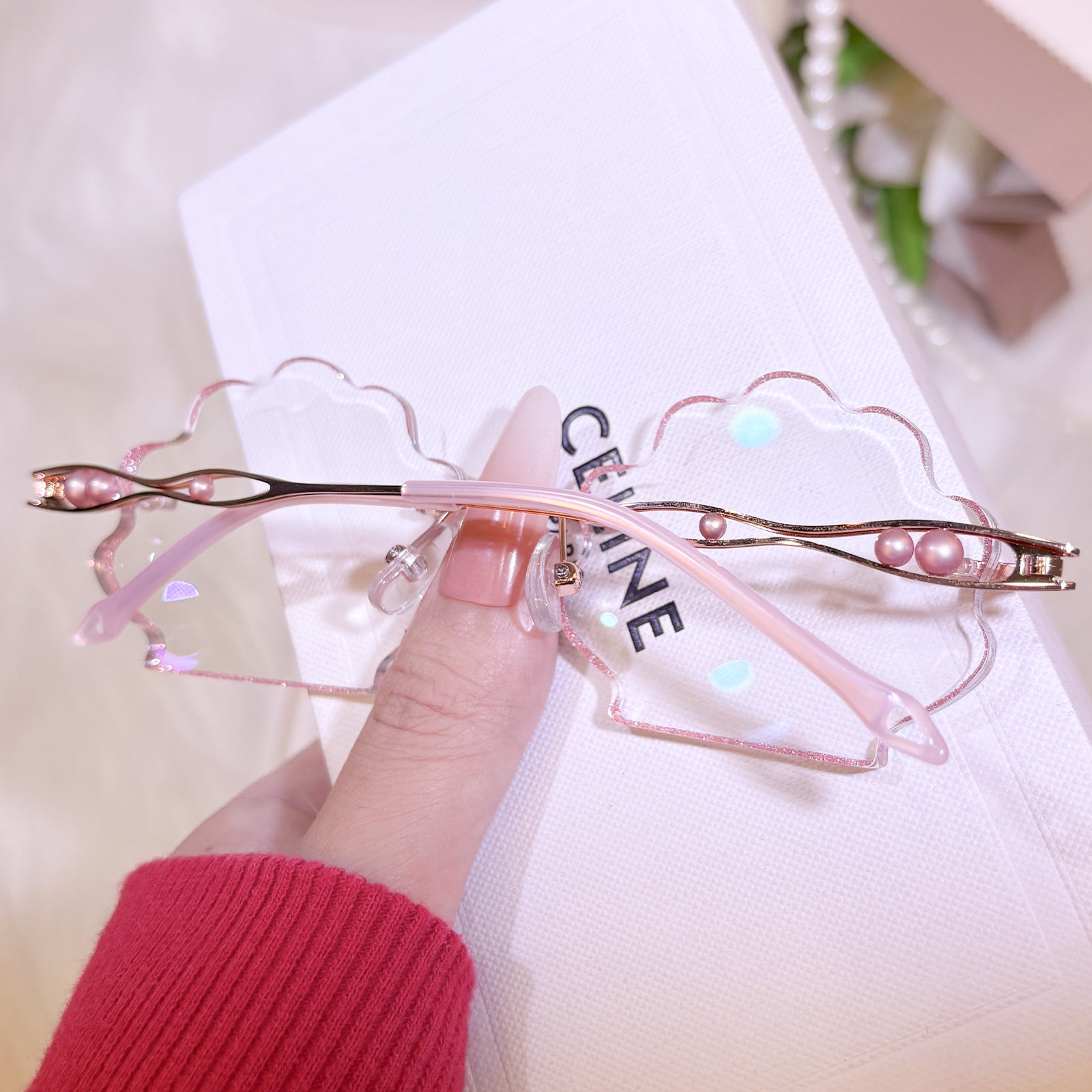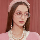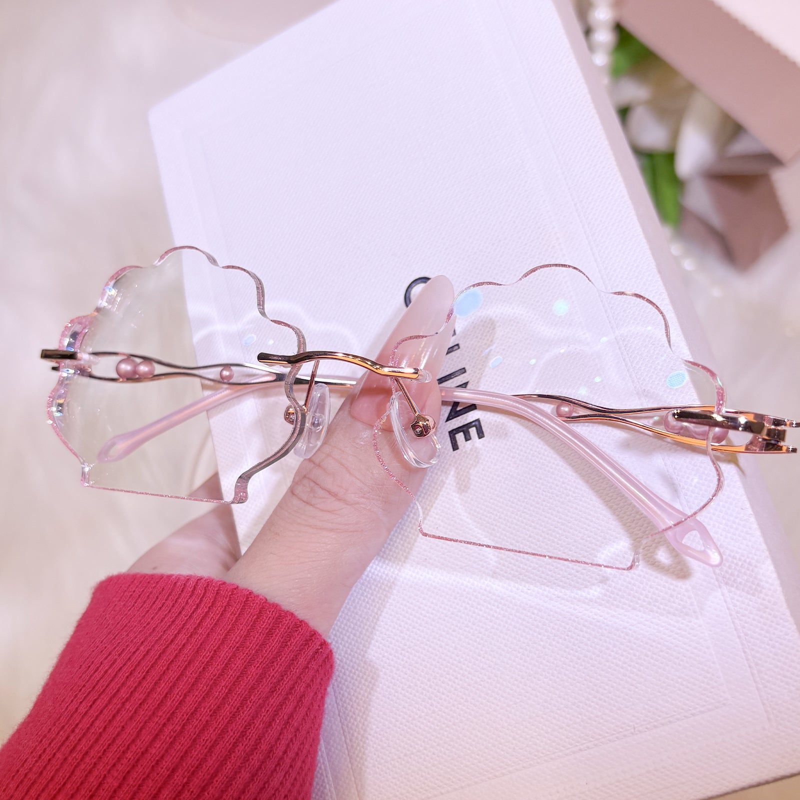 | Exclusive Design | This seashell-shaped rimless eyewear captures the magic of the deep sea, with shimmering glitter tracing the edges of the lenses and delicate pearls adorning the temples. Lively, elegant, and beautifully ocean-inspired, it looks just like a sparkling shell lifted straight from underwater treasure.