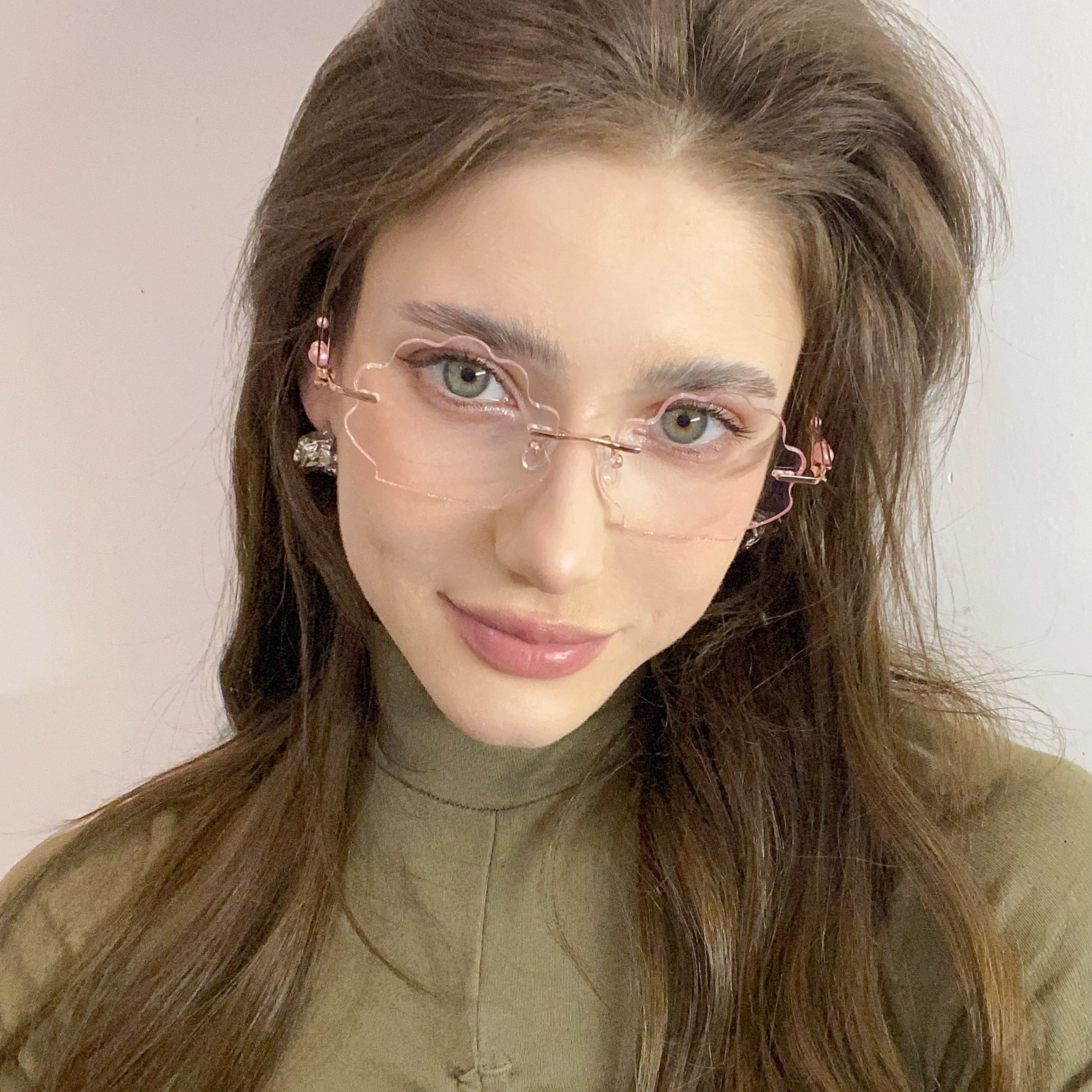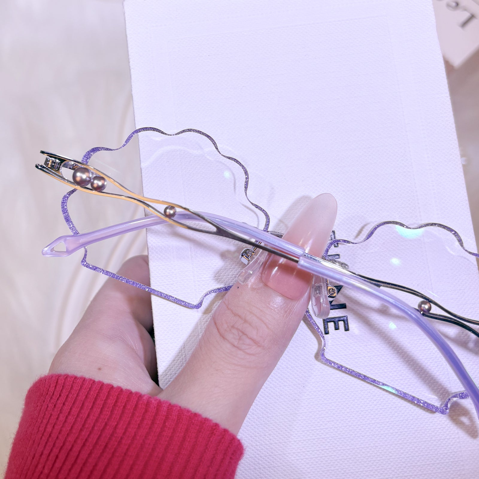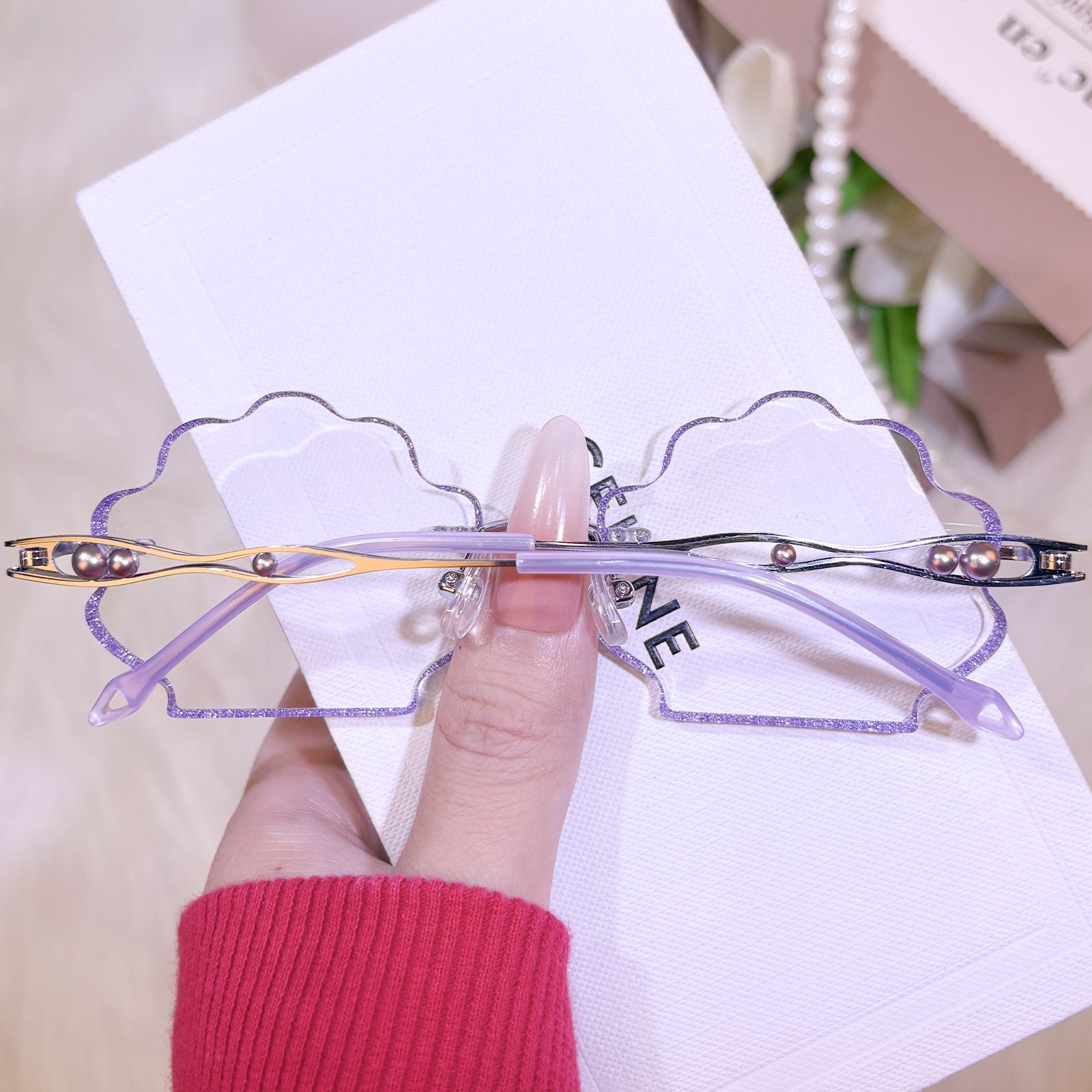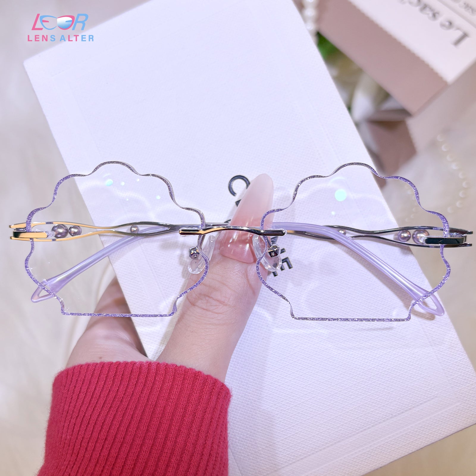 | Exclusive Design | This seashell-shaped rimless eyewear captures the magic of the deep sea, with shimmering glitter tracing the edges of the lenses and delicate pearls adorning the temples. Lively, elegant, and beautifully ocean-inspired, it looks just like a sparkling shell lifted straight from underwater treasure.
