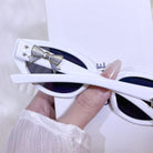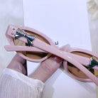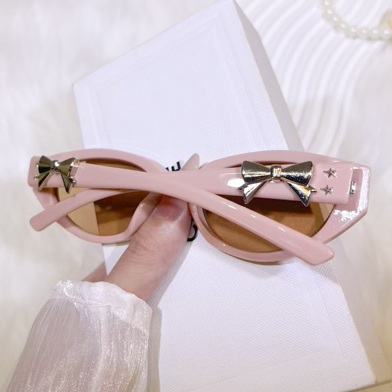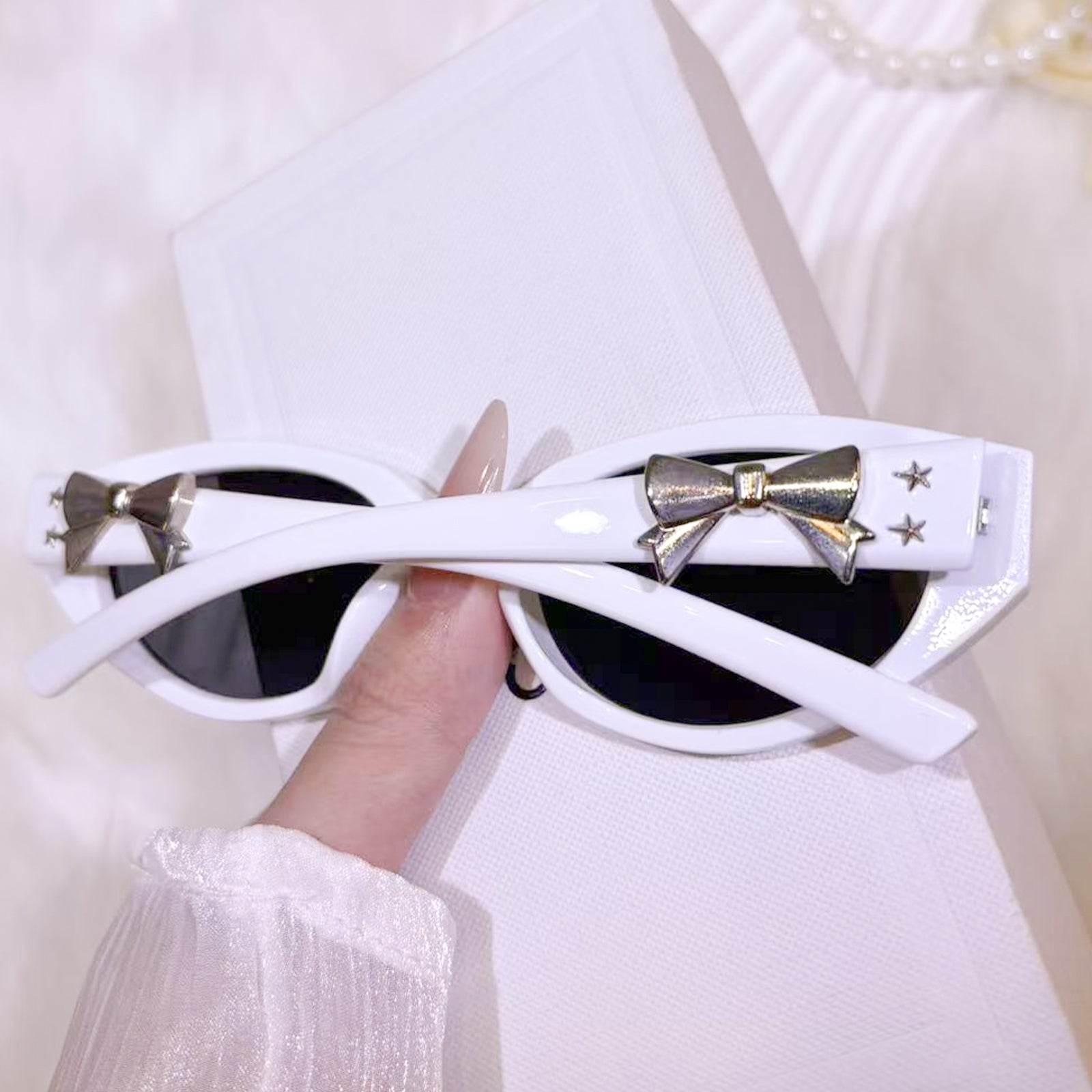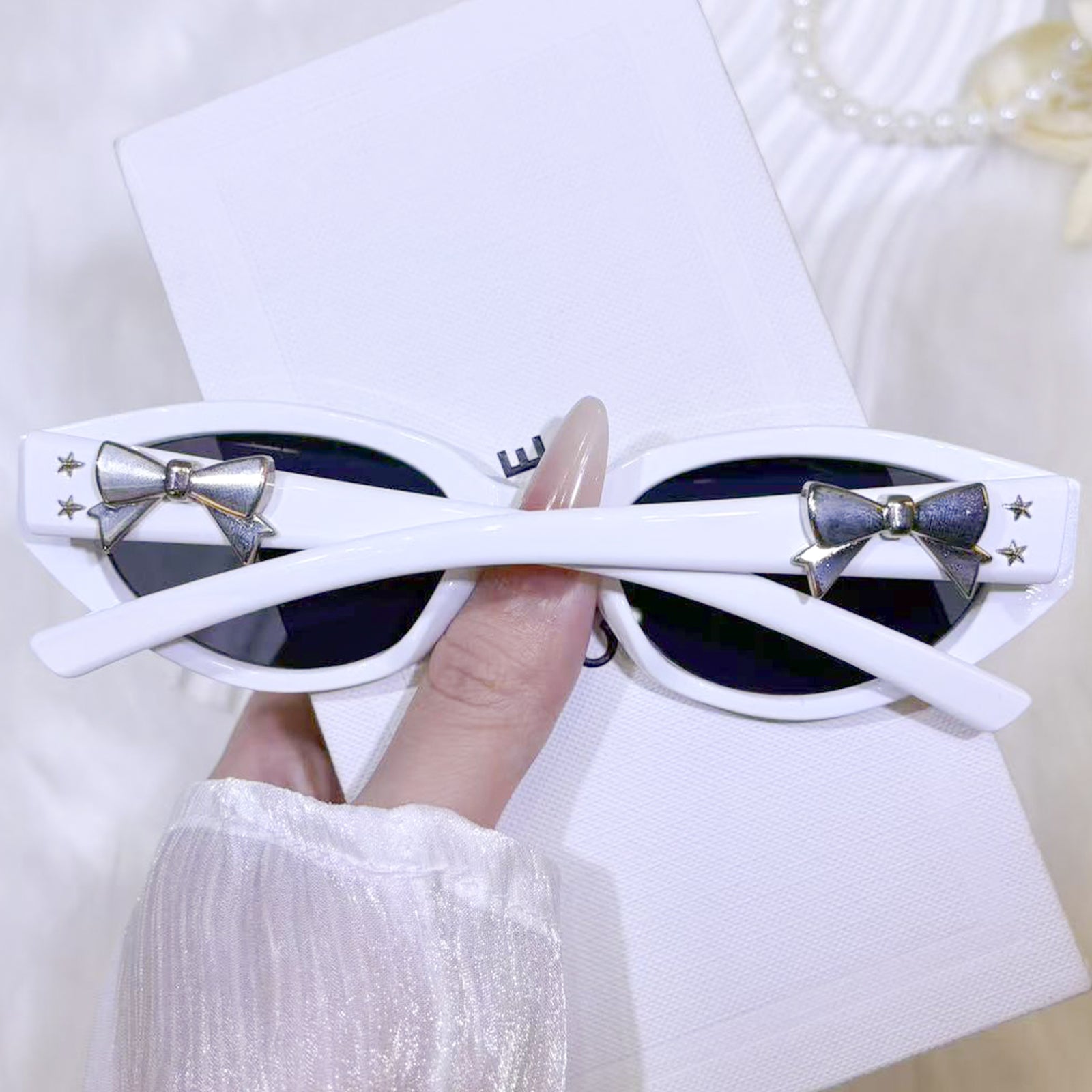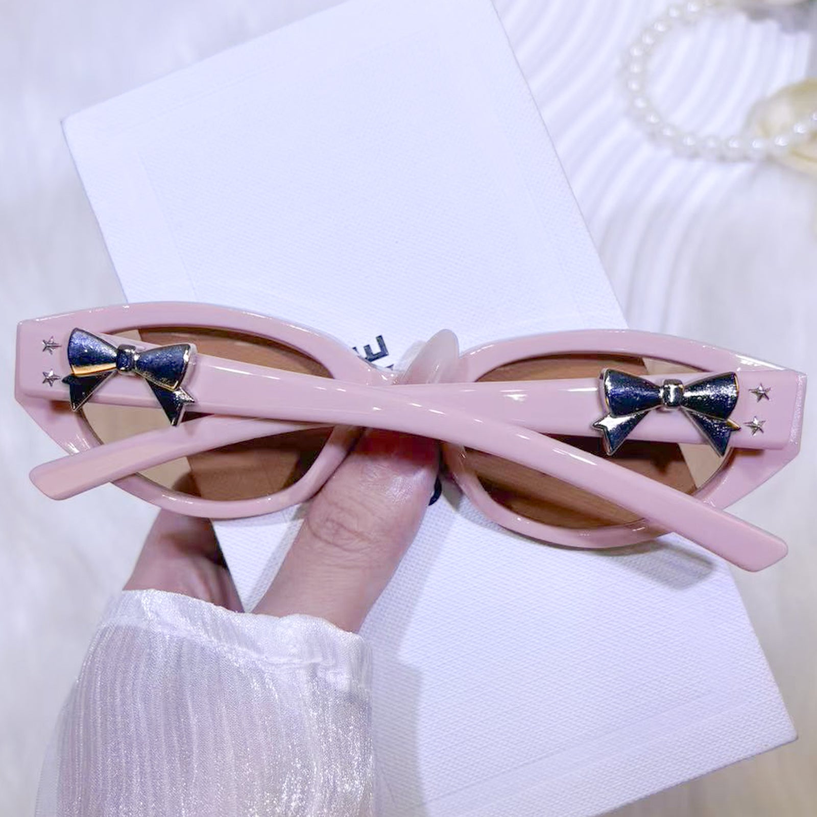 These trendy cat-eye sunglasses feature a playful twist with adorable bow accents on the temples. Combining chic fashion with a touch of cuteness, they are the perfect accessory for women who love to stand out with both elegance and charm.